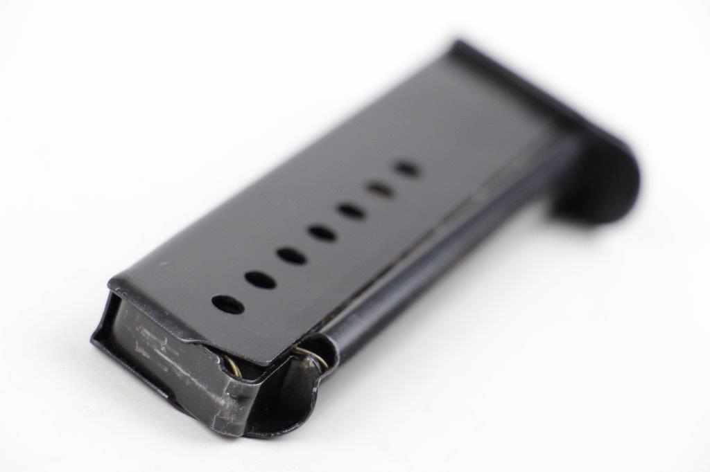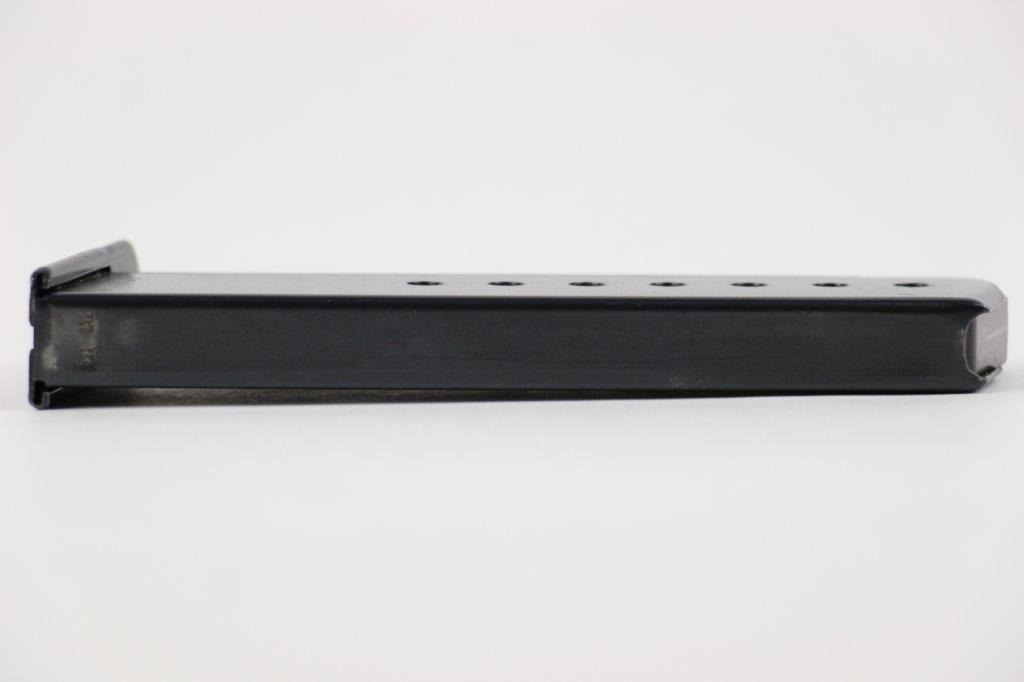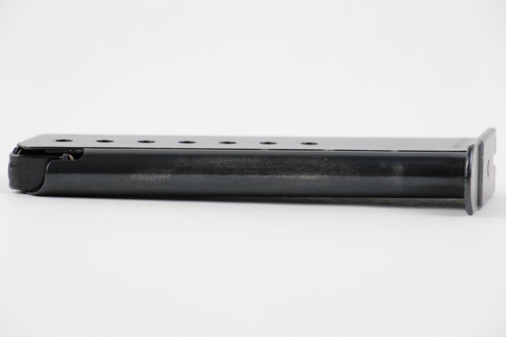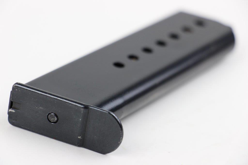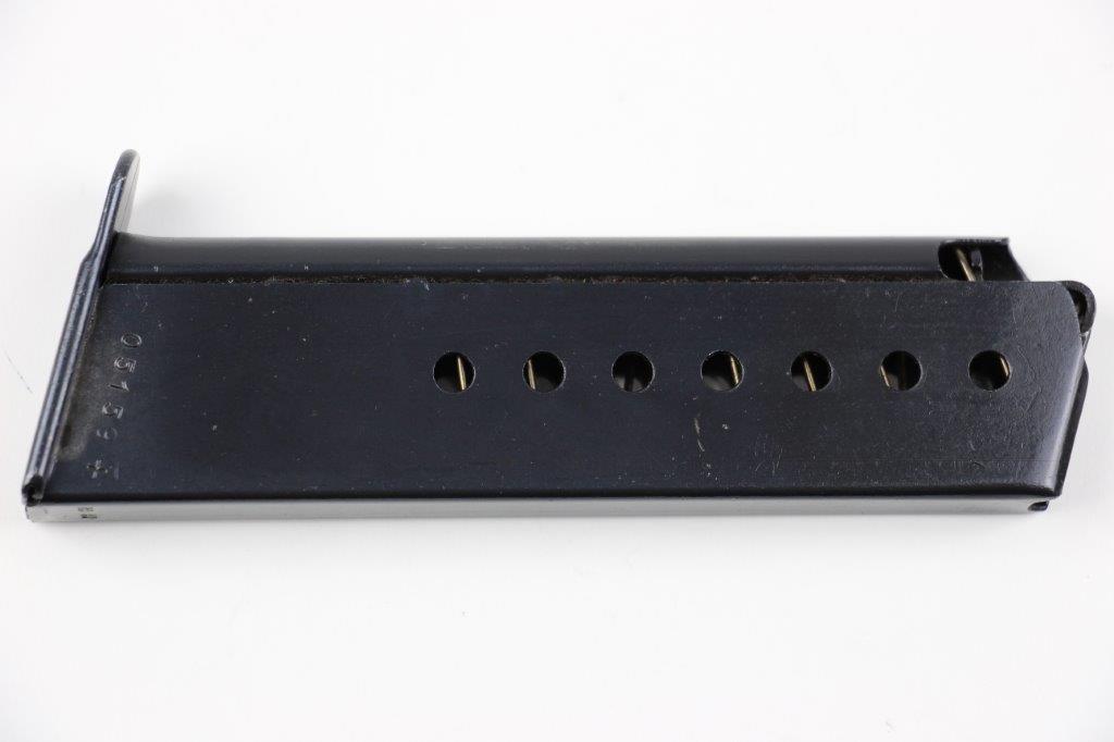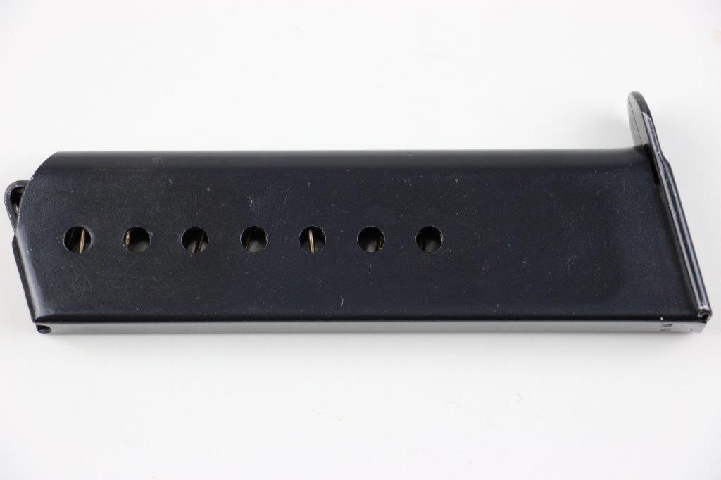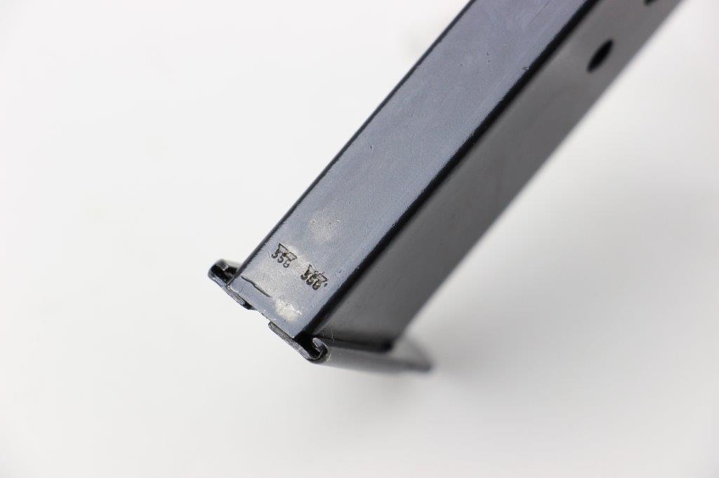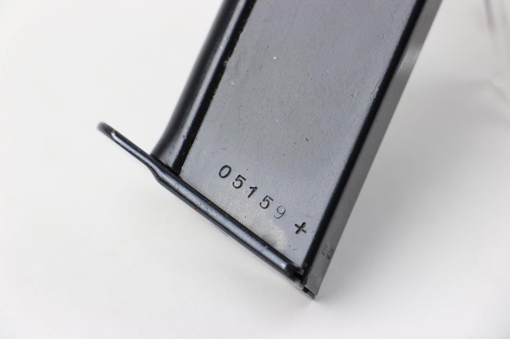 10/15/24 – This is an excellent condition, early Walther P.38 magazine numbered for a zero series P.38 pistol. The magazine features a serial number stamped on the left side of the tube, “05159” followed by a “+” sign, meaning this was intended to be the spare magazine. The spine of the magazine also has two distinct eagle/359 military proof stamps. These stamps are side-by-side on the base of the spine, which is unique to early zero series variation magazines. The magazine has excellent original blued finish throughout the tube and baseplate. The follower shows light use wear, but overall this is a near-mint example. Strong and fully functional spring.
