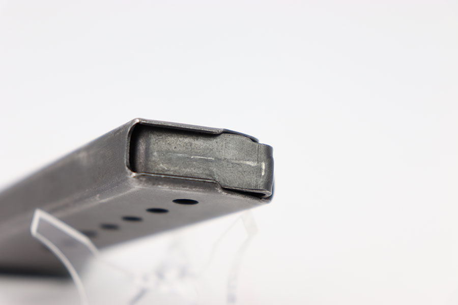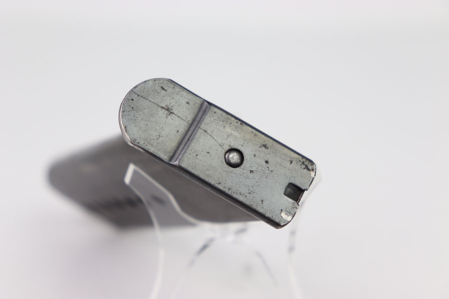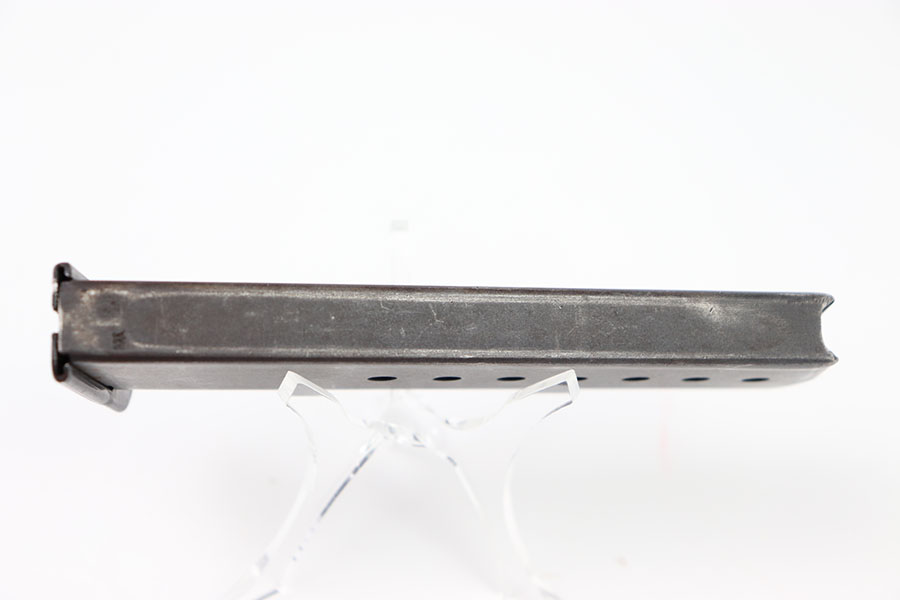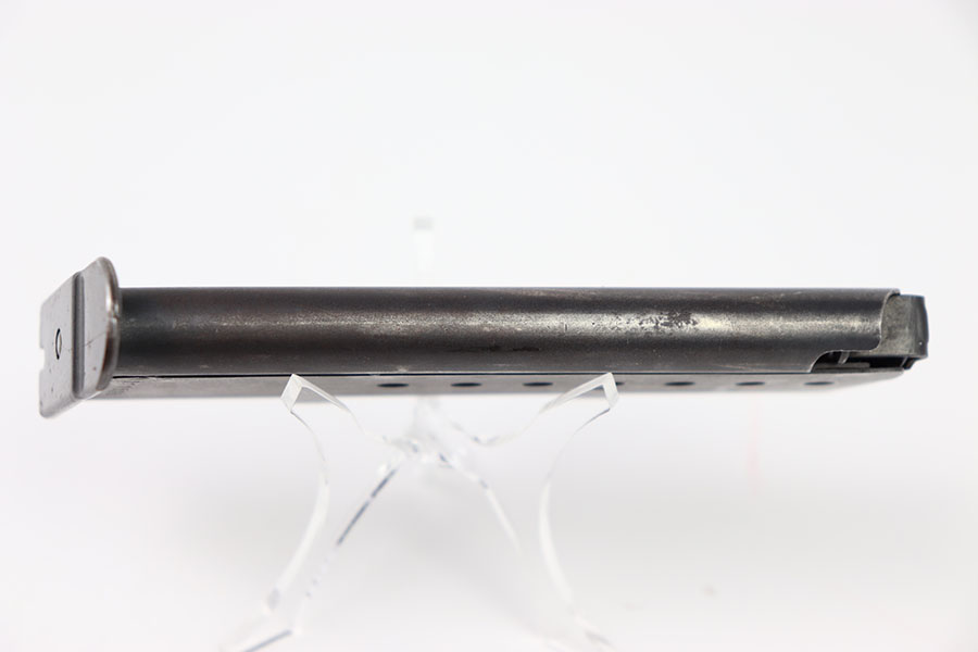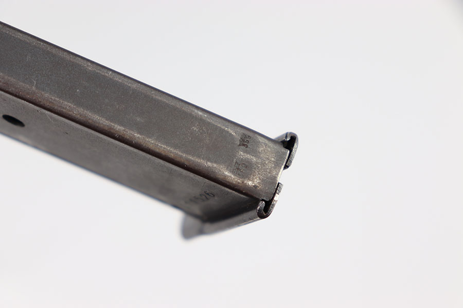 2/6/24 – This is a great example of a Zero Series Walther P.38 magazine. The magazine has about 90% of its original dull bluing remaining with most of its wear on the front rounded edge of the tube and the edges on the top half of the magazine. The left side of the magazine is numbered 011526. There are two “Eagle 359” proofs at the base of the spine. The bottom of the magazine has a high polish bluing with minor pin pricking. The spring is strong and fully functional.