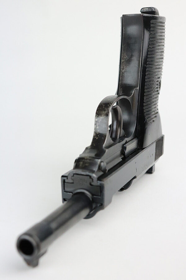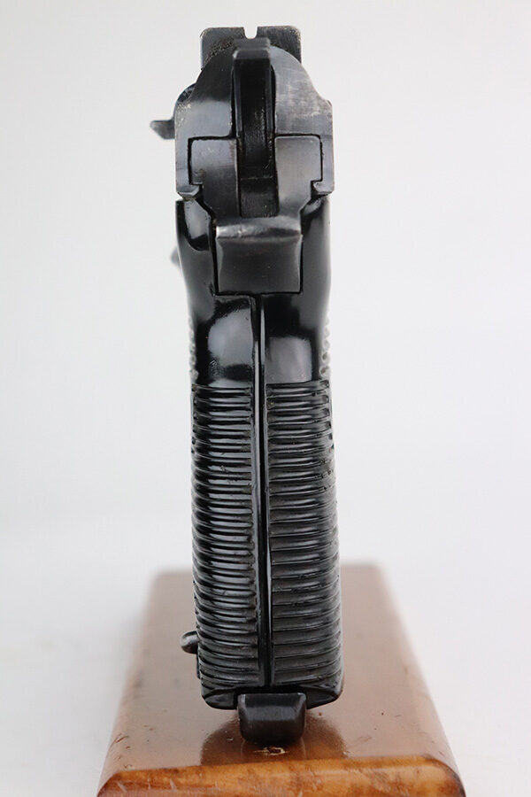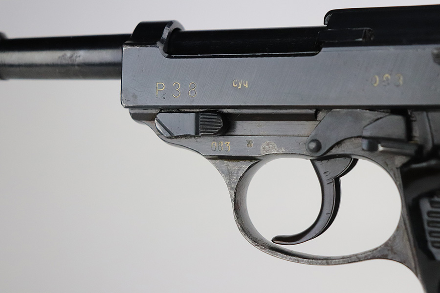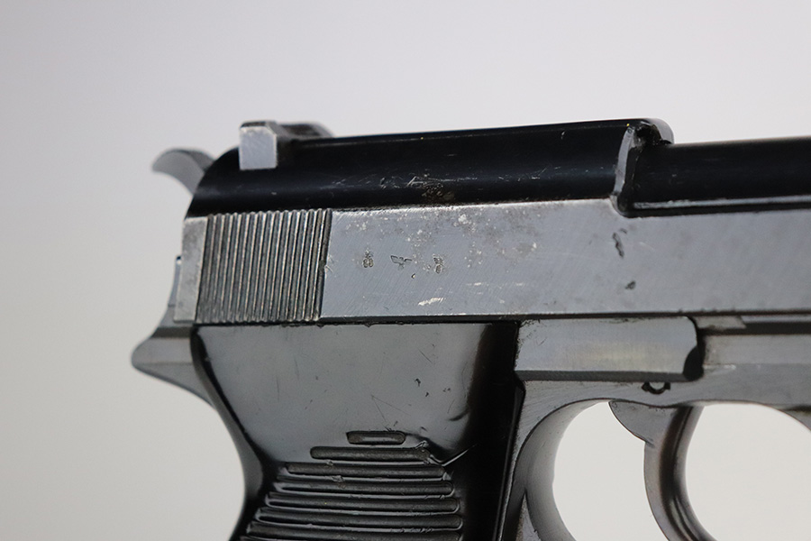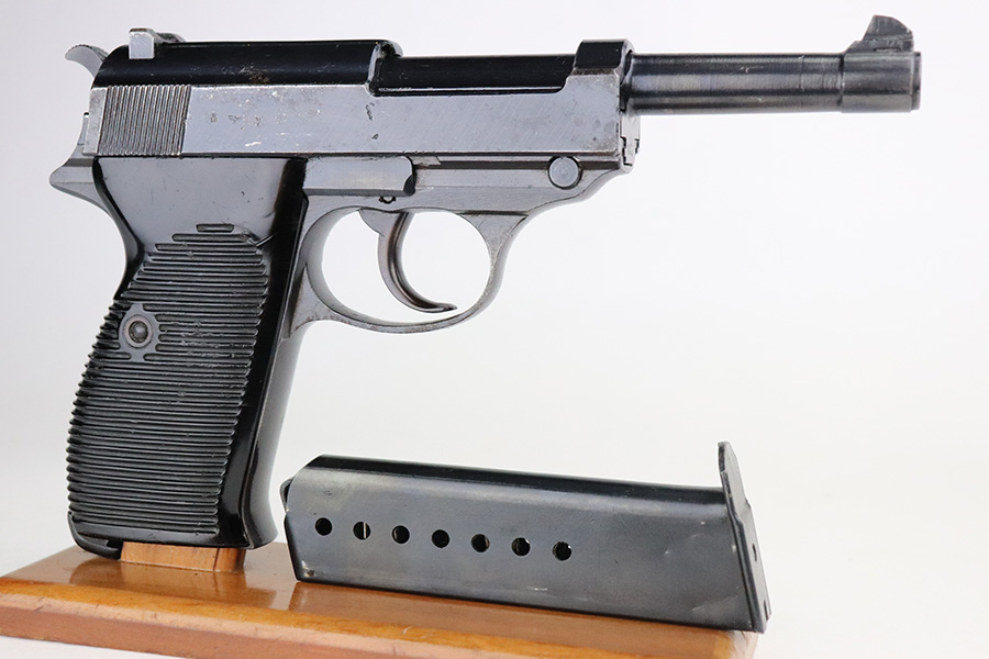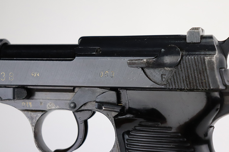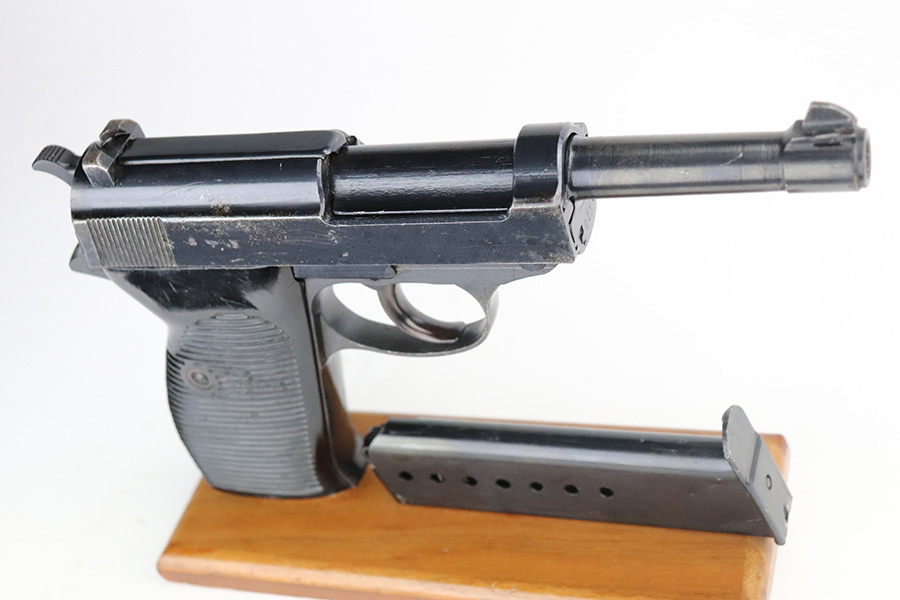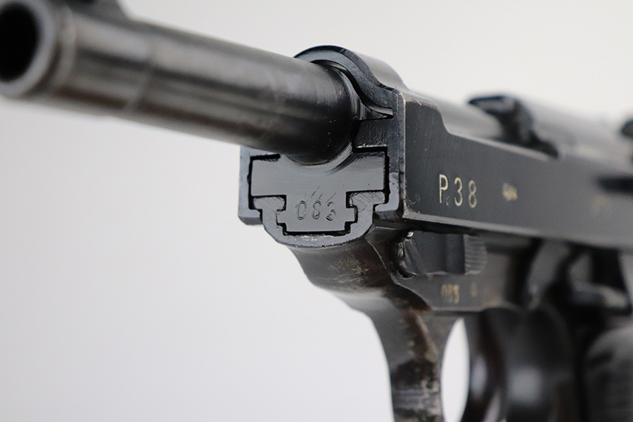 7/16/21 – This is a nice example of a very late-war Spreewerk P.38 issued to the Nazi military in 1945. This one is a “Zero Series” P.38 with a “0” prefix in the serial number, made at the very end of the war. This one has a very early Zero Series serial number, within the first 100 made. It has retained about 92-93% of its finish. There is very splotchy discoloration and oxidation on the whole underside of the frame and front strap, an area on the barrel, and areas on the right side of the slide. Comes with nice period-correct grips that have small handling marks and scratches throughout. Period-correct Mauser magazine. Minty bore. De-cocker is not functional.