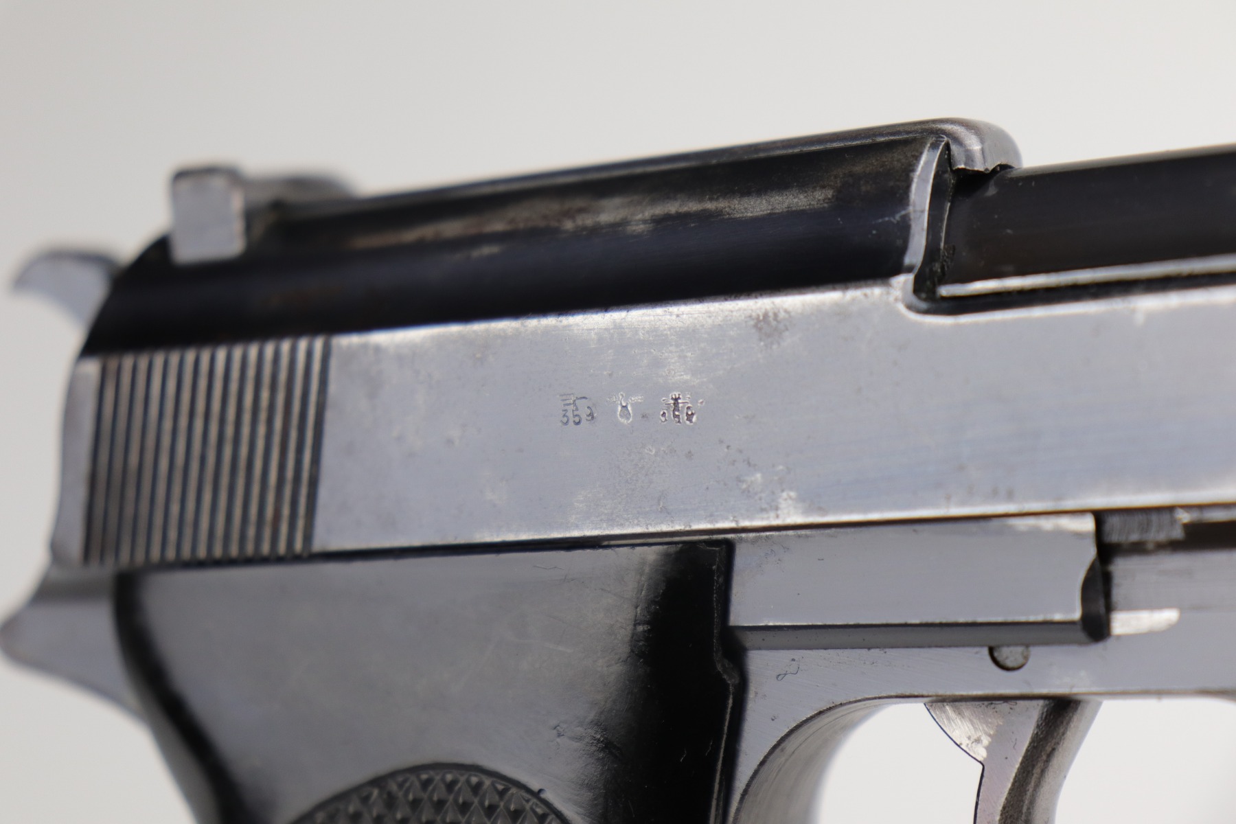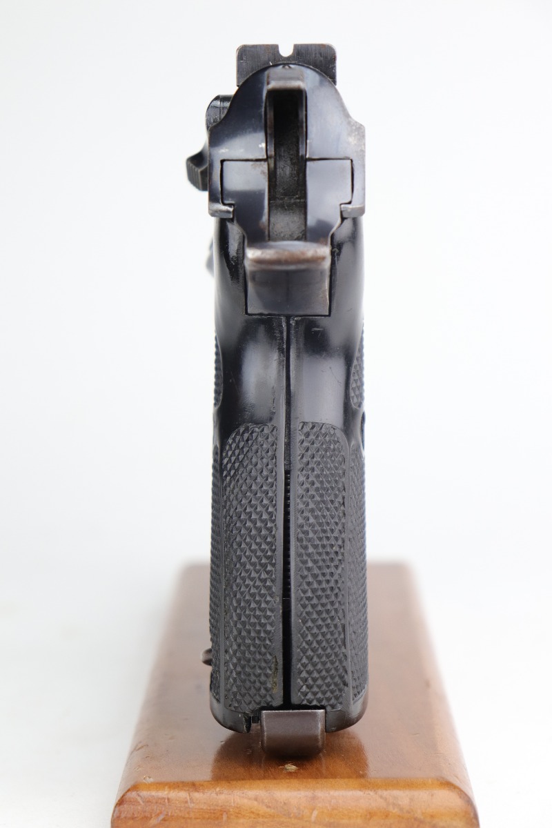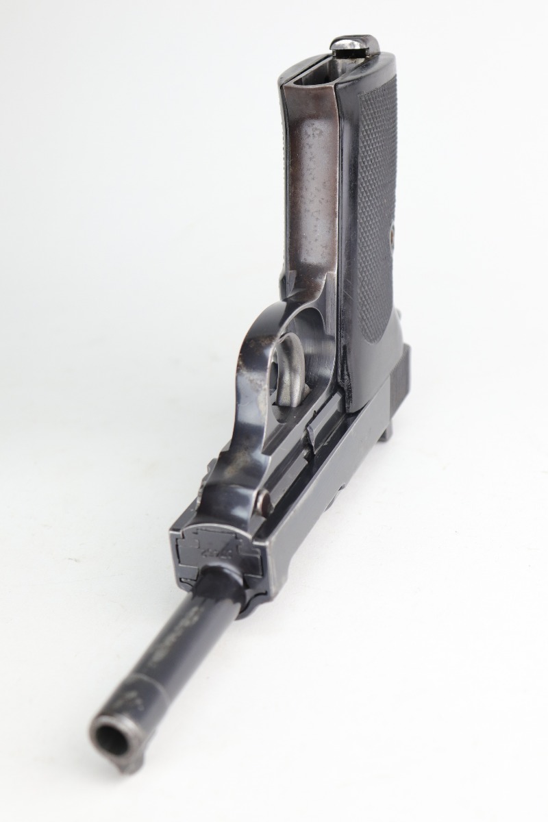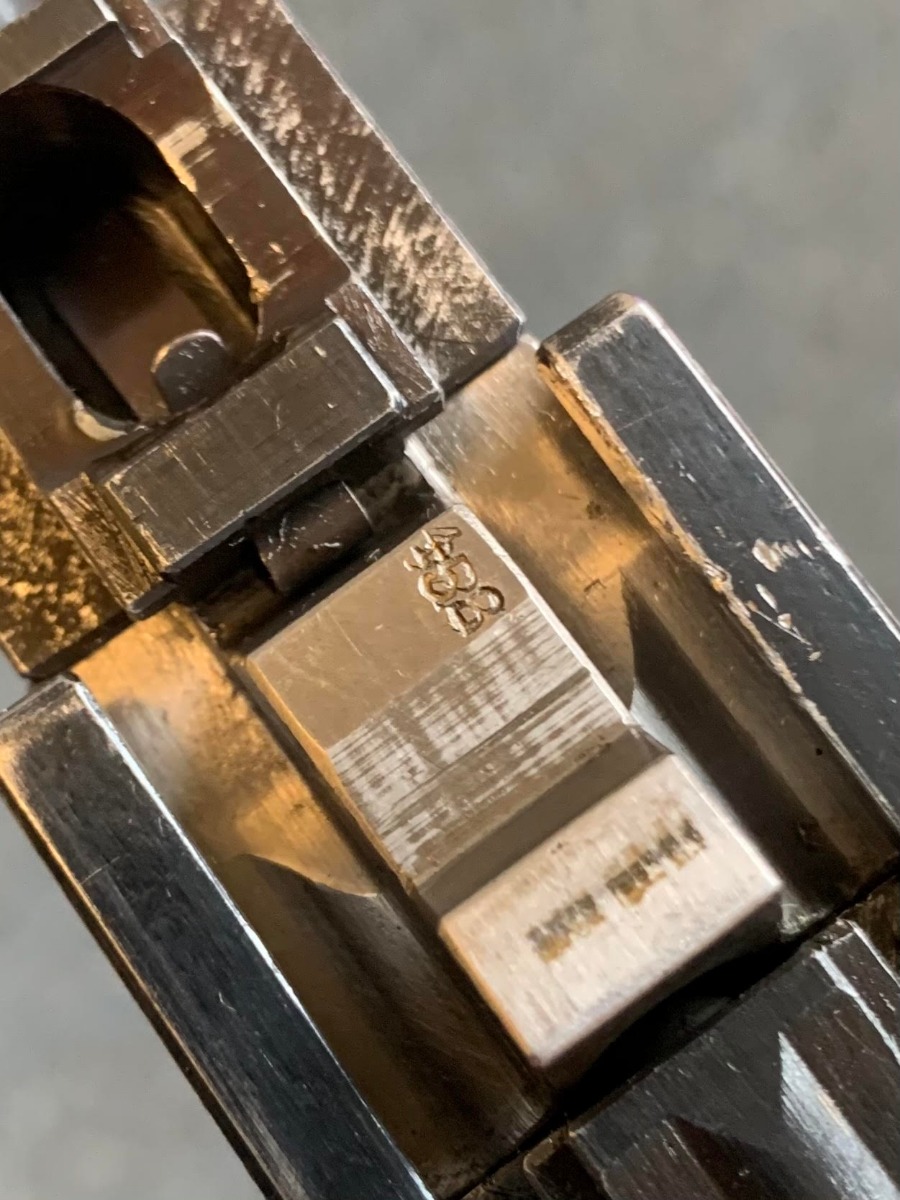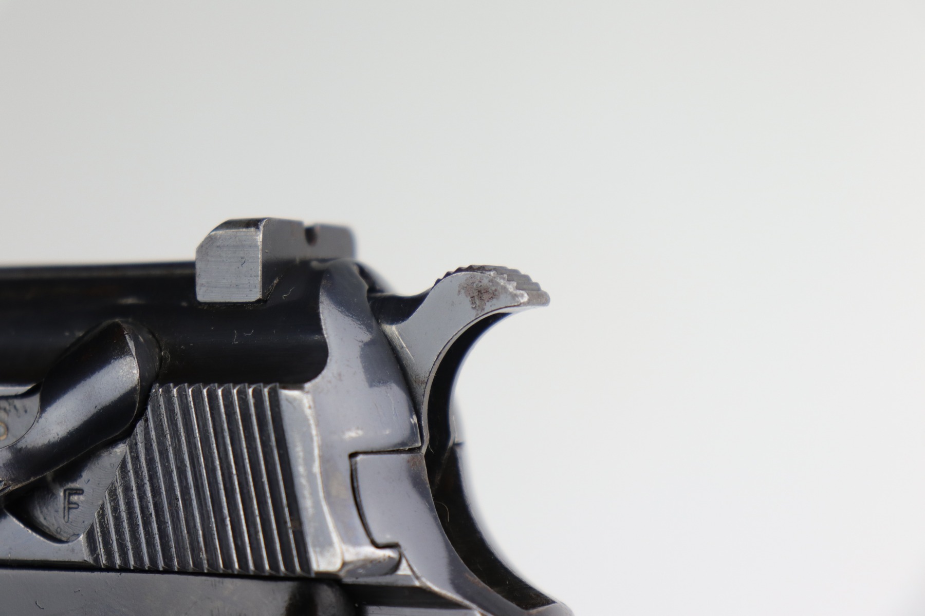 1/4/21 – This is a nice example of an early “Zero Series” Walther P.38 issued to the Nazi military in 1940. This one is all matching and has the proper “Eagle 359” Nazi military proofs. The locking block is matching but looks like it may have been re-numbered (see photo). It has retained roughly 75% of its original bluing. There is spotty wear around the muzzle and on the sides and top of the slide. There is thinning and patina on the front strap. Also some wear on the underside of the frame and trigger guard. Areas of spotty oxidation here and there. It comes with nice un-numbered correct grips and an original matching magazine. The grips don’t quite fit perfectly, so there is a gap in the spine. The bore has good rifling, but there is minor pitting throughout. De-cocker is fully functional.