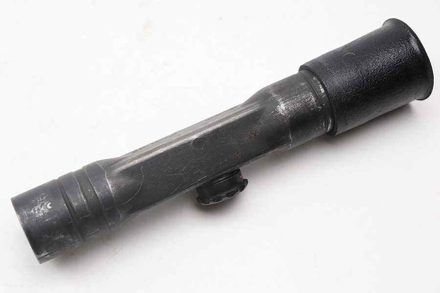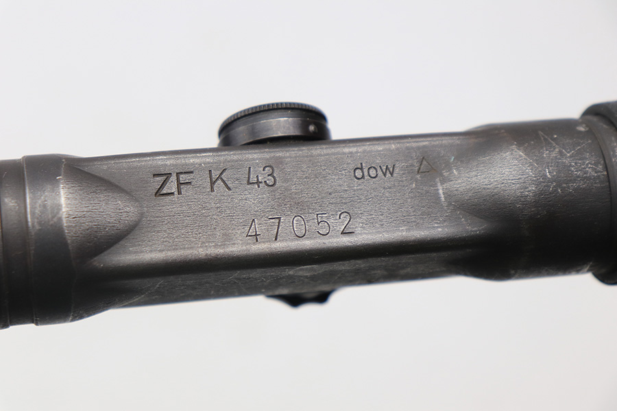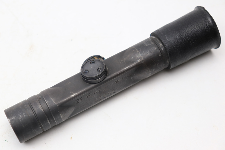 4/4/22 – This is an original WW2 German Rifle scope for a G43 or K43 rifle. The scope is marked “ZF K 43 , dow , 47052” on one side. The dull blued finish is thinning throughout with normal signs of aging but no excessive wear, rust, or pitting. The adjustment knobs are still functional. The optics are clear with a crisp reticle, but some mild cloudiness throughout (about 80% clarity). Comes with an attached rubber eye cup, but we doubt this is period correct.