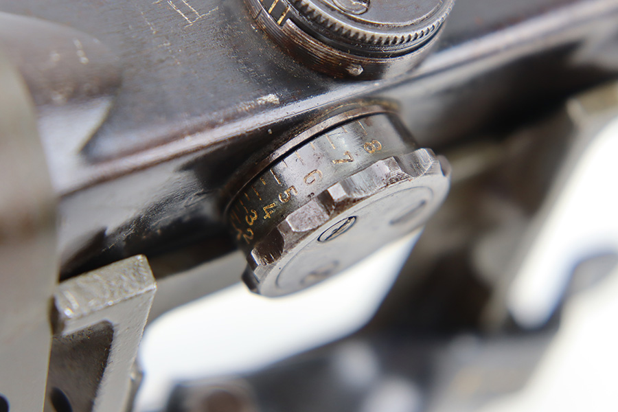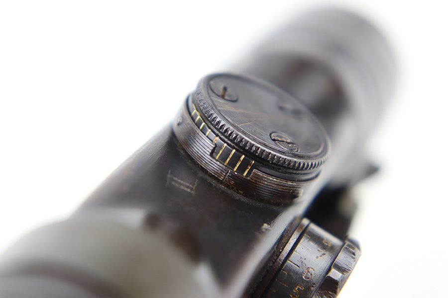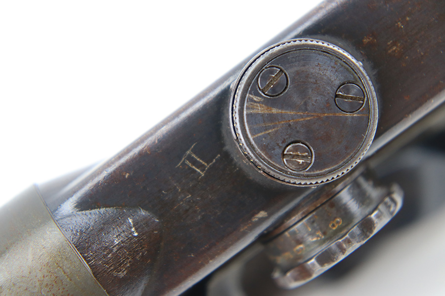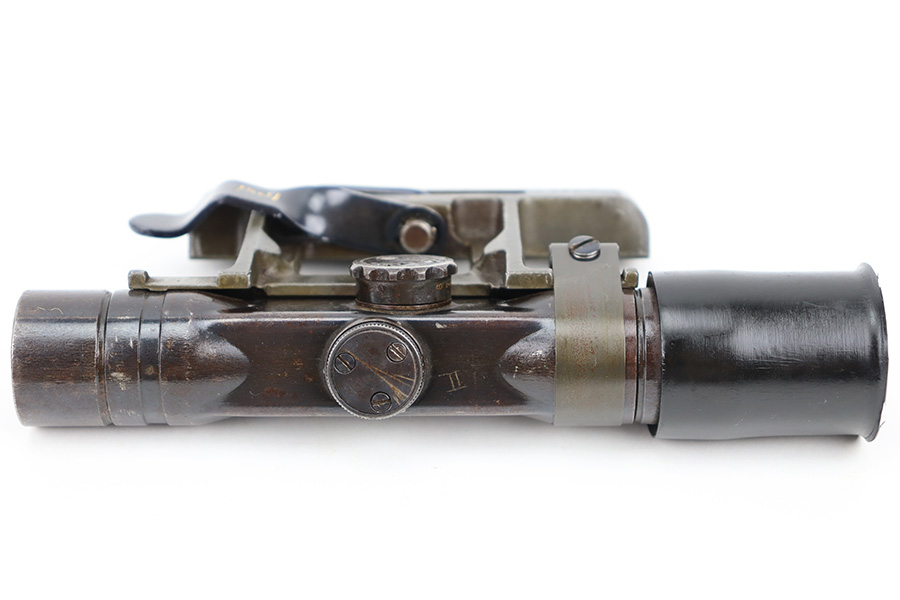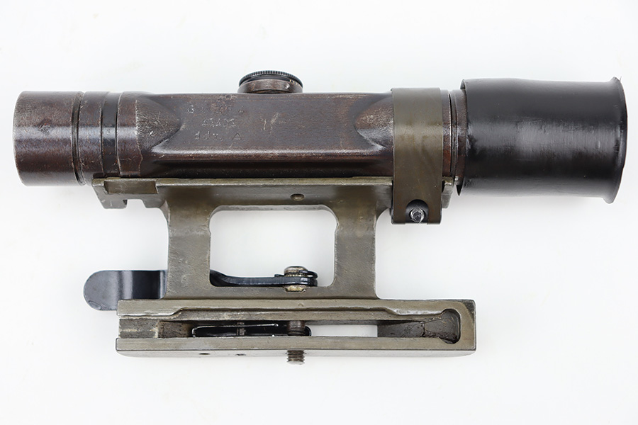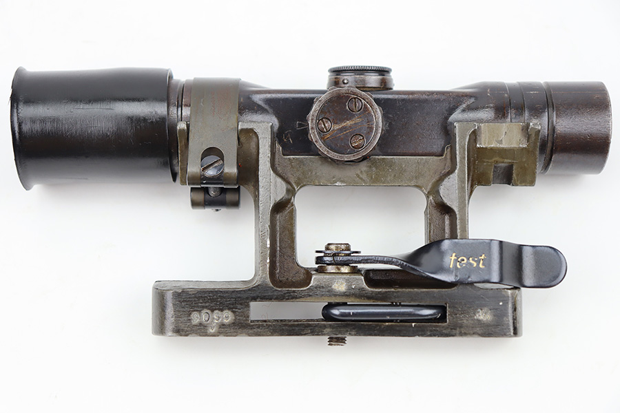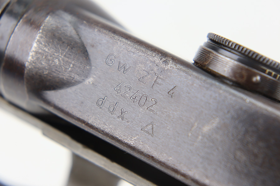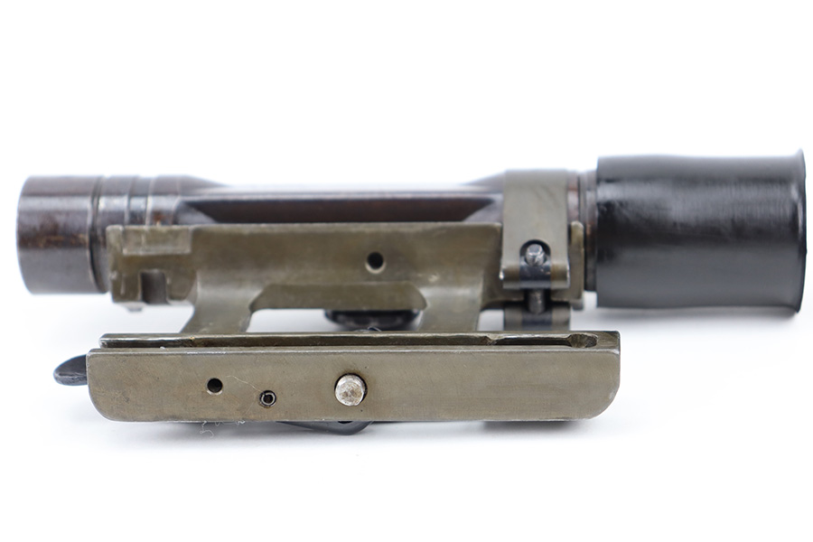 11/29/23 – This is an original WW2 German ZF 4 rifle scope with a reproduction mount. The mount is made to look like an original, and is proof stamped with a few small eagle/359 Walther military proof stamps. The base is also serial numbered 9099s. Functional and properly marked attach / quick release lever. The forward mount ring is missing, as shown in photos. The mount has a phosphate style finish, while the scope has a worn blued finish. The scope is all original and includes a rubber eye relief / sunshade over one end, although we believe this rubber looks too good to be true and is likely reproduction. The scope is marked “Gw ZF 4 , 42402 , ddx.” with a triangle logo. There’s dark brown patina and natural aging throughout the exterior of the scope, and the adjustment knobs are missing the metal cover plates. The adjustment knobs are fully functional however, and the optics are clean. There’s a trace of cloudiness but the reticle is crisp and visibility is good.
