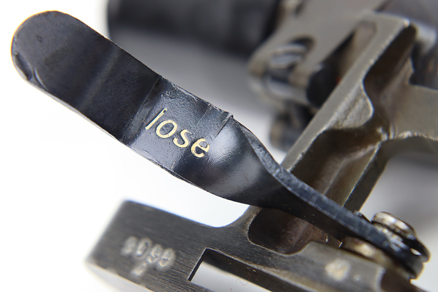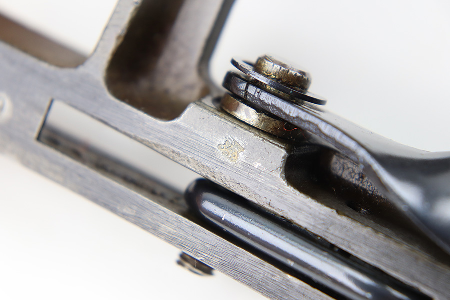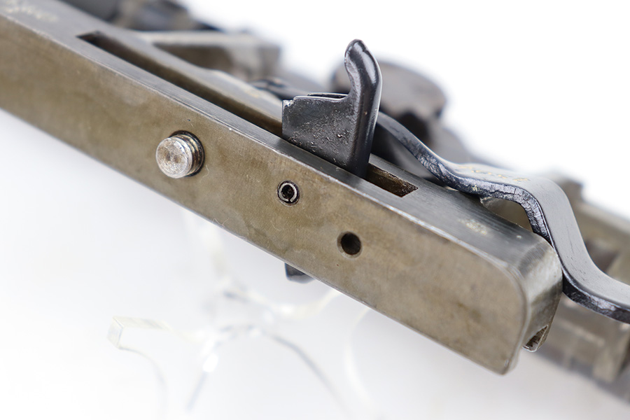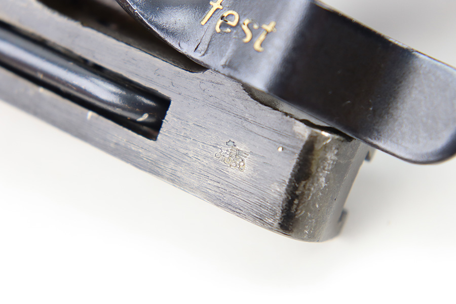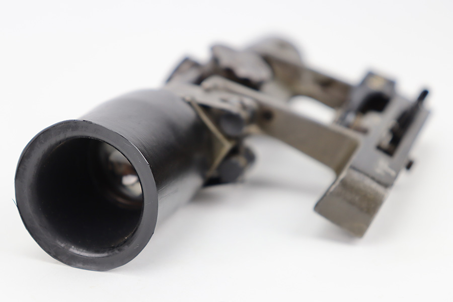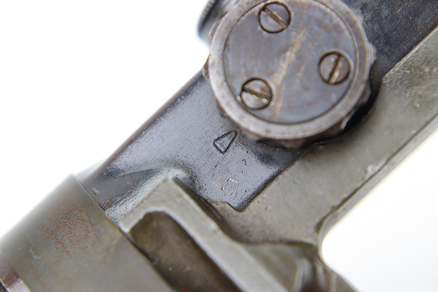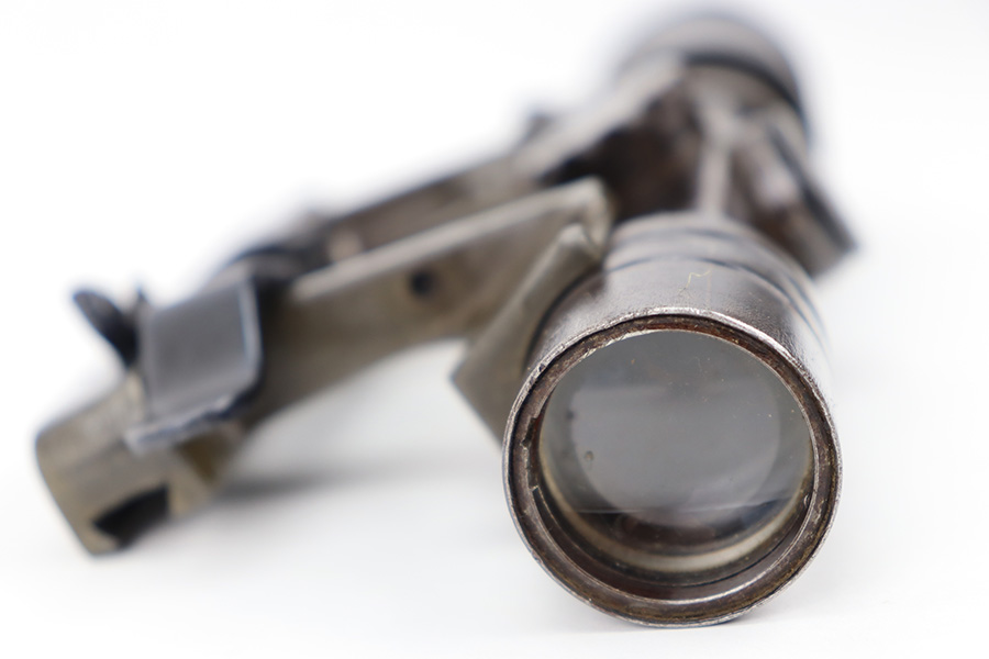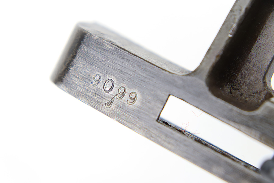 11/29/23 – This is an original WW2 German ZF 4 rifle scope with a reproduction mount. The mount is made to look like an original, and is proof stamped with a few small eagle/359 Walther military proof stamps. The base is also serial numbered 9099s. Functional and properly marked attach / quick release lever. The forward mount ring is missing, as shown in photos. The mount has a phosphate style finish, while the scope has a worn blued finish. The scope is all original and includes a rubber eye relief / sunshade over one end, although we believe this rubber looks too good to be true and is likely reproduction. The scope is marked “Gw ZF 4 , 42402 , ddx.” with a triangle logo. There’s dark brown patina and natural aging throughout the exterior of the scope, and the adjustment knobs are missing the metal cover plates. The adjustment knobs are fully functional however, and the optics are clean. There’s a trace of cloudiness but the reticle is crisp and visibility is good.