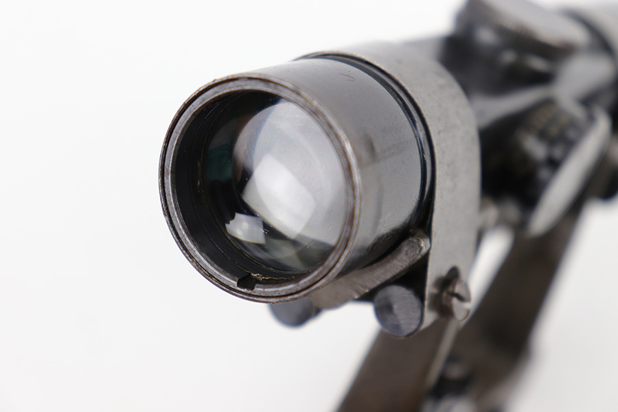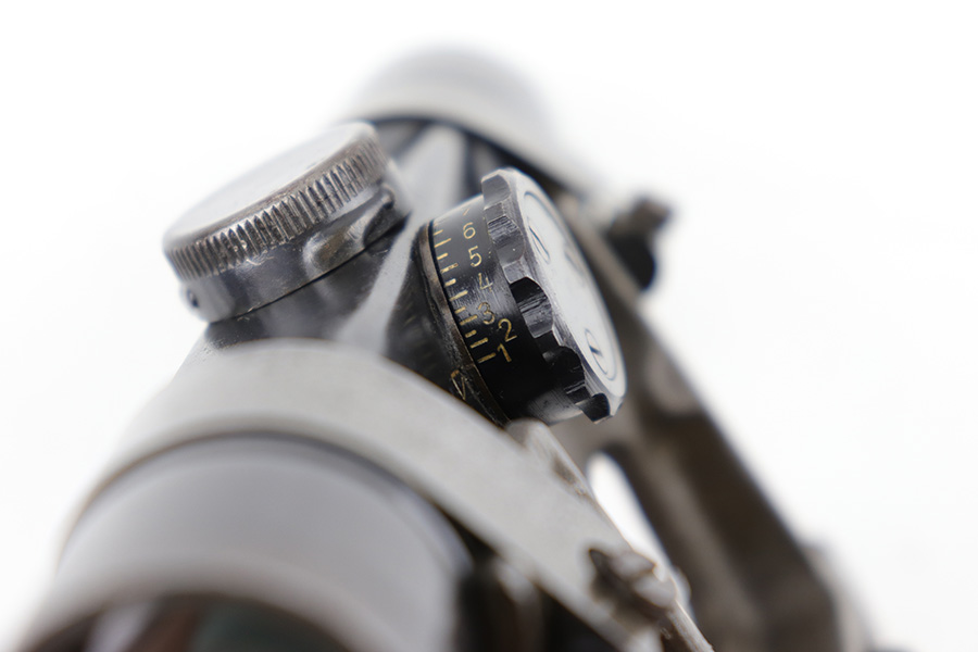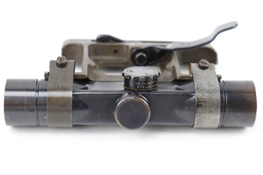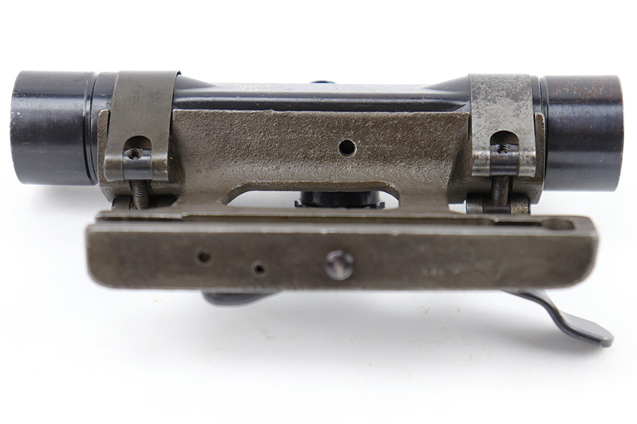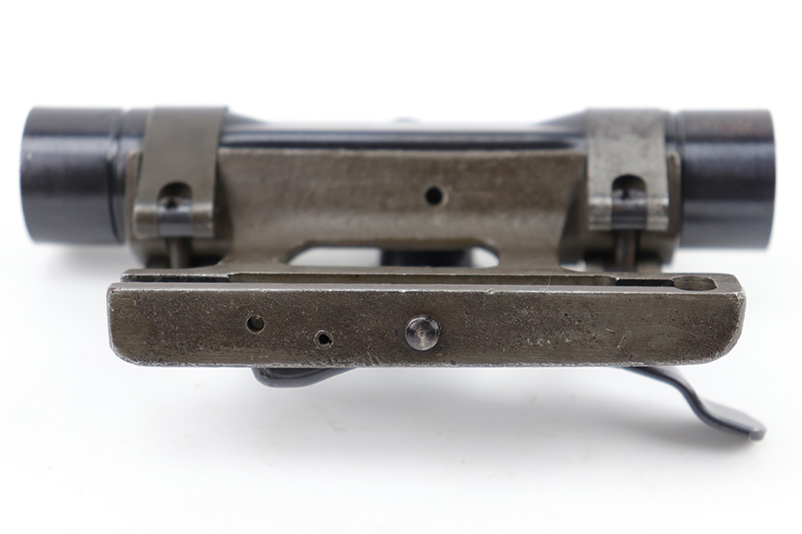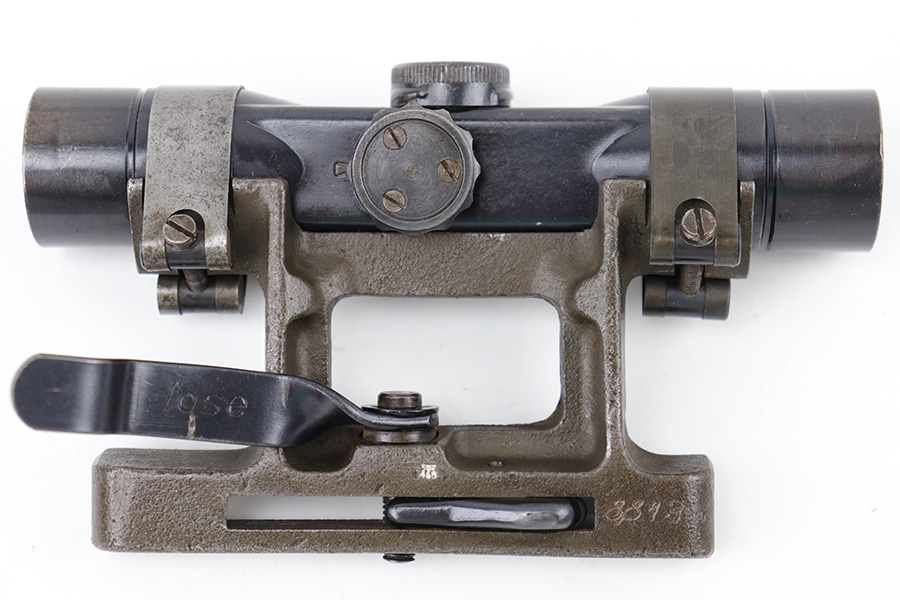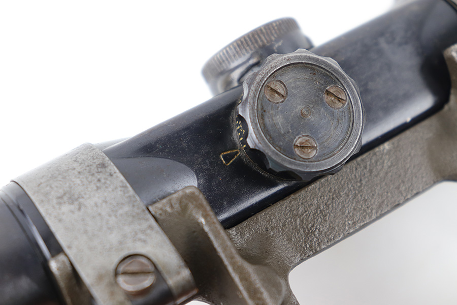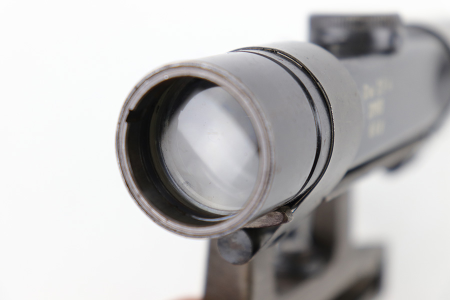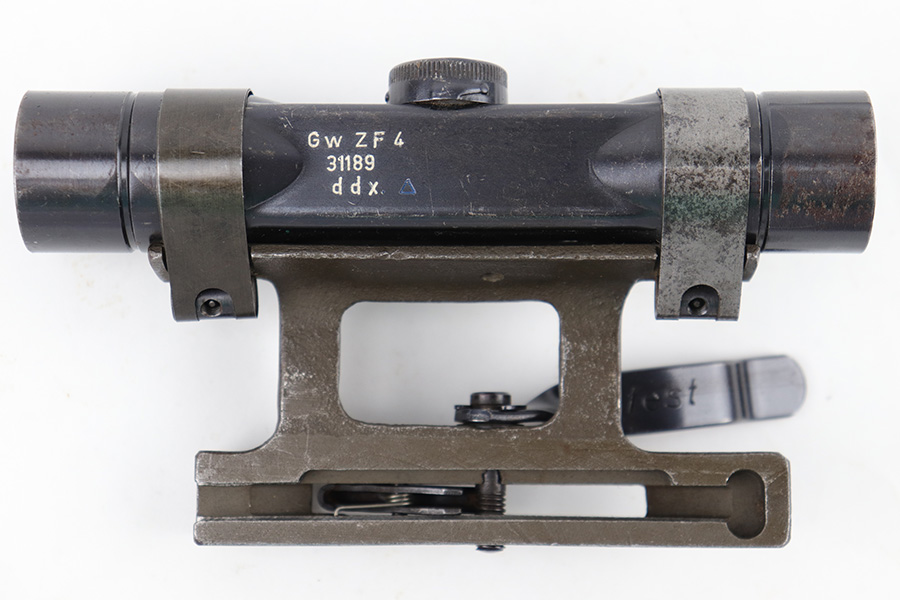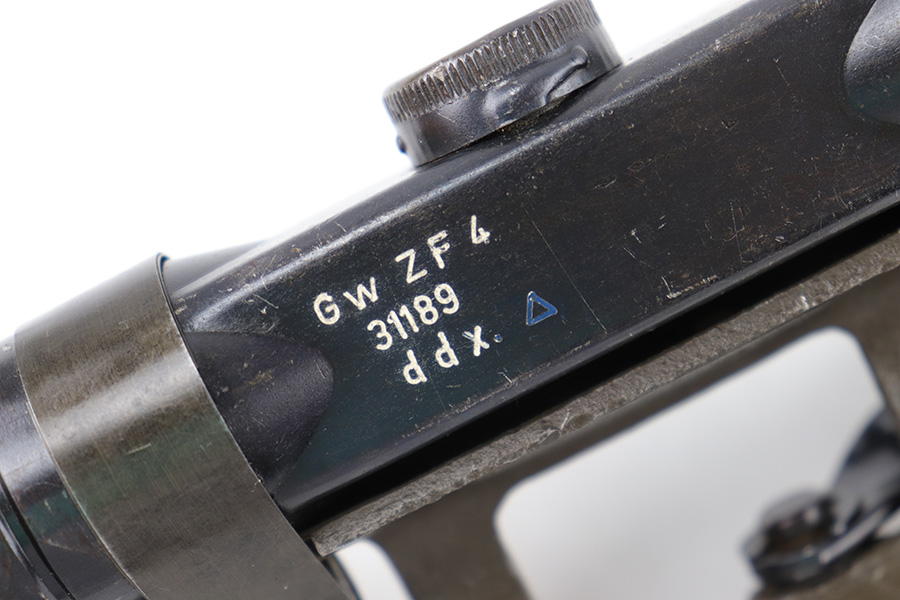 5/12/23 – This is an original WW2 production ZF 4 scope with a Walther military proofed mount. Everything on this grouping is original. The scope is in great condition with nice bluing throughout the exterior and clear optics internally. There is a very slight hint of some cloudiness and general age through the optic, but this is only about 5% overall, and is considered natural “honest” wear. The reticle is crisp and the adjustment knobs are tight and fully functional. The top adjustment knob for windage comes with an original metal cover as well. The left side of the scope exterior is maker code stamped “ddx” with a blue painted triangle, meaning this scope was treated for winter conditions, and was likely meant for the Eastern front. The scope mount rings have some mild patina and finish loss but are in good overall condition. The mount has a phosphate finish and is proof stamped with an eagle/359 military proof. There’s also an electro-penciled serial number 8813 on the mount, as shown.