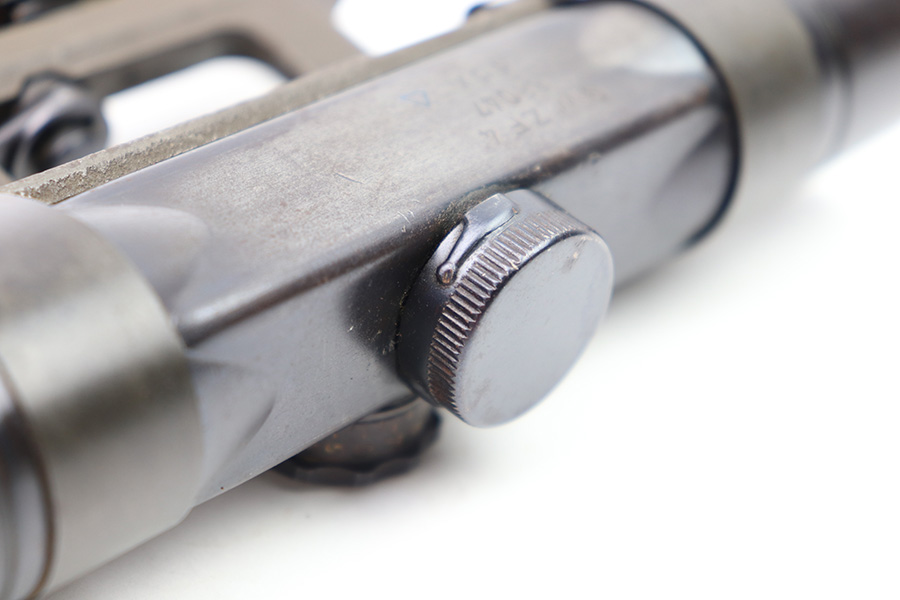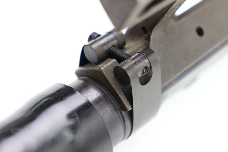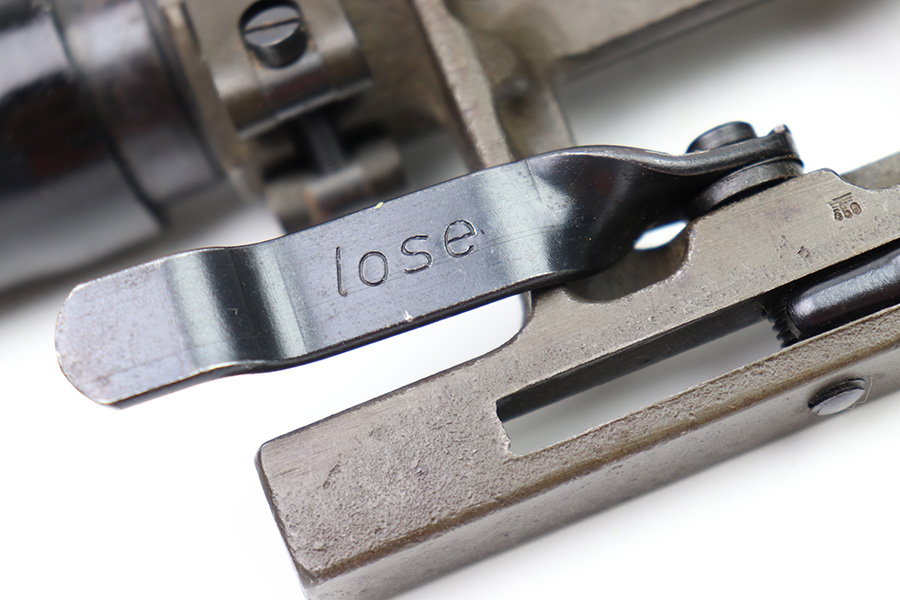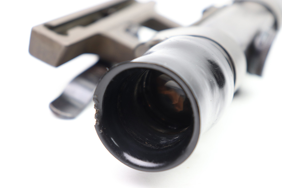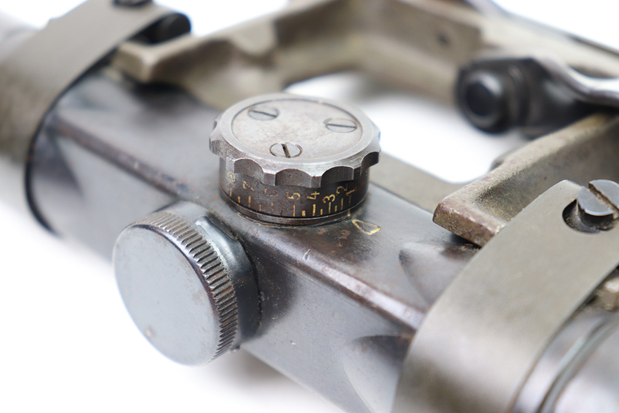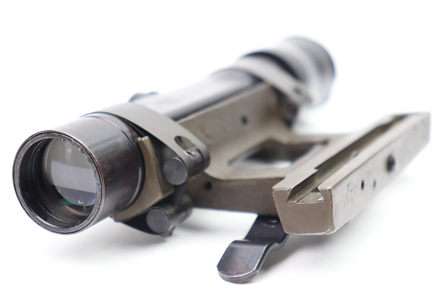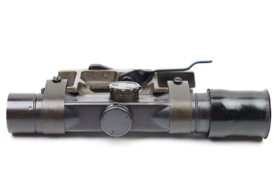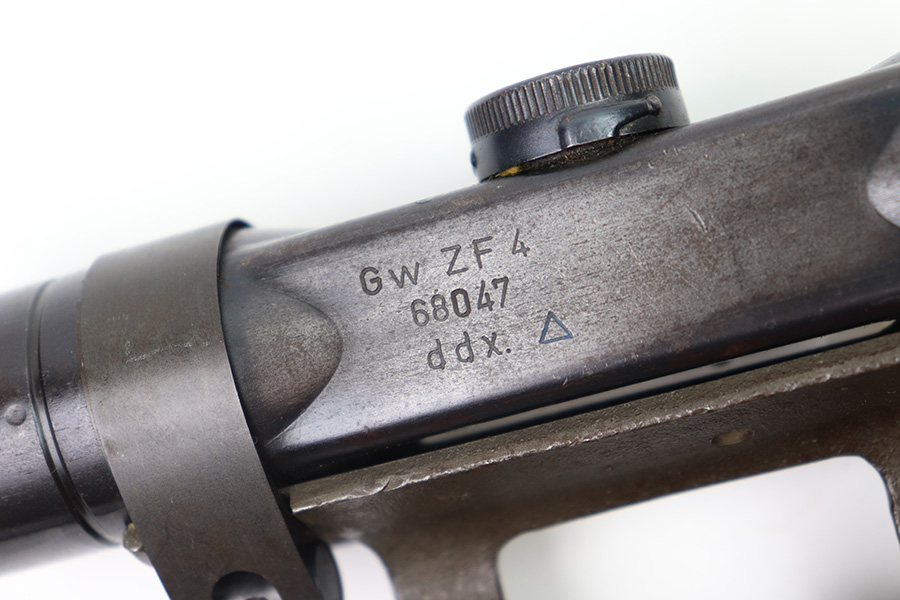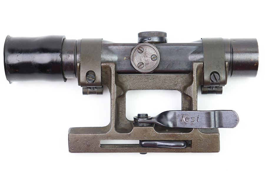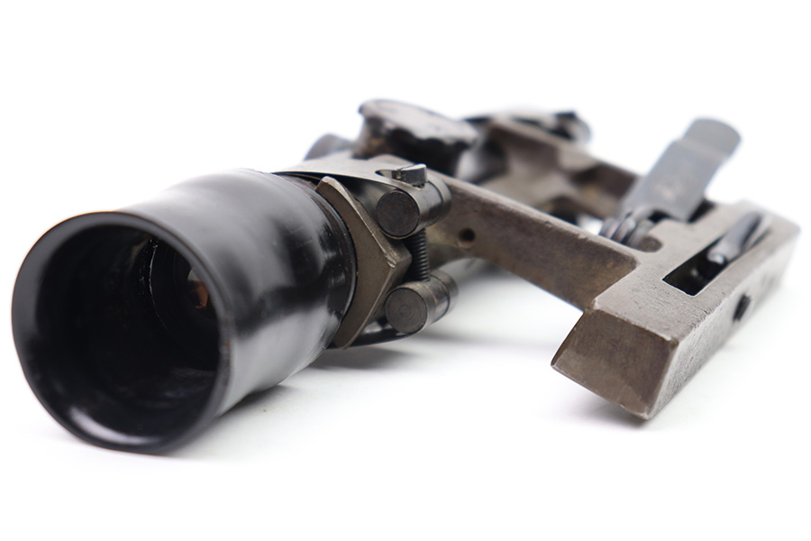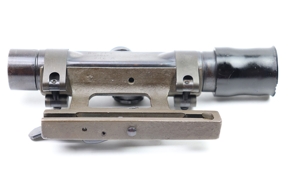 10/11/22 – This is an original WW2 Walther K43 scope mount, complete with an attached ZF 4 scope. The scope is in great condition with clear optics and a strong reticle. There is some mild cloudiness to the optic, but visibility overall is around 90%. The original rubber eye cup is still attached and in great condition as well. The exterior of the scope has some finish loss and mild surface patina, but no rust or pitting. The scope mount rings, screws, and locking lever are all original and intact. The mount is Walther eagle 359 proof stamped and shows some mild pitting but the phosphate finish is good overall. A fairly scarce, late WW2 original grouping.