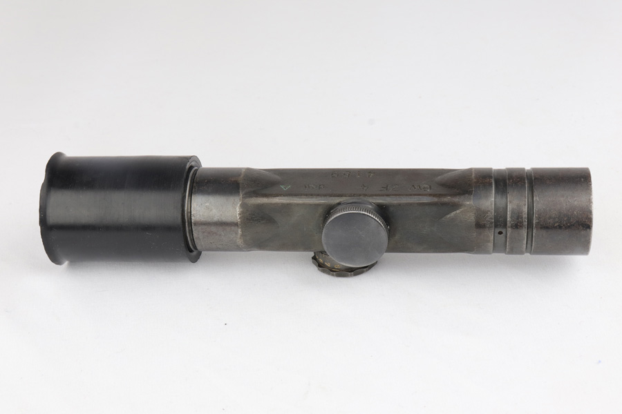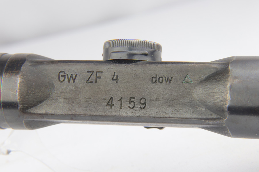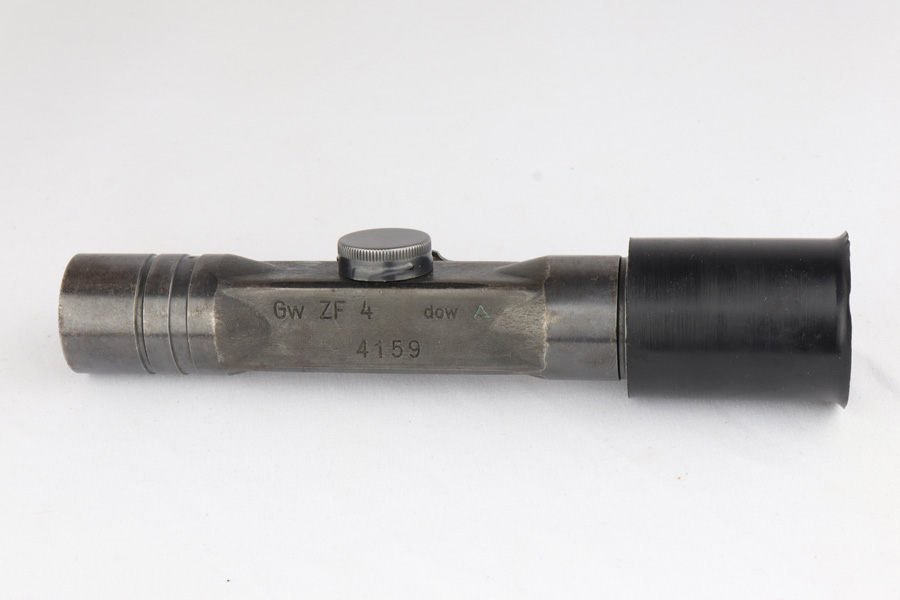2/14/19 – This is an original ZF 4 scope for a WW2 era German rifle (K98, G43, K43). The scope is marked “Gw ZF 4 dow” with “4159” underneath. The scope has some light patina and minor edge wear but is in excellent overall condition. Comes with a reproduction rubber eye cup. The optics are crisp and clear but there’s a hint of haziness , or “slightly cloudy”. Guaranteed original scope with a repro rubber cap.