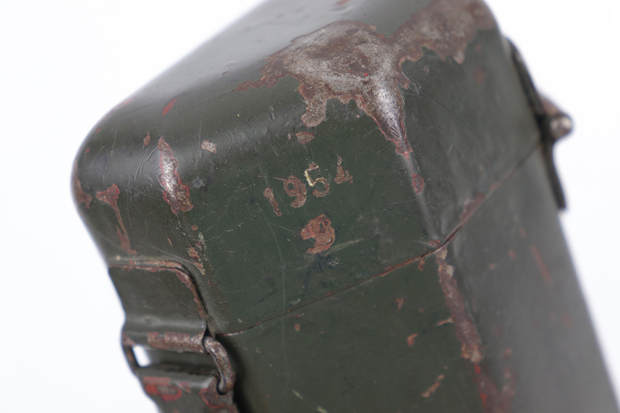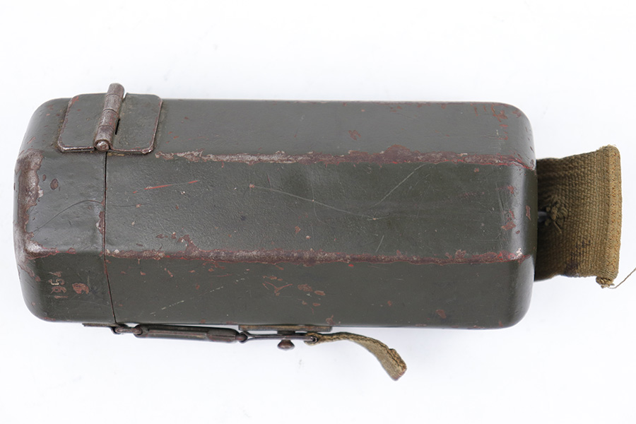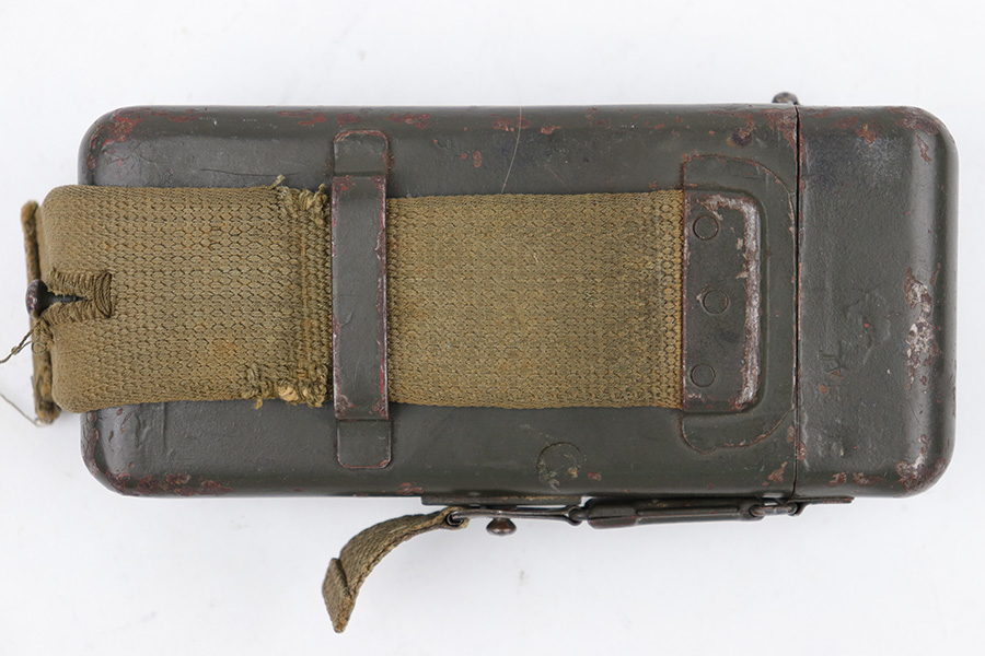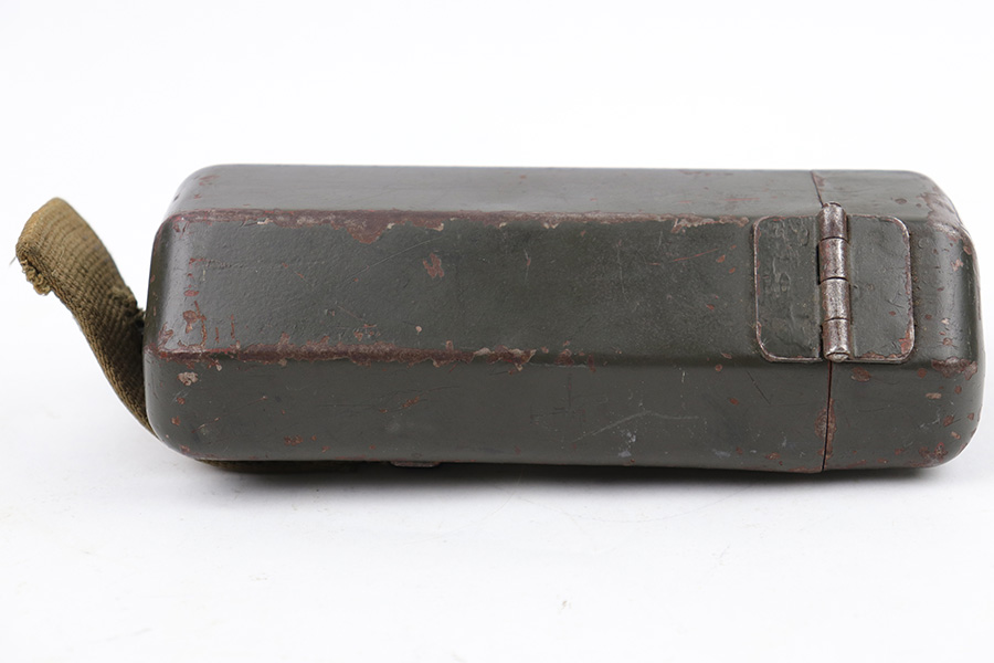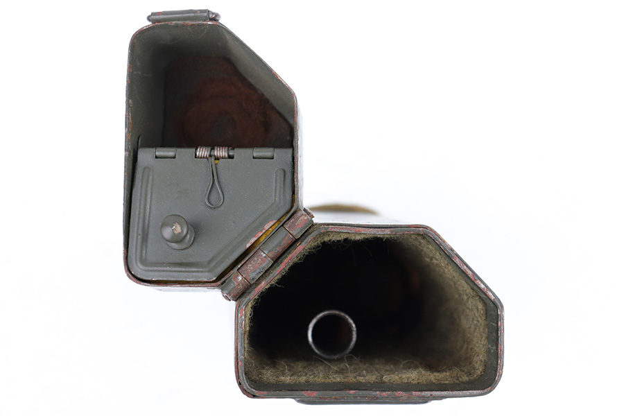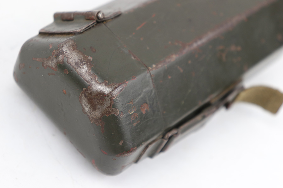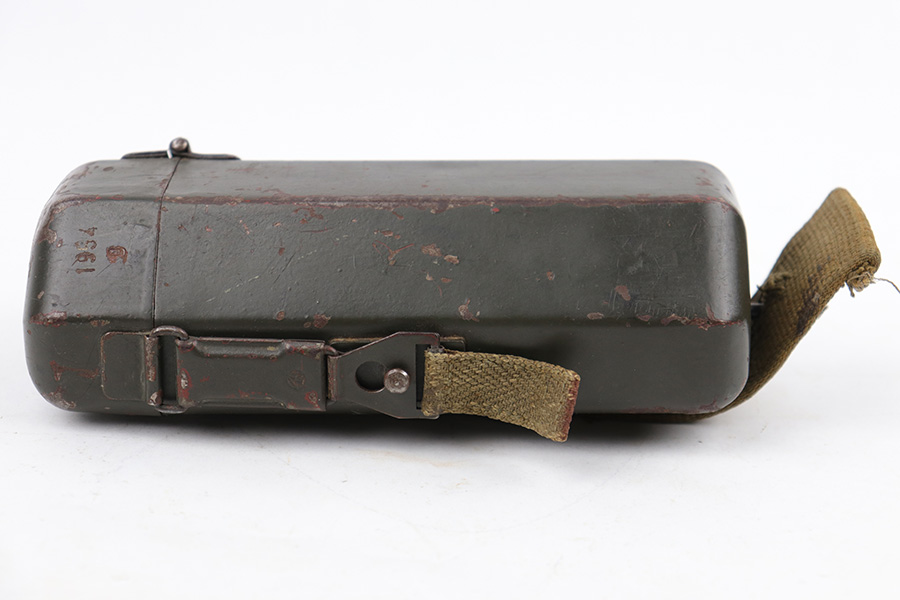 5/16/23 – This is an original metal scope case from WW2 for a ZF 41 scope. The case has a dark olive green paint that’s in good condition with some areas of chipping and paint loss on the exterior from age and use wear. The original canvas belt loop / attachment strap is still attached, as shown. The lid is maker stamped “jvb” for Wessel & Muller, Luckenwalde and has a waffen proof stamp as well. The other side of the lid is serial numbered 1954g. The interior is lined with green wool and is in excellent condition. Inside the interior lid compartment is a cleaning cloth.