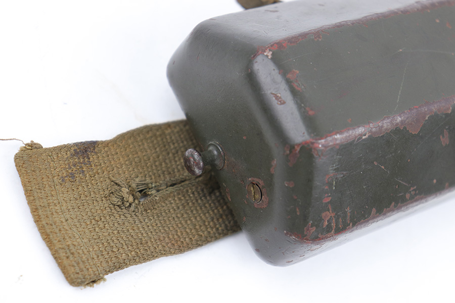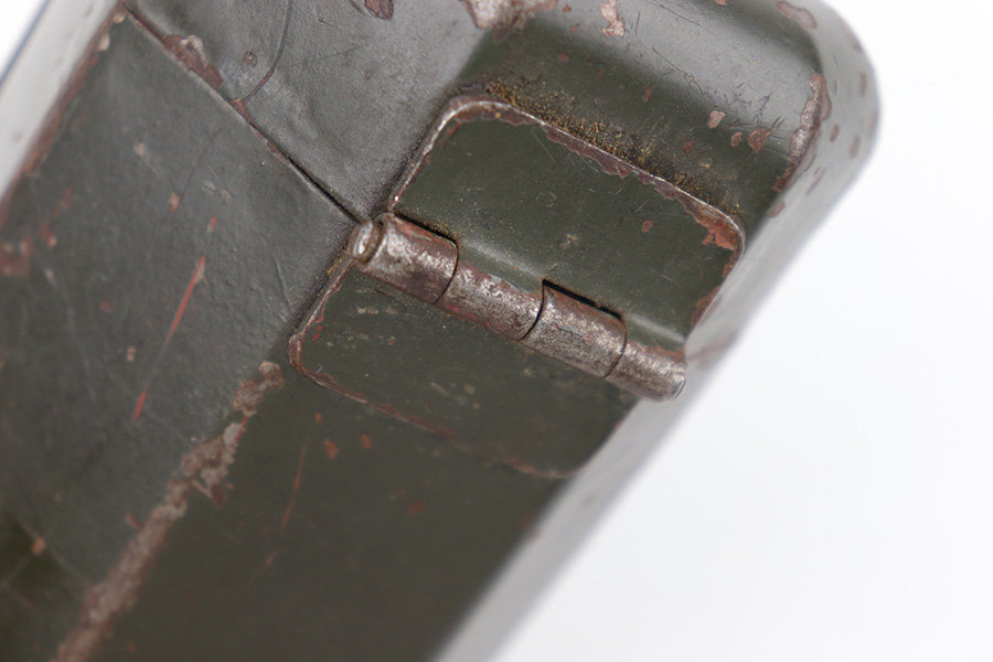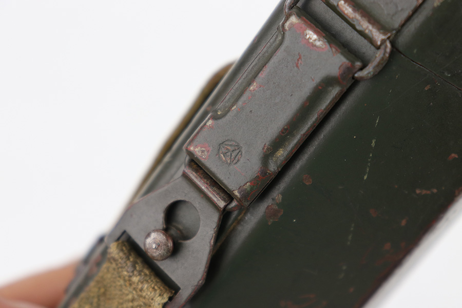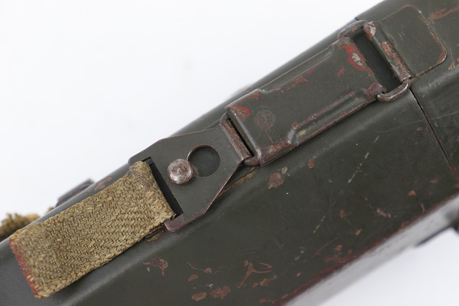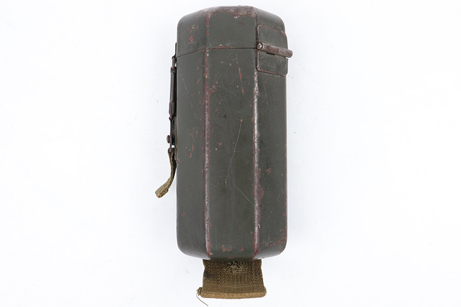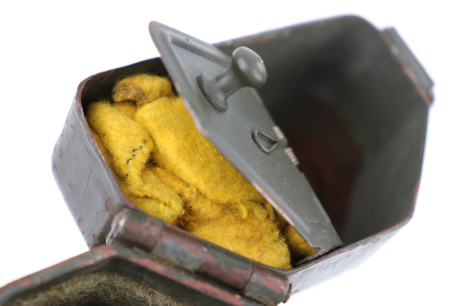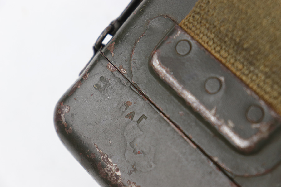 5/16/23 – This is an original metal scope case from WW2 for a ZF 41 scope. The case has a dark olive green paint that’s in good condition with some areas of chipping and paint loss on the exterior from age and use wear. The original canvas belt loop / attachment strap is still attached, as shown. The lid is maker stamped “jvb” for Wessel & Muller, Luckenwalde and has a waffen proof stamp as well. The other side of the lid is serial numbered 1954g. The interior is lined with green wool and is in excellent condition. Inside the interior lid compartment is a cleaning cloth.