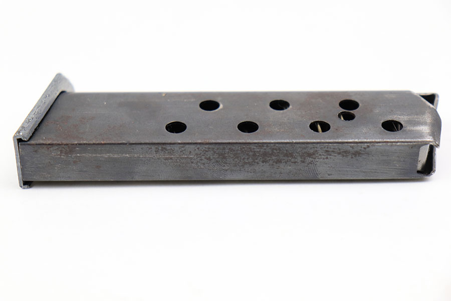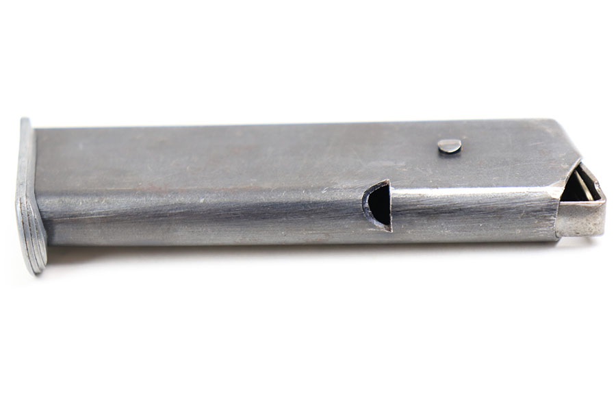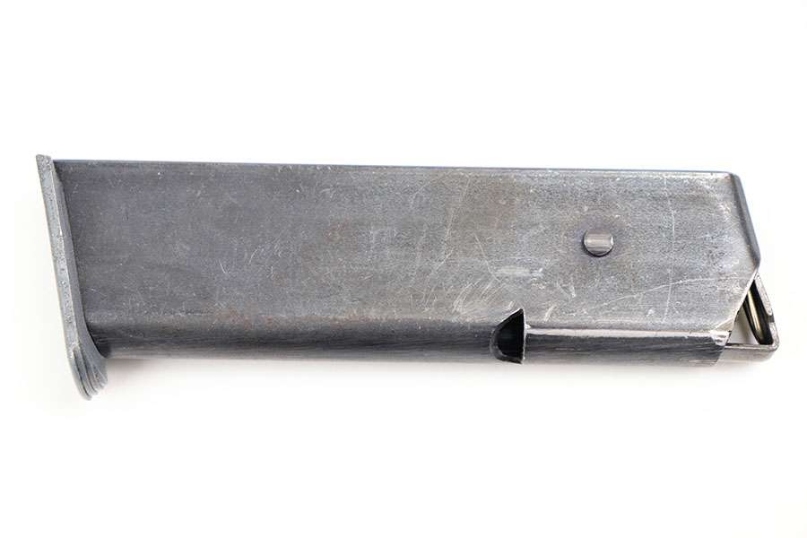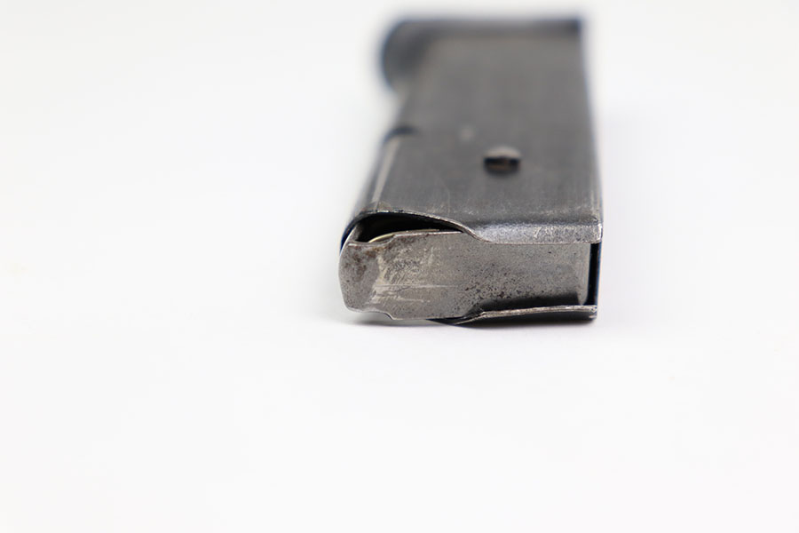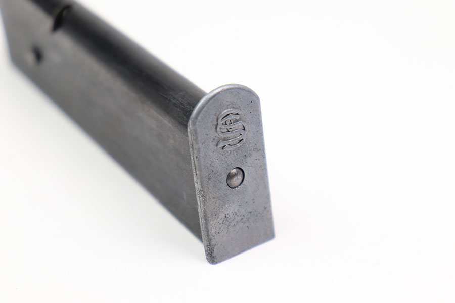 1/22/21 – This is an original WW2 era Sauer 38h magazine. The magazine has a zinc base, which was used later during WW2, and is fairly uncommon. The magazine tube is blued, and despite some mild patina / discoloration on the left side of the frame, the bluing is in great overall condition. The spring is strong and fully functional.
