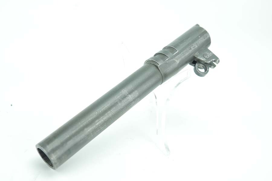 11/11/24 – This is a Springfield M1911 barrel. The S and P markings on the left side of the lug indicate it is a later Springfield barrel. This barrels outside finish is in great condition with thinning of the finish from standard use. These are commonly known to be replacement barrels. Comes with pin or link.