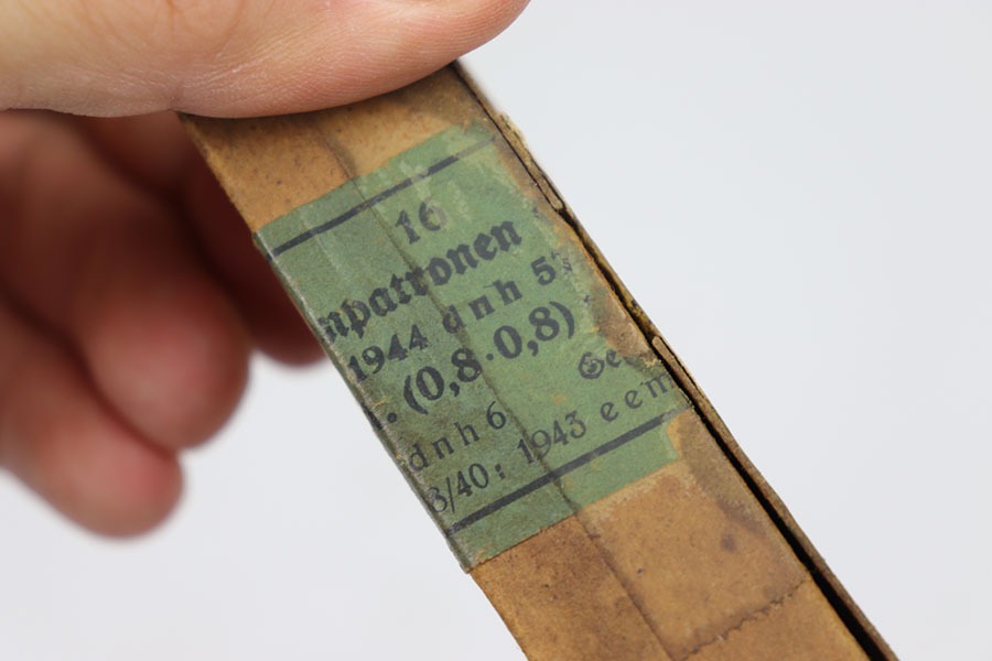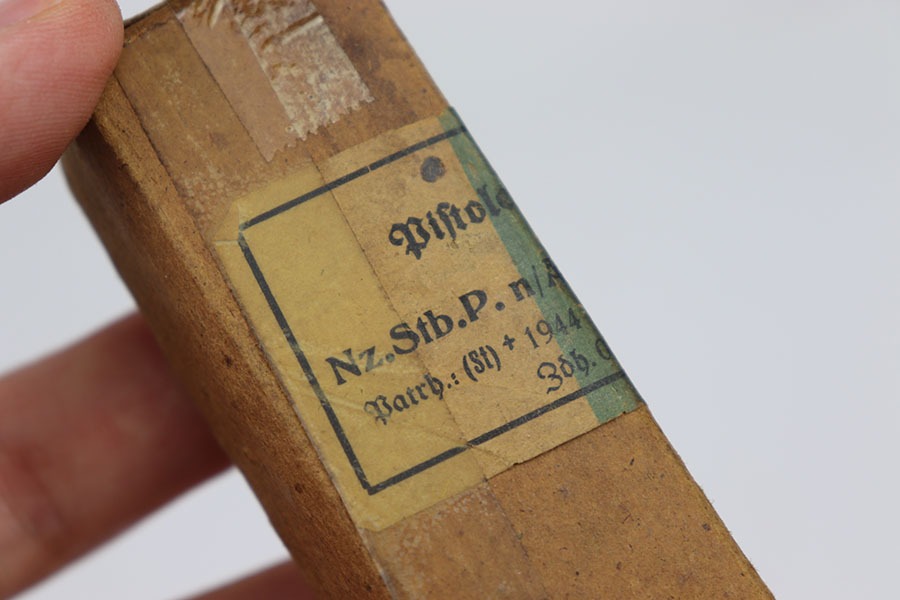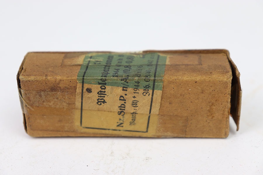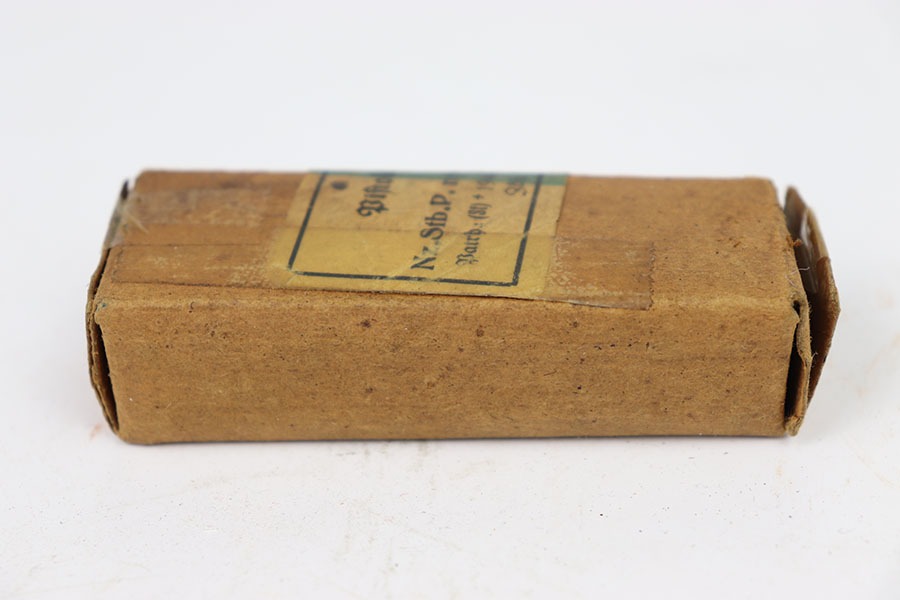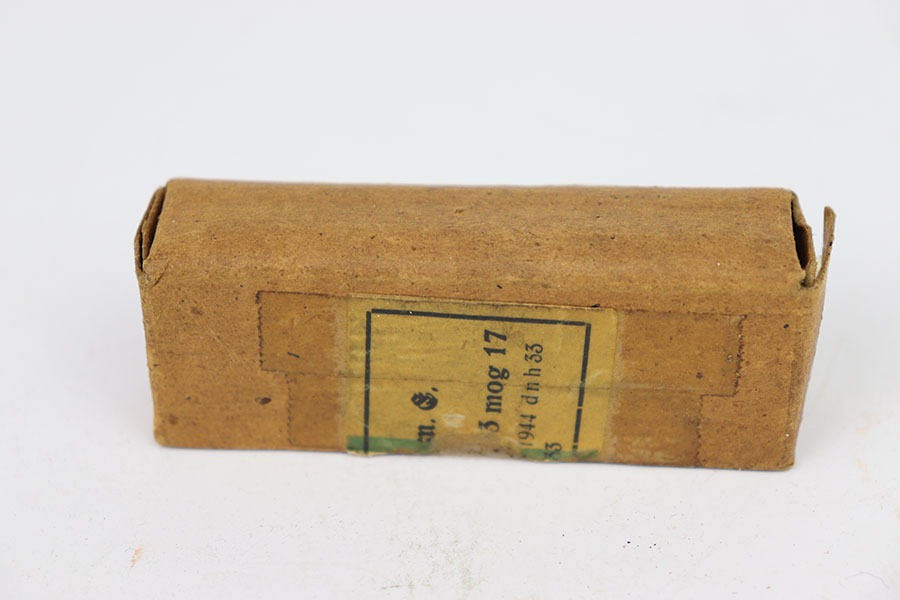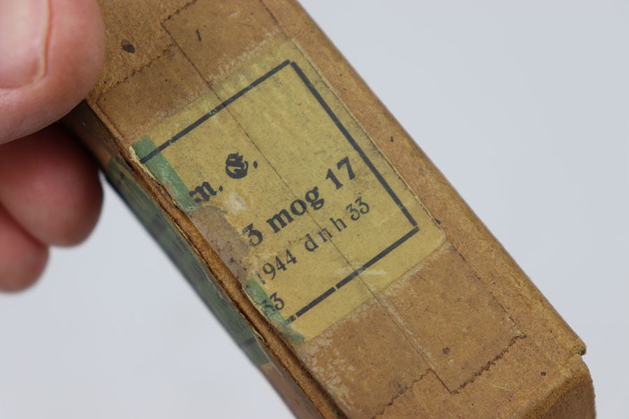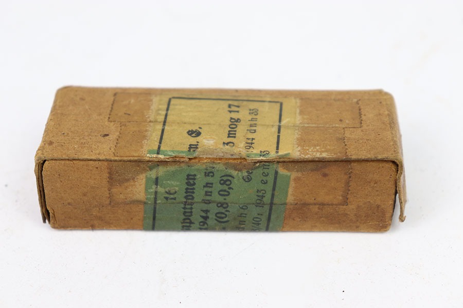 10/7/24 – This is an original packaged dnh 1944 STG44 / MP44 ammo. This ammo is rare especially in this condition and in its original packaging. Head stamped, “dnh Stt 6 44”. The inside of the box is marked “jtt 44” and contains 16 rounds. Box seal is broken.