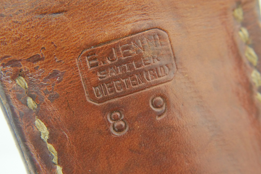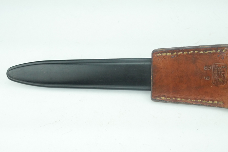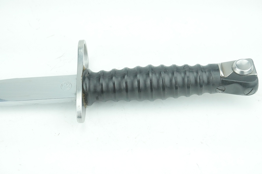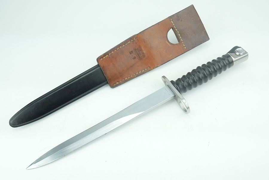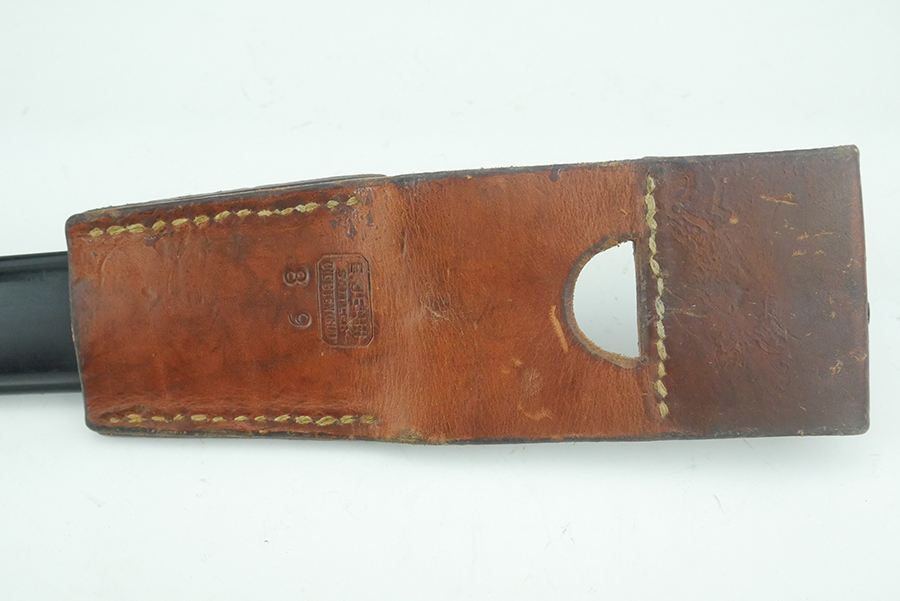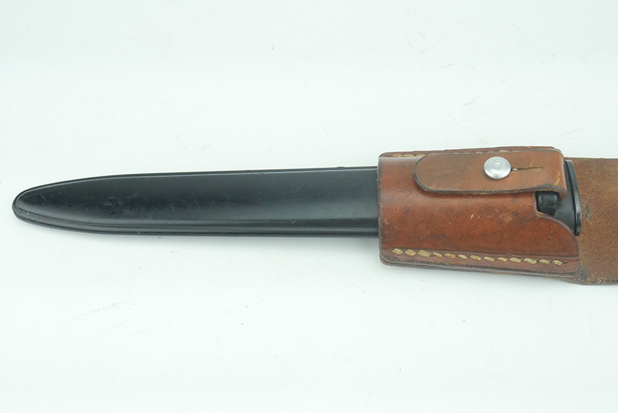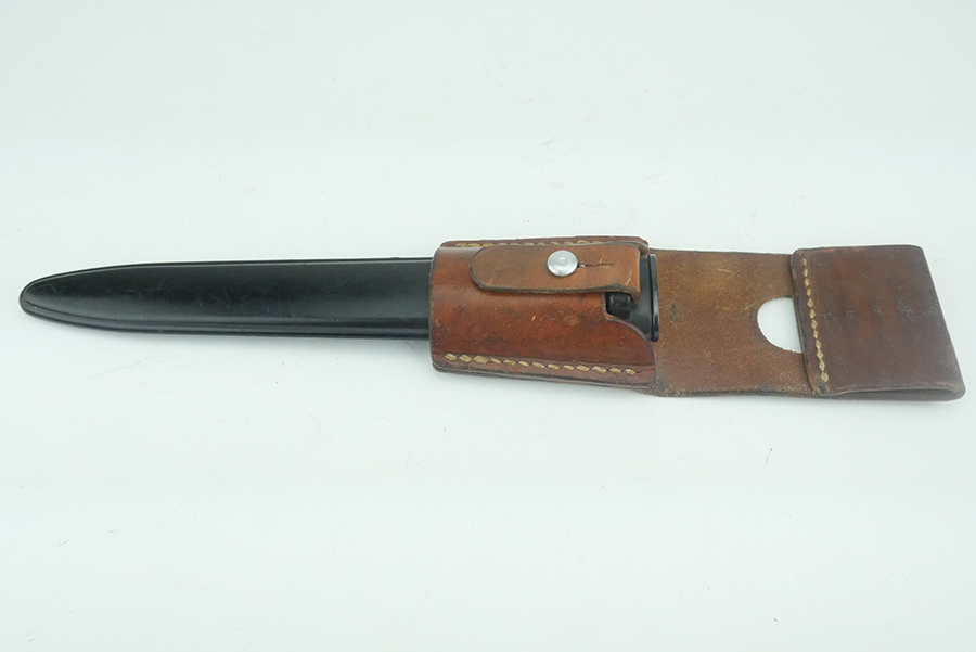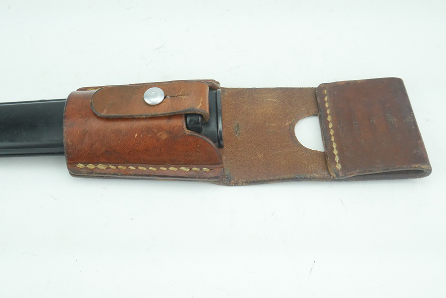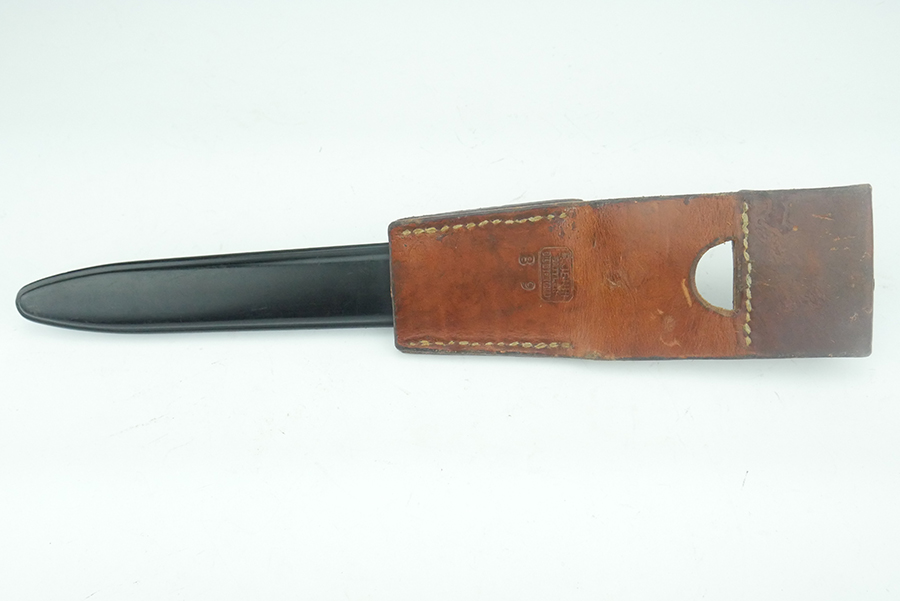 9/13/24 – This is a great example of a Swiss STG57 bayonet. Overall the bayonet is in great condition. The blade on this bayonet retains it’s original edge and has no signs of being sharpened. There are two small spots of edge damage, on on the right side of the blade and on the tip. The blade has the standard wear associated with standard scabbard use. The grip on this dagger is also in great condition with only two minor dents to the grip. The locking mechanism is still functional and strong. The scabbard on this bayonet is in great condition with only minor scratches. The frog is also in great condition, the leather is still pliable and the stitching is still present. The frog is maker stamped on the back ” E. JENNI SATTLER DIEGTEN (BLD) 89″