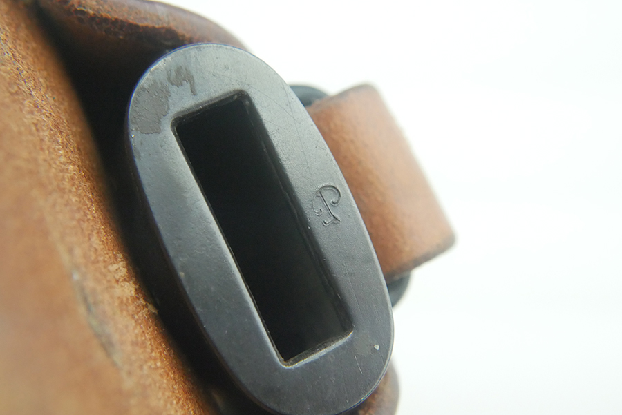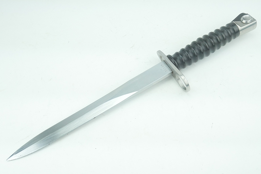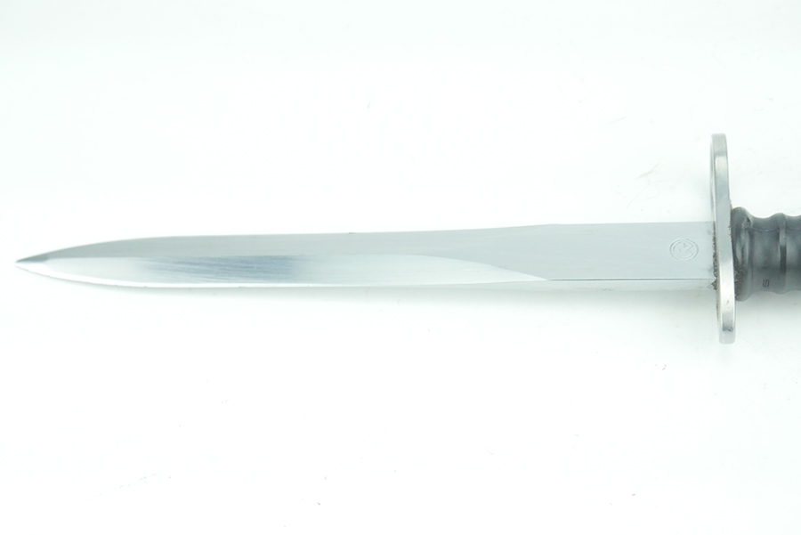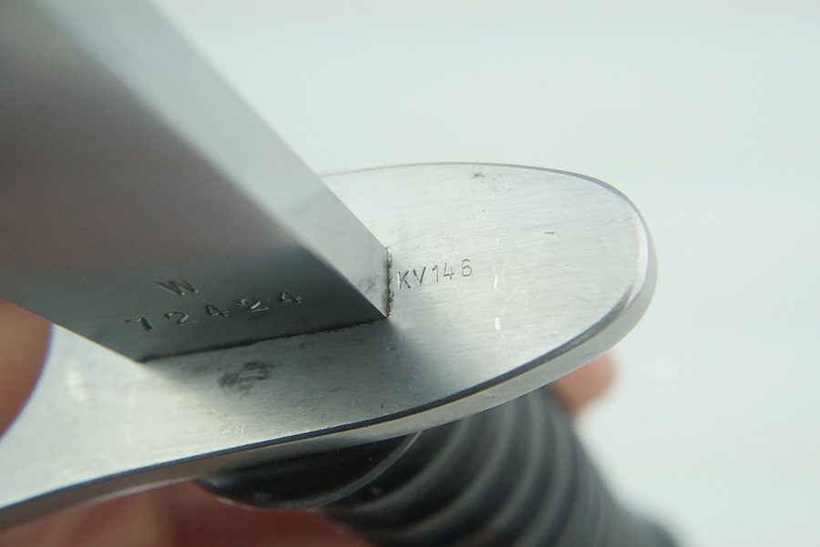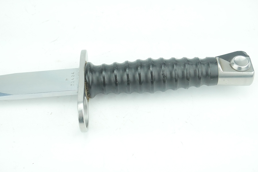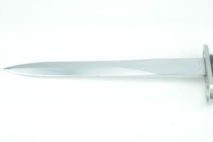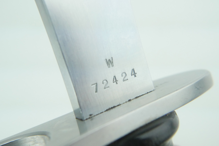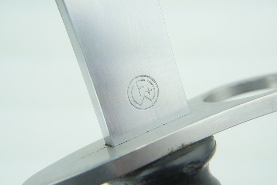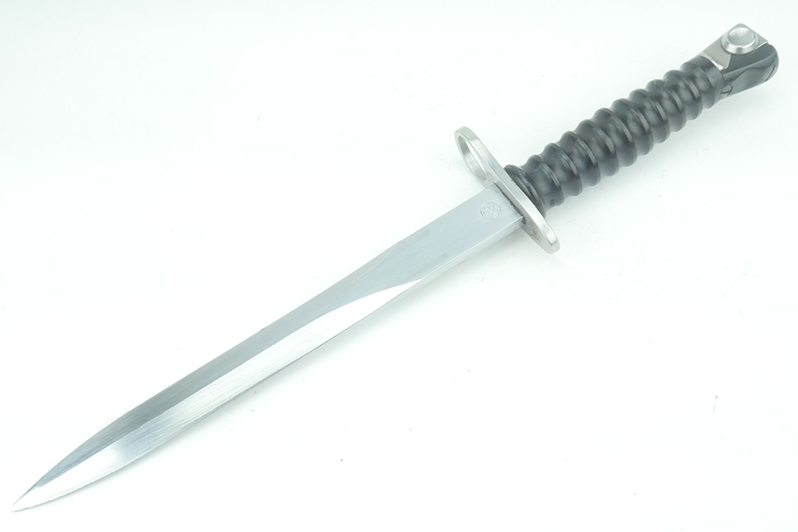 9/13/24 – This is a great example of a Swiss STG57 bayonet. Overall the bayonet is in great condition. The blade on this bayonet retains it’s original edge and has no signs of being sharpened. There are two small spots of edge damage, on on the right side of the blade and on the tip. The blade has the standard wear associated with standard scabbard use. The grip on this dagger is also in great condition with only two minor dents to the grip. The locking mechanism is still functional and strong. The scabbard on this bayonet is in great condition with only minor scratches. The frog is also in great condition, the leather is still pliable and the stitching is still present. The frog is maker stamped on the back ” E. JENNI SATTLER DIEGTEN (BLD) 89″