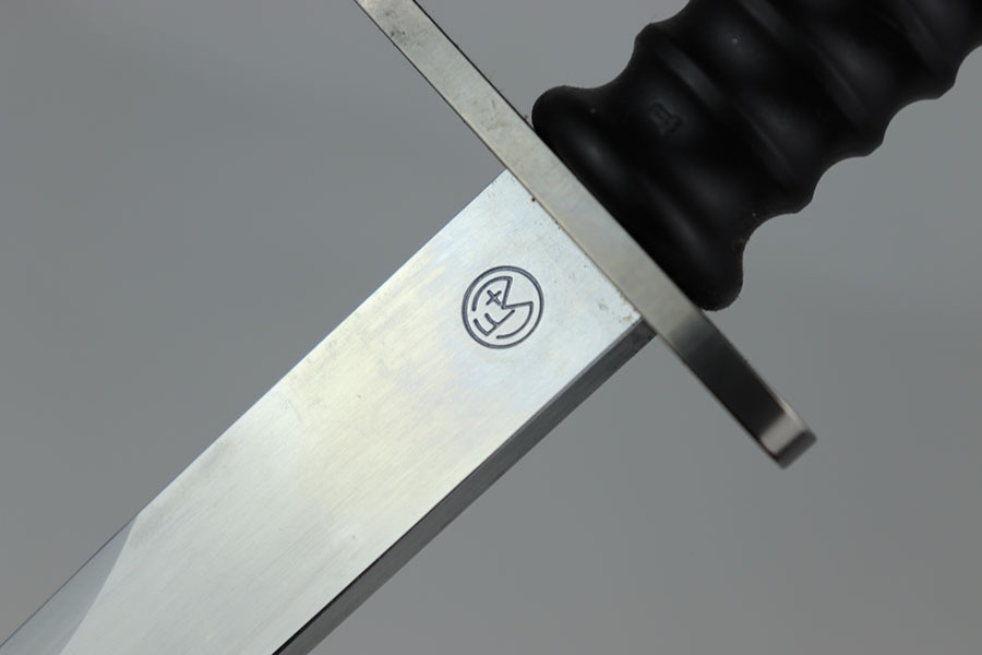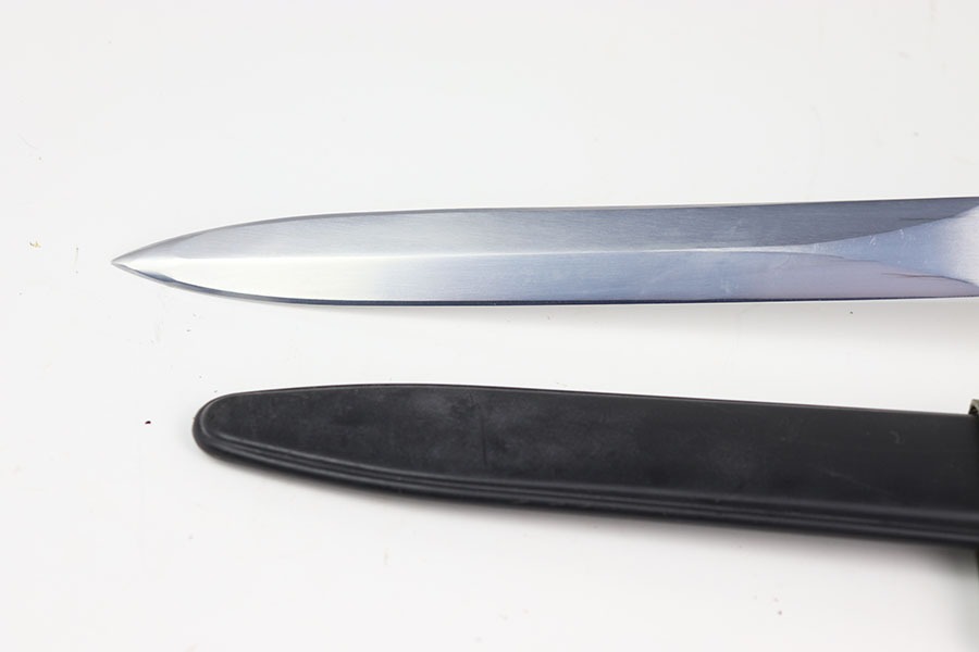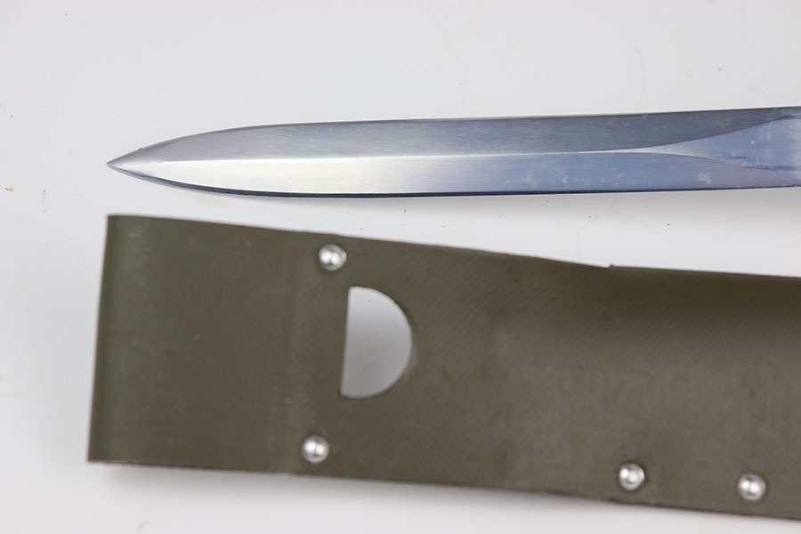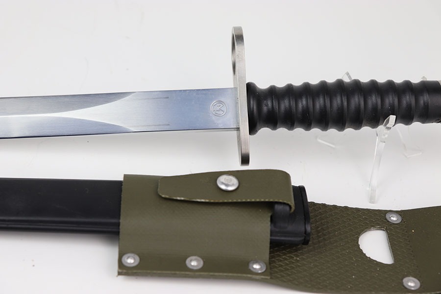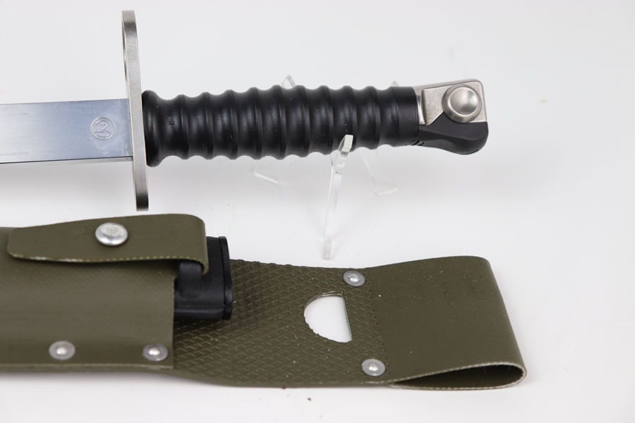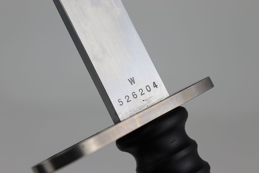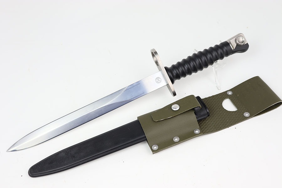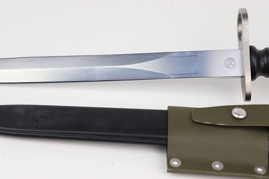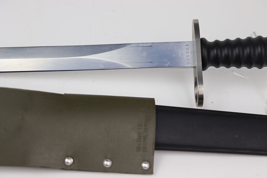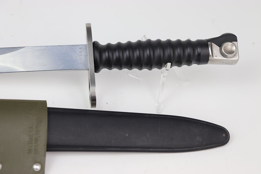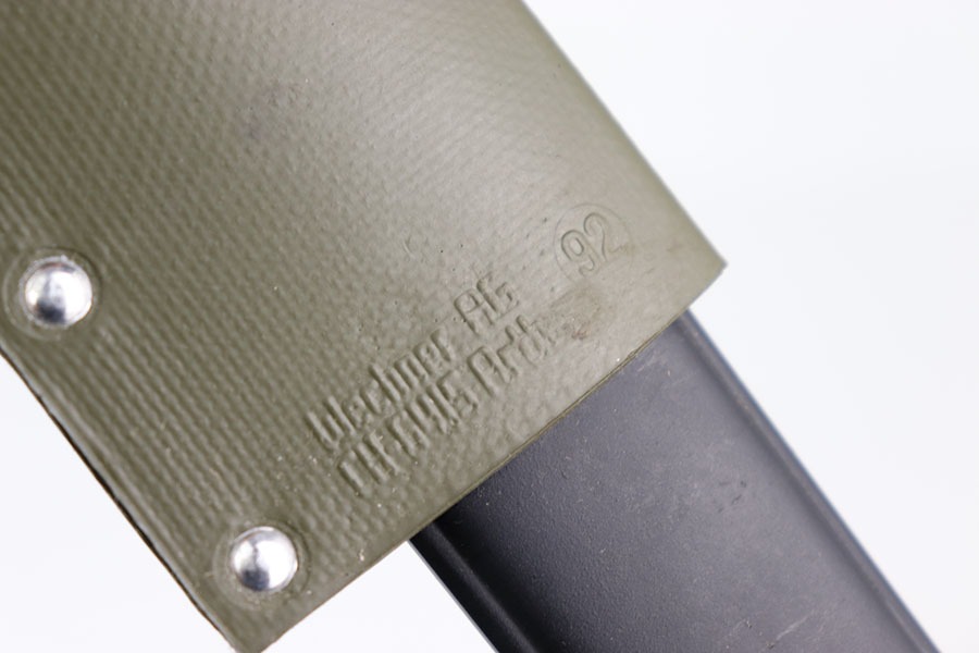10/23/24 – This is a great example of a Swiss STG57 bayonet. Overall the bayonet is in excellent condition. The blade on this bayonet retains it’s original edge and has no signs of being additionally sharpened. The blade has the standard wear associated with standard scabbard use. The grip on this dagger is also in excellent condition. The frog and scabbard on this bayonet is in excellent condition with only minor scratches. The leather is still pliable and the stitching is still present. The frog is maker stamped on the back ” Wechner AG CH-6415 Arth 92″