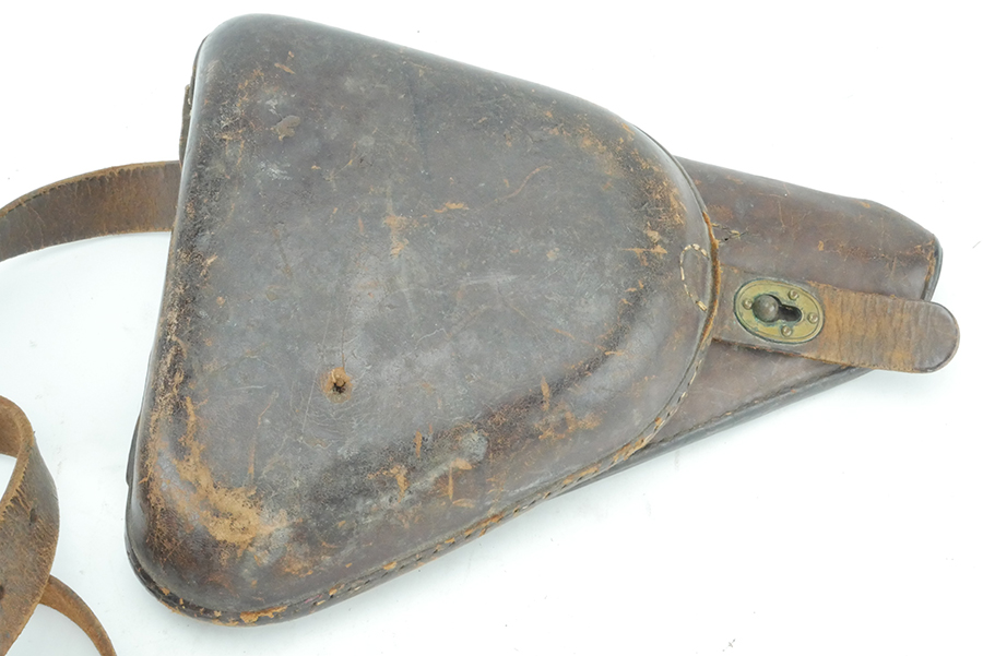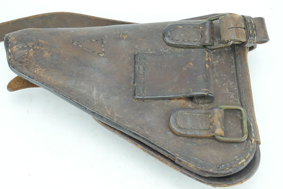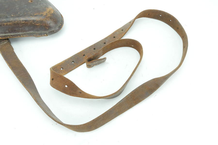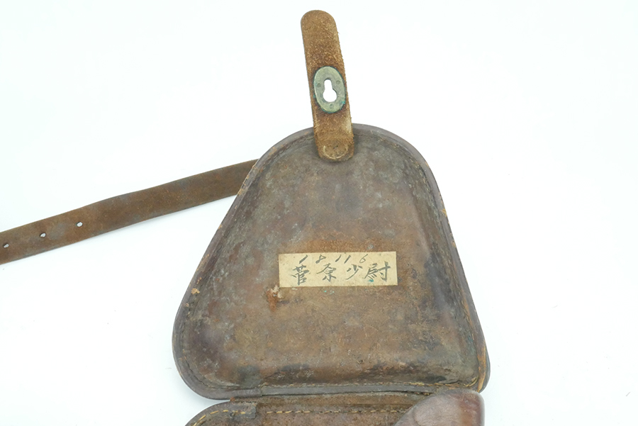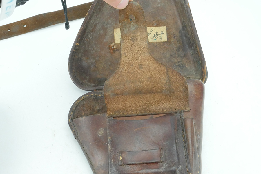 5/21/24 – This is an early WW2 leather shoulder holster for a Japanese Nambu Type 14 pistol. Comes with its original leather shoulder strap, but the fittings are missing on one side. Paper label on the inside with clear kanji writing. No stitching issues. There are surface scuffs in the leather throughout and a small hole in the clam shell top.