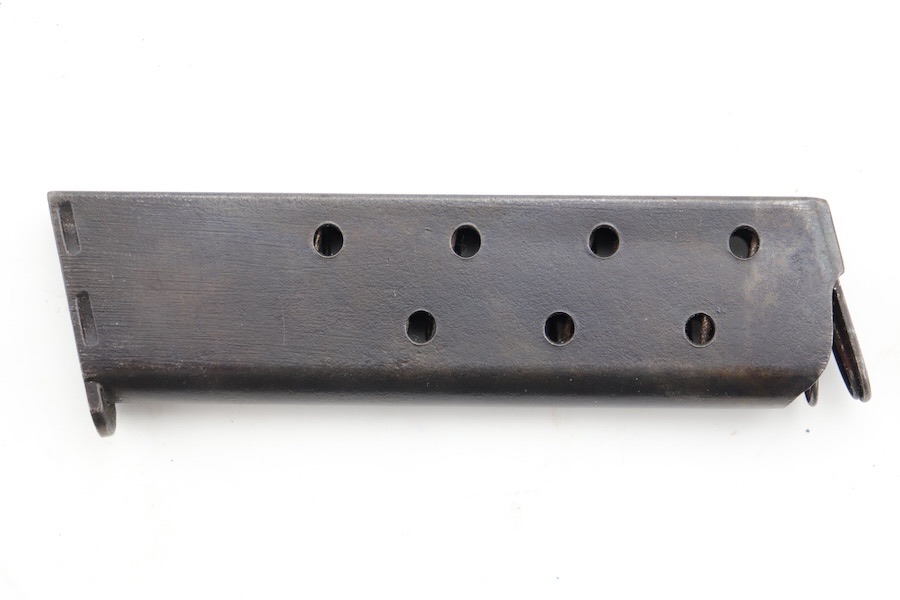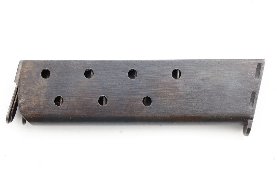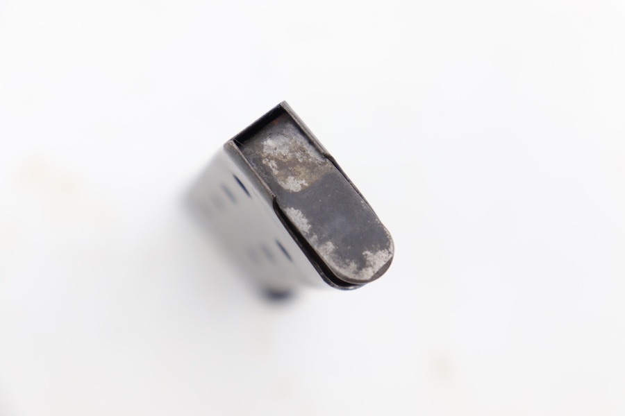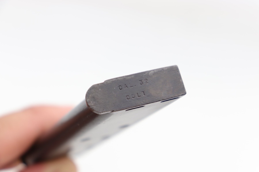 7/2/24 – We believe this magazine is a 1920s type VI Colt 1903 two-tone magazine. Even though this magazine lacks the distinct two-tone look due to the heavy patina on the body, there is no combination where a 1903 magazine has rounded feed lips in full blue with a crimped bottom and Cal .32 over top of the word “COLT.” That being said, this magazine has no active surface rust or deep pitting. Spring is strong and fully functional with excellent retention. Overall a solid mag that is still serviceable.