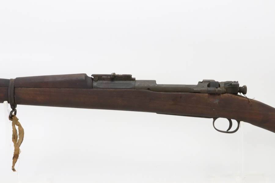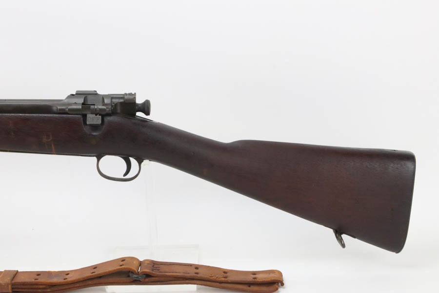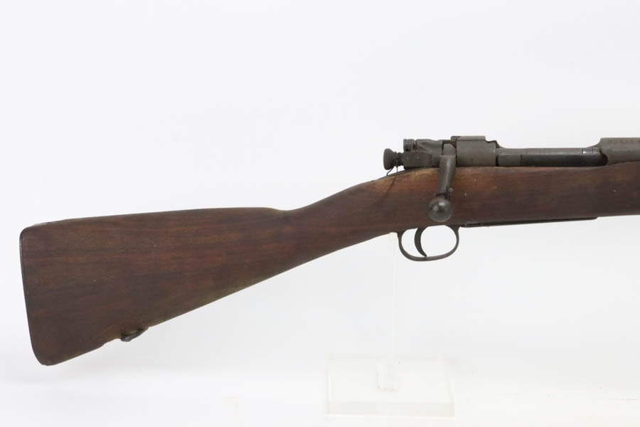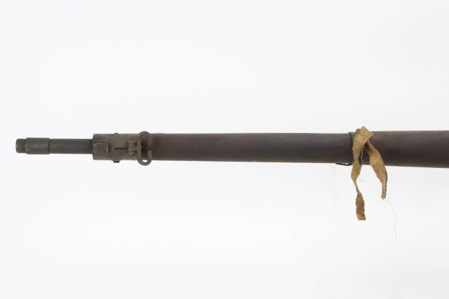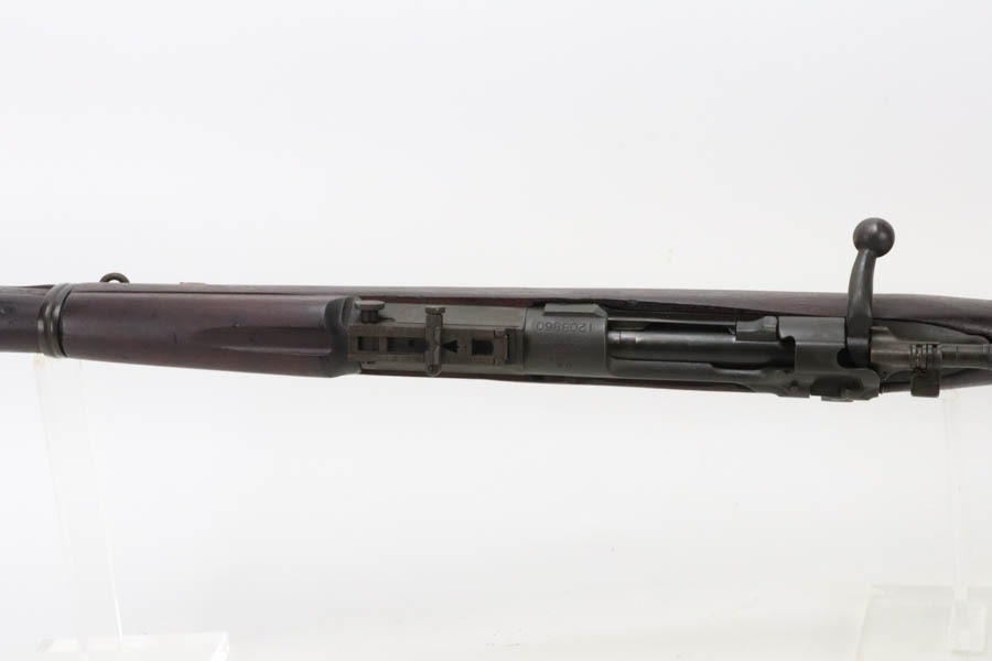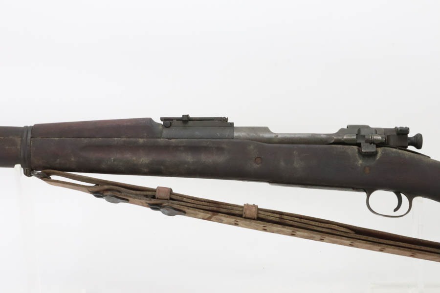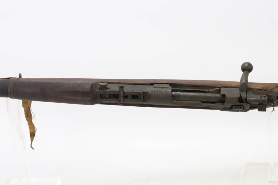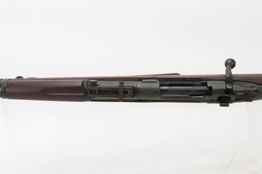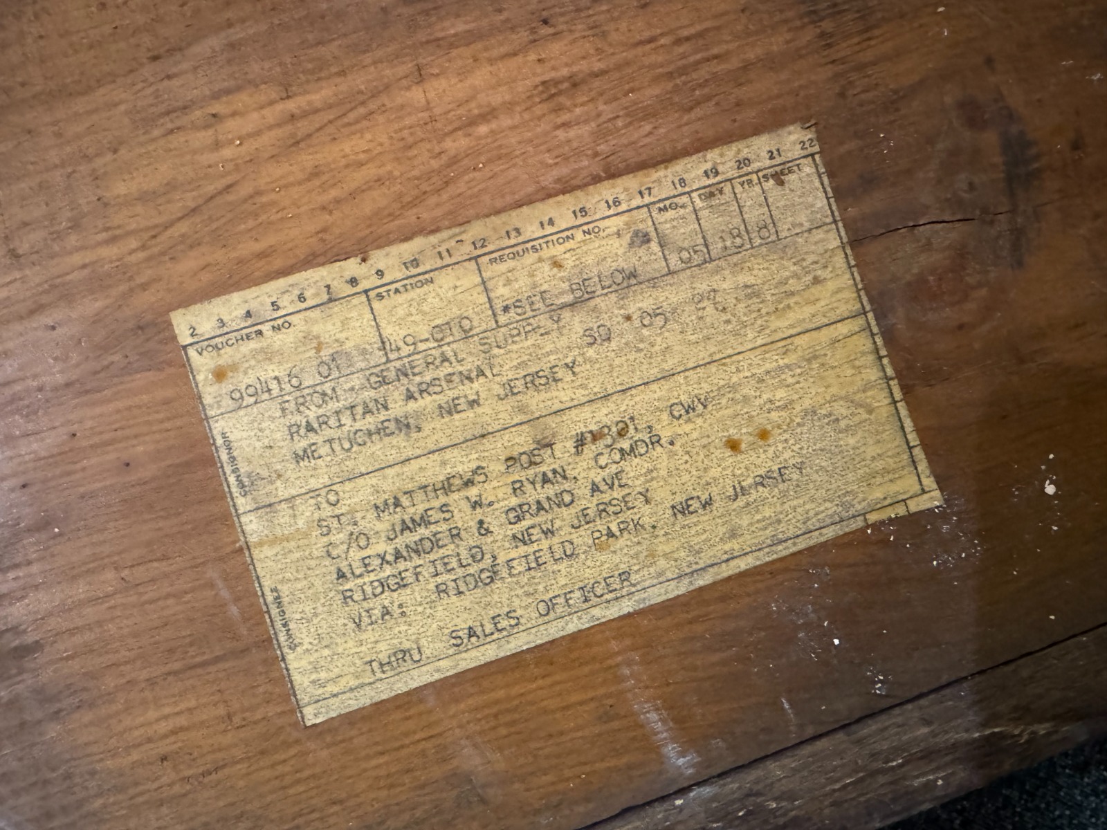 11/4/24 – This is an ultra rare, one-of-a-kind grouping of 10 Springfield Model 1903 rifles in their original Raritan Arsenal wood shipping crate. The crate still has its original Raritan Arsenal shipping label that states the original shipment included 10 pieces – we have all 10 rifles here! Eight of the rifles are unwrapped, but two are still in their original wax paper covering (“mummy guns”). The guns have various manufacture years and various arsenal-replaced parts – the barrels are mostly late WW2, many of the parts are WWI vintage, and a few of the receivers feature hatcher-holes. Five of the guns have period-correct leather slings. Generally, the guns are in very nice, un-issued condition, showing very little sign of actual wear. However, the guns are generally dusty, dirty, and some parts are covered in cosmoline. We are confident the guns will clean up very nice, but we decided to leave them in their original condition and let the buyer decide what they’d like to do with them. There are some spots of oxidation and light rust on some of the metal parts here and there, but nothing major. The wood crate is in pretty nice condition after all these years, but the top lid is split in half. As you can see, it has its original shipping labels and “Rush Railway Express Agency” sticker. Inside the crate are also some cleaning kits, a glass jar of solder, and a few original dog tags from the GI who acquired this grouping. This is a truly unique piece of history that has miraculously stayed together all these years!