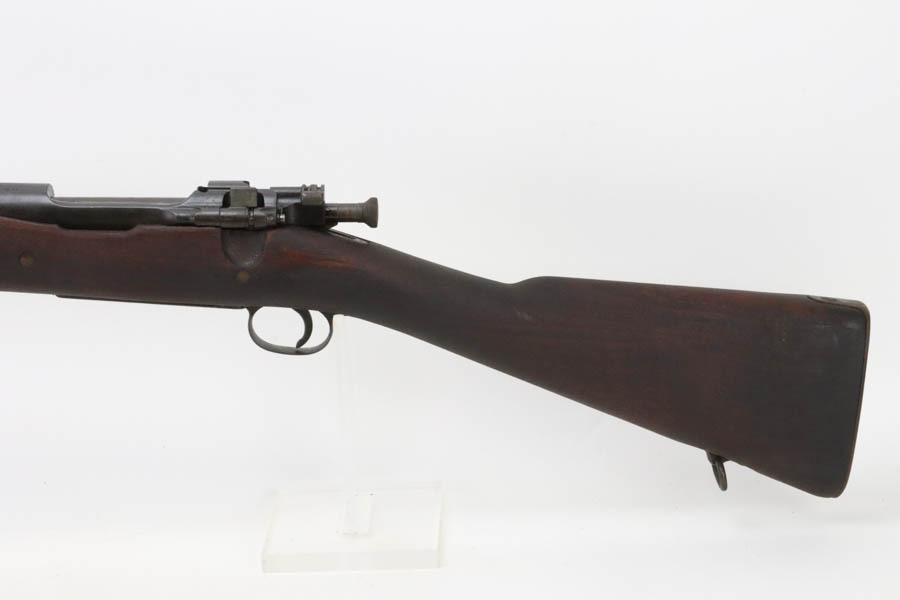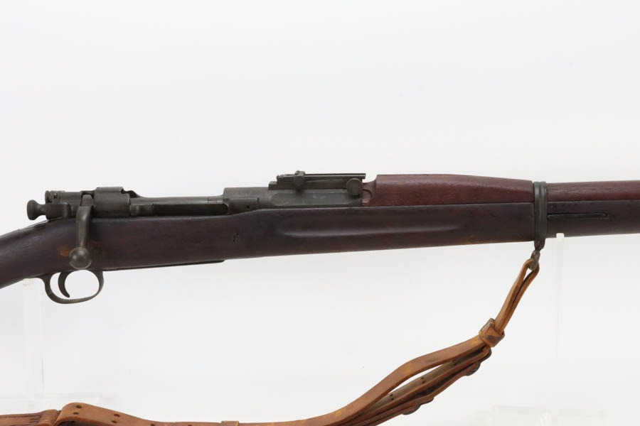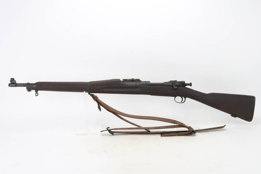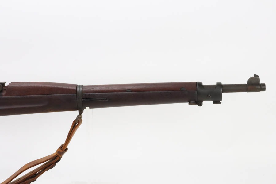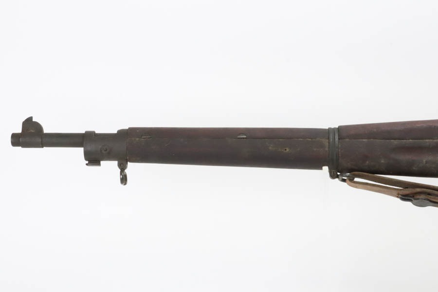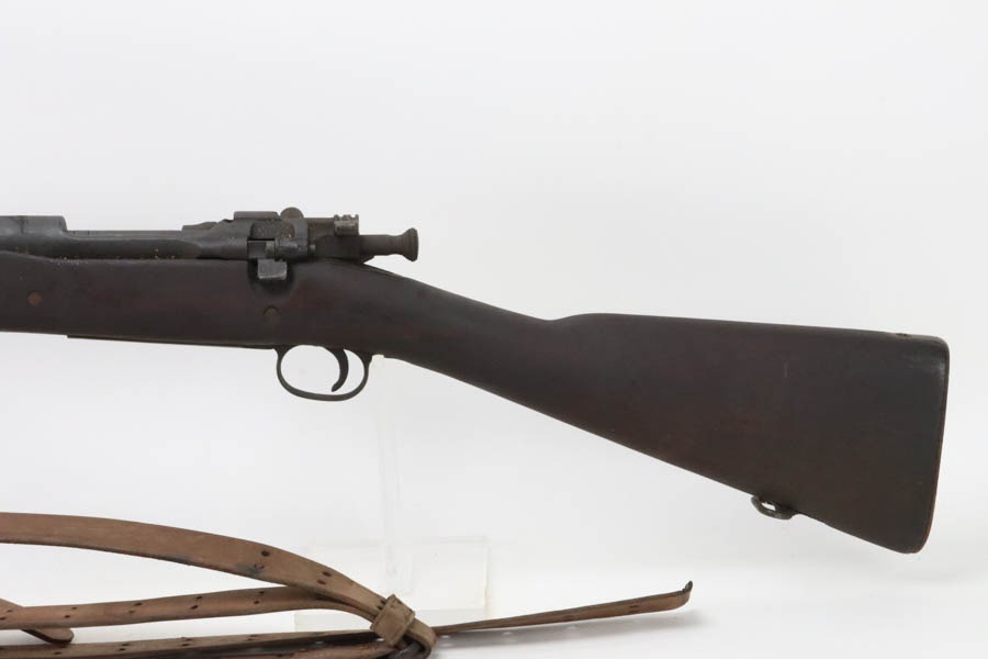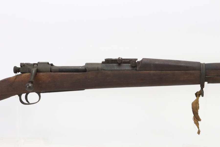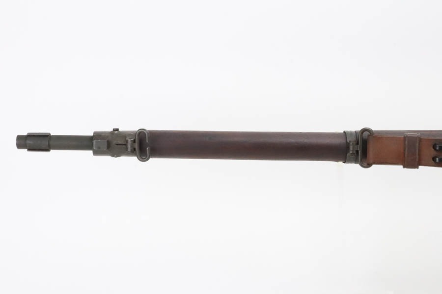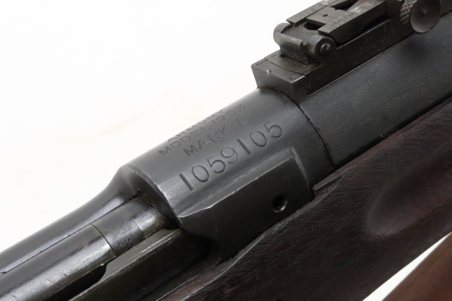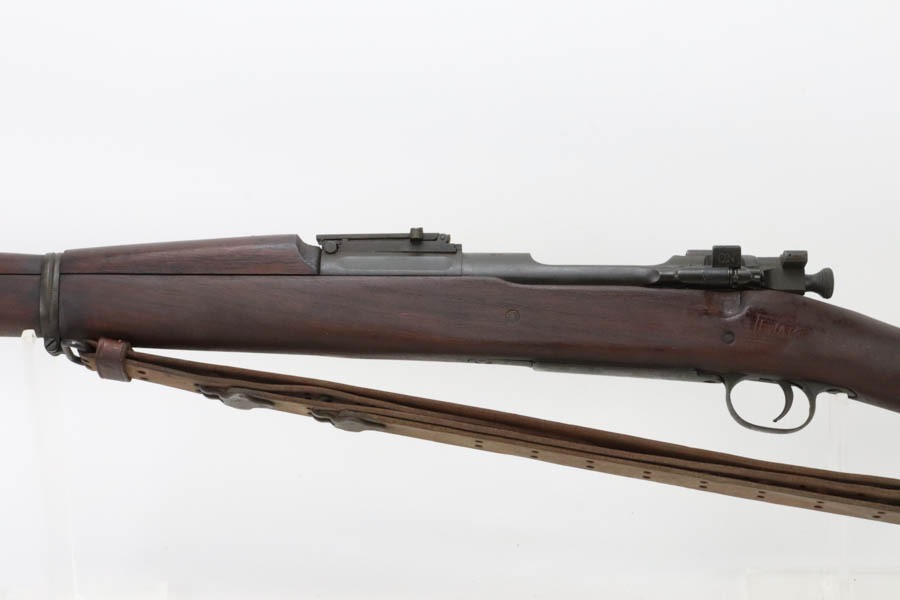 11/4/24 – This is an ultra rare, one-of-a-kind grouping of 10 Springfield Model 1903 rifles in their original Raritan Arsenal wood shipping crate. The crate still has its original Raritan Arsenal shipping label that states the original shipment included 10 pieces – we have all 10 rifles here! Eight of the rifles are unwrapped, but two are still in their original wax paper covering (“mummy guns”). The guns have various manufacture years and various arsenal-replaced parts – the barrels are mostly late WW2, many of the parts are WWI vintage, and a few of the receivers feature hatcher-holes. Five of the guns have period-correct leather slings. Generally, the guns are in very nice, un-issued condition, showing very little sign of actual wear. However, the guns are generally dusty, dirty, and some parts are covered in cosmoline. We are confident the guns will clean up very nice, but we decided to leave them in their original condition and let the buyer decide what they’d like to do with them. There are some spots of oxidation and light rust on some of the metal parts here and there, but nothing major. The wood crate is in pretty nice condition after all these years, but the top lid is split in half. As you can see, it has its original shipping labels and “Rush Railway Express Agency” sticker. Inside the crate are also some cleaning kits, a glass jar of solder, and a few original dog tags from the GI who acquired this grouping. This is a truly unique piece of history that has miraculously stayed together all these years!