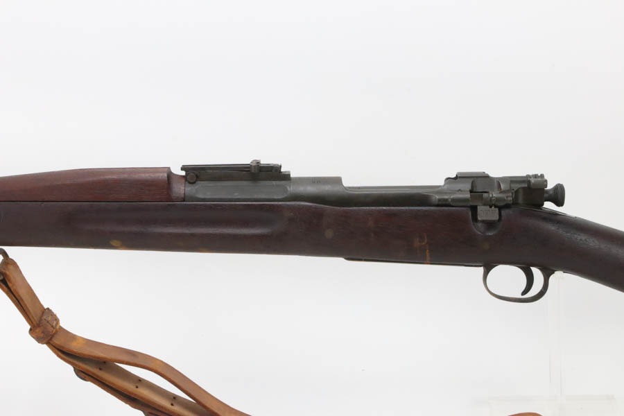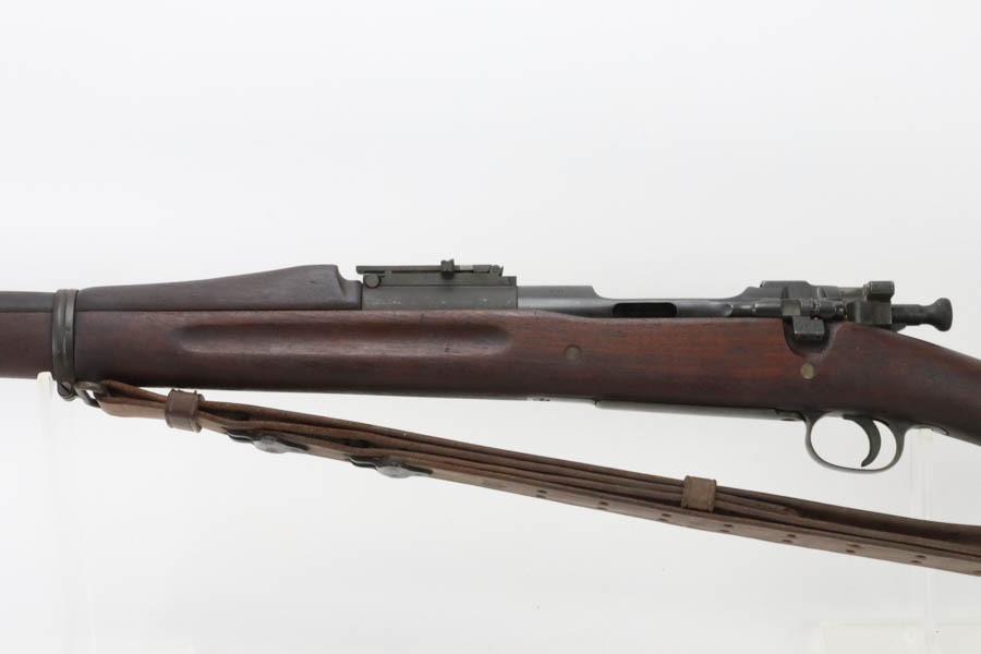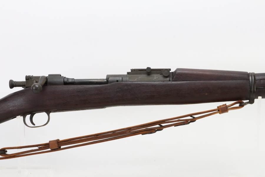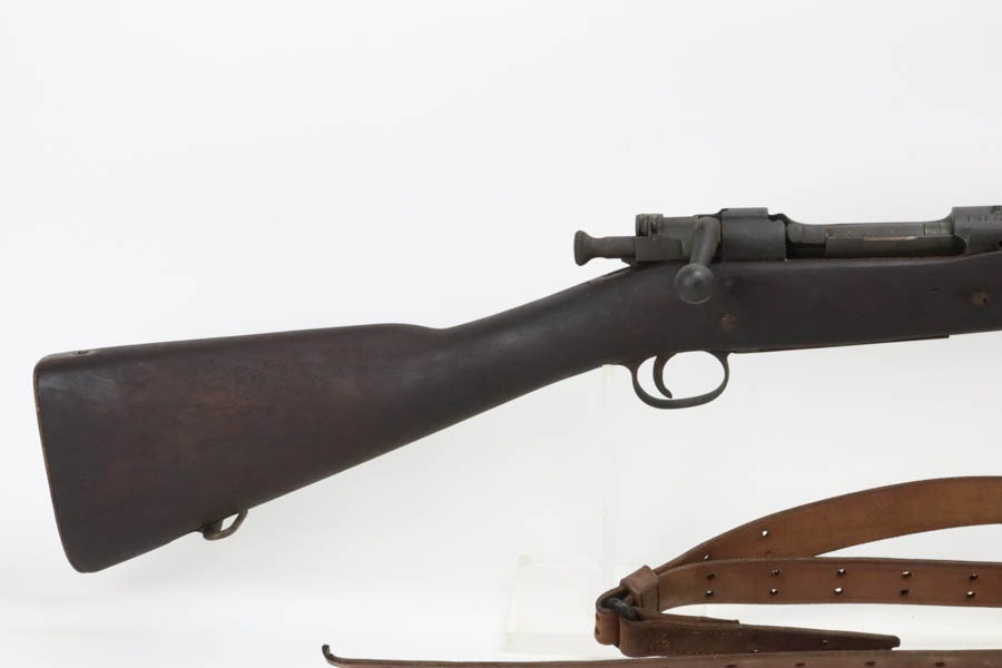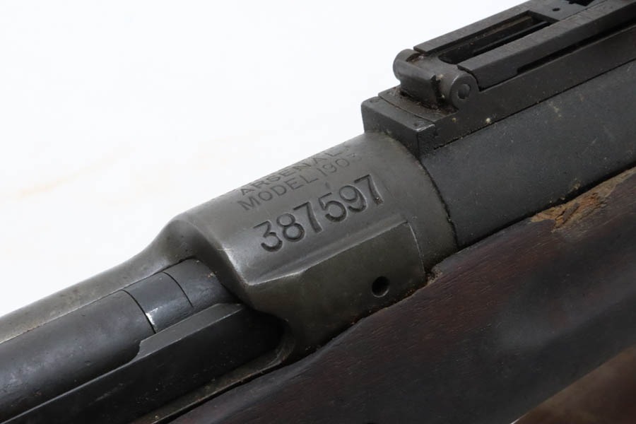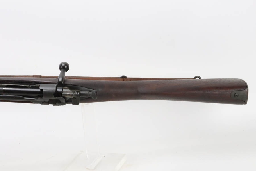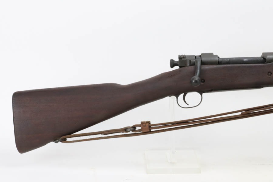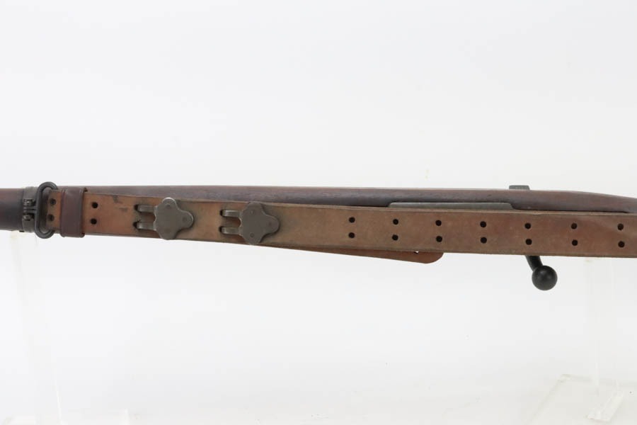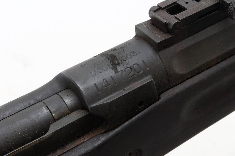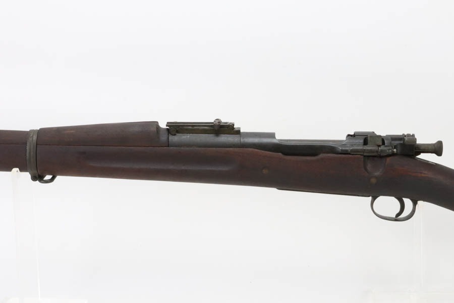 11/4/24 – This is an ultra rare, one-of-a-kind grouping of 10 Springfield Model 1903 rifles in their original Raritan Arsenal wood shipping crate. The crate still has its original Raritan Arsenal shipping label that states the original shipment included 10 pieces – we have all 10 rifles here! Eight of the rifles are unwrapped, but two are still in their original wax paper covering (“mummy guns”). The guns have various manufacture years and various arsenal-replaced parts – the barrels are mostly late WW2, many of the parts are WWI vintage, and a few of the receivers feature hatcher-holes. Five of the guns have period-correct leather slings. Generally, the guns are in very nice, un-issued condition, showing very little sign of actual wear. However, the guns are generally dusty, dirty, and some parts are covered in cosmoline. We are confident the guns will clean up very nice, but we decided to leave them in their original condition and let the buyer decide what they’d like to do with them. There are some spots of oxidation and light rust on some of the metal parts here and there, but nothing major. The wood crate is in pretty nice condition after all these years, but the top lid is split in half. As you can see, it has its original shipping labels and “Rush Railway Express Agency” sticker. Inside the crate are also some cleaning kits, a glass jar of solder, and a few original dog tags from the GI who acquired this grouping. This is a truly unique piece of history that has miraculously stayed together all these years!