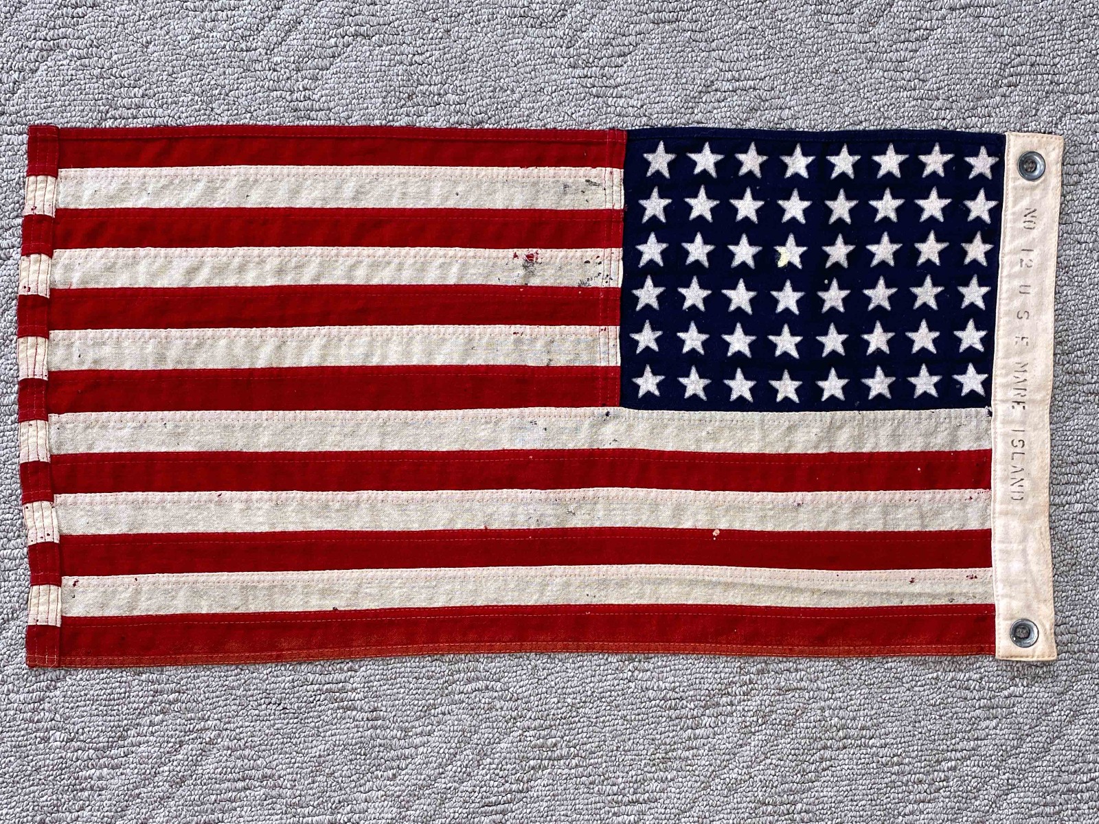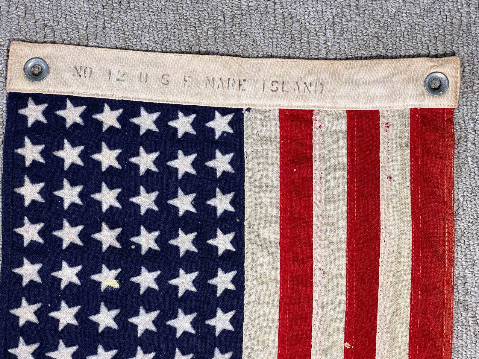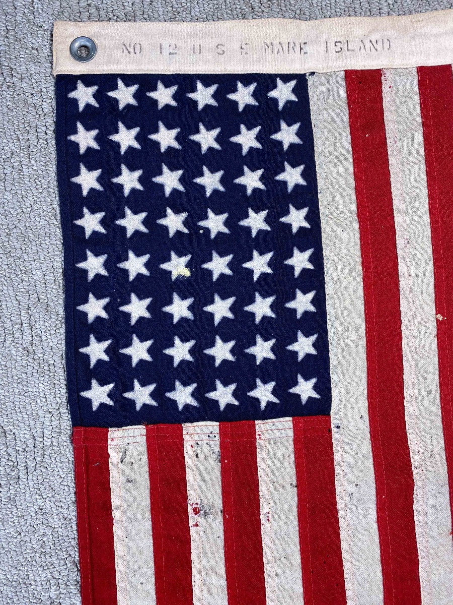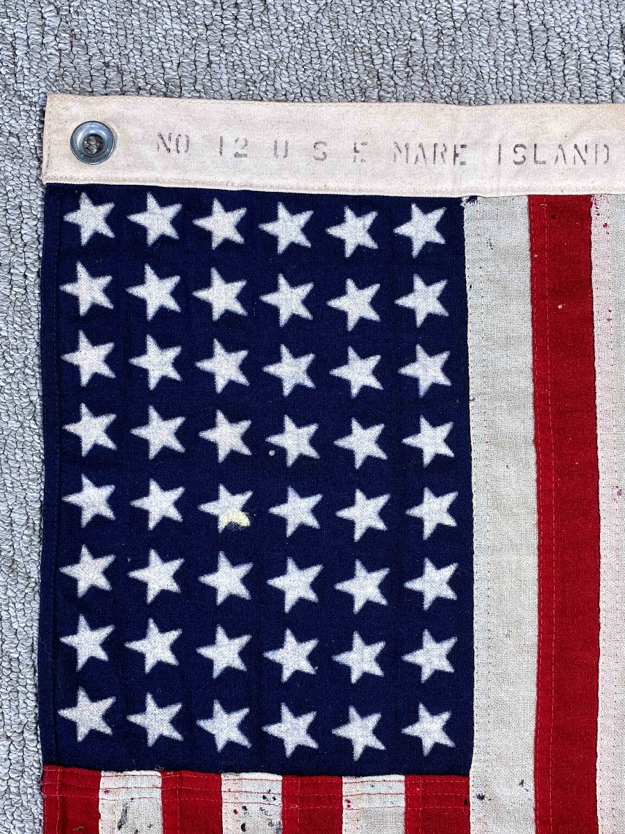 5/20/20 – This is an original US Mare Island flag. The flag is a No. 12, which is the smallest configuration of the U.S. Ensign flags made for the the navy during WW2. The smaller size makes this a great candidate for framing and display. These would have been flown on smaller Navy boats. The flag is 17×31 inches. The header / seam is marked “NO 12 US E MARE ISLAND”. There are some small moth holes as shown in photos. Generally in great condition.