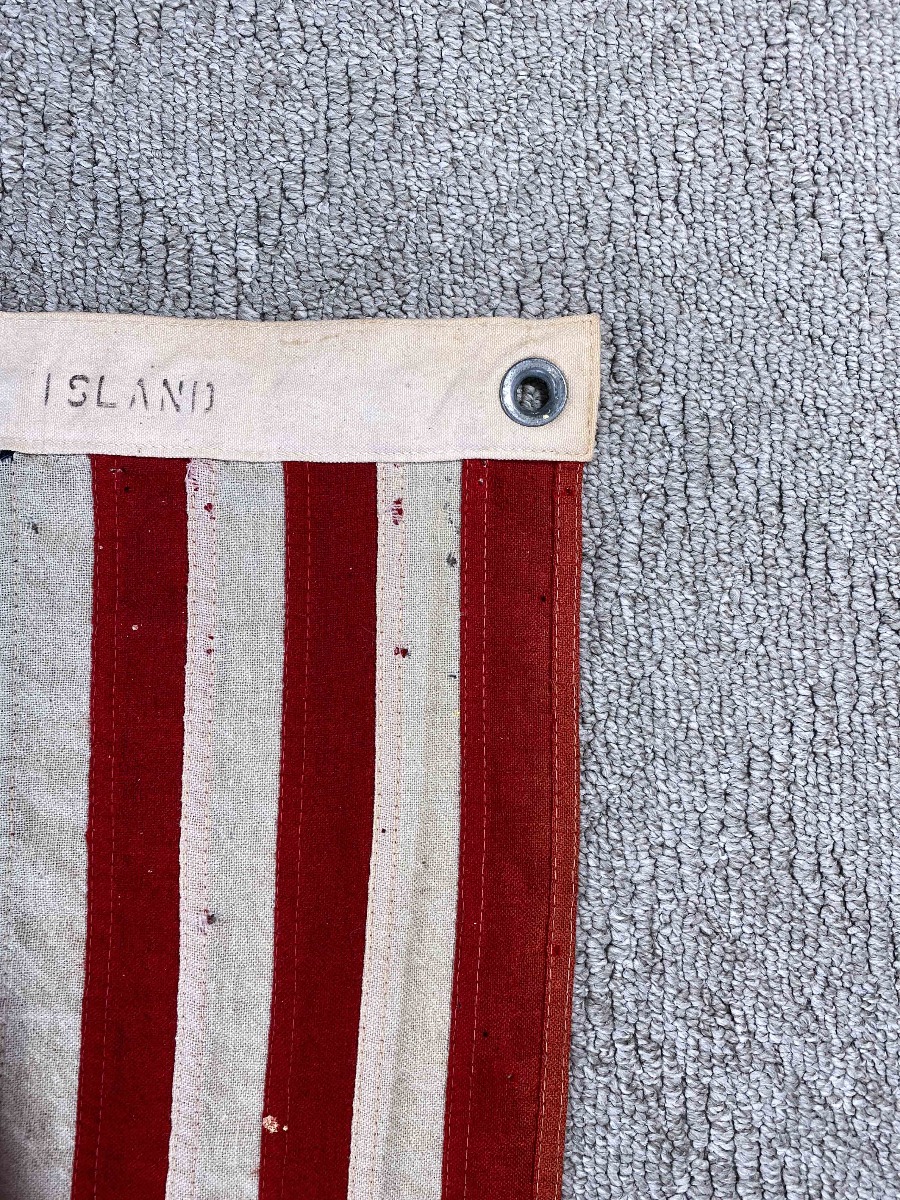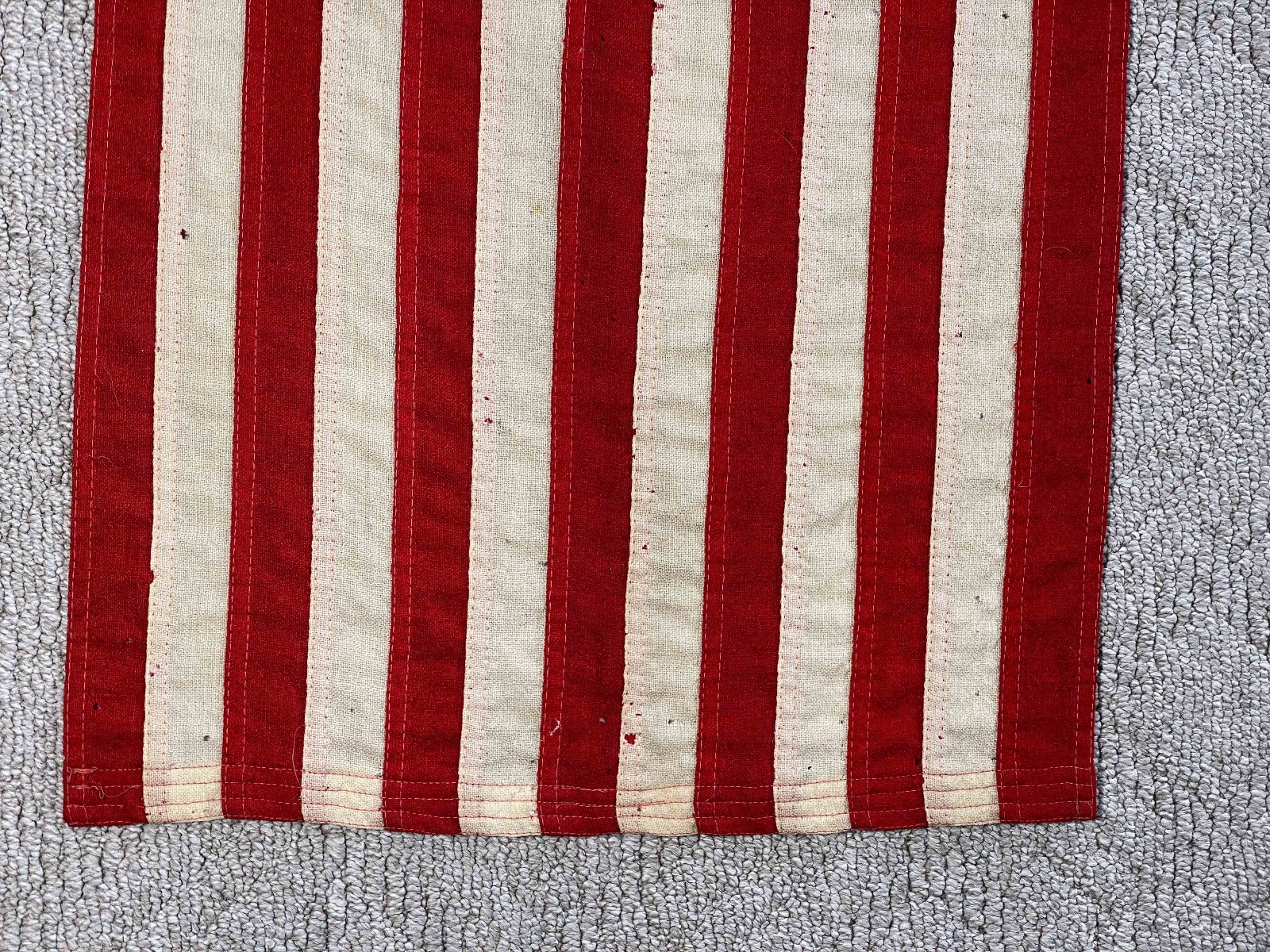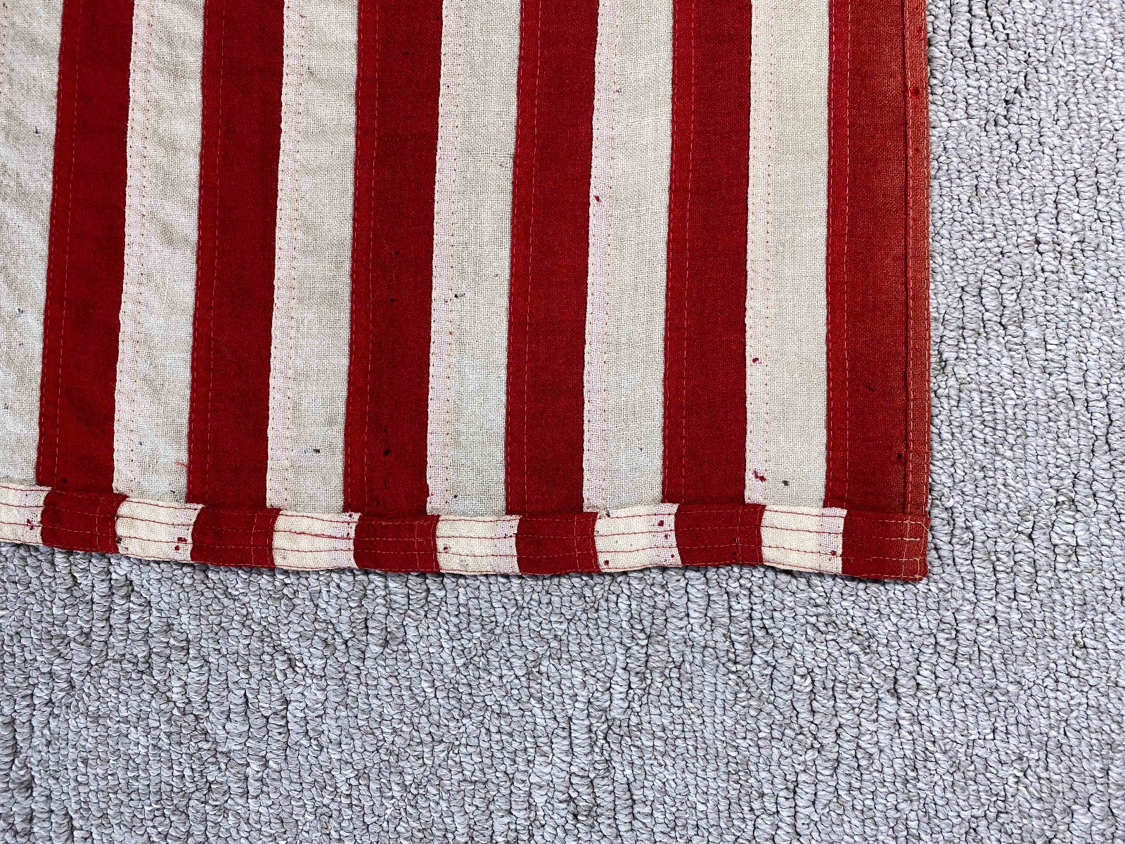 5/20/20 – This is an original US Mare Island flag. The flag is a No. 12, which is the smallest configuration of the U.S. Ensign flags made for the the navy during WW2. The smaller size makes this a great candidate for framing and display. These would have been flown on smaller Navy boats. The flag is 17×31 inches. The header / seam is marked “NO 12 US E MARE ISLAND”. There are some small moth holes as shown in photos. Generally in great condition.