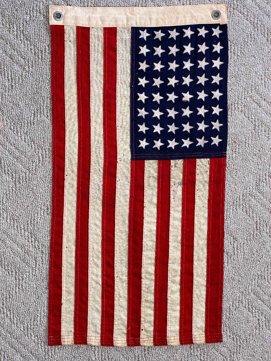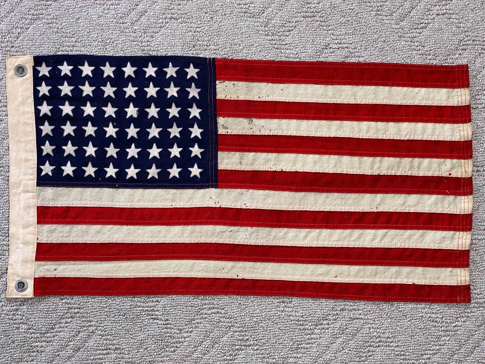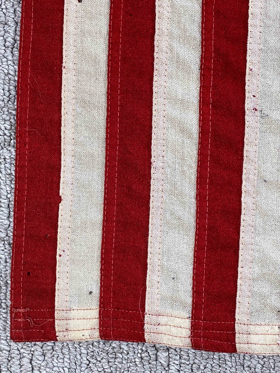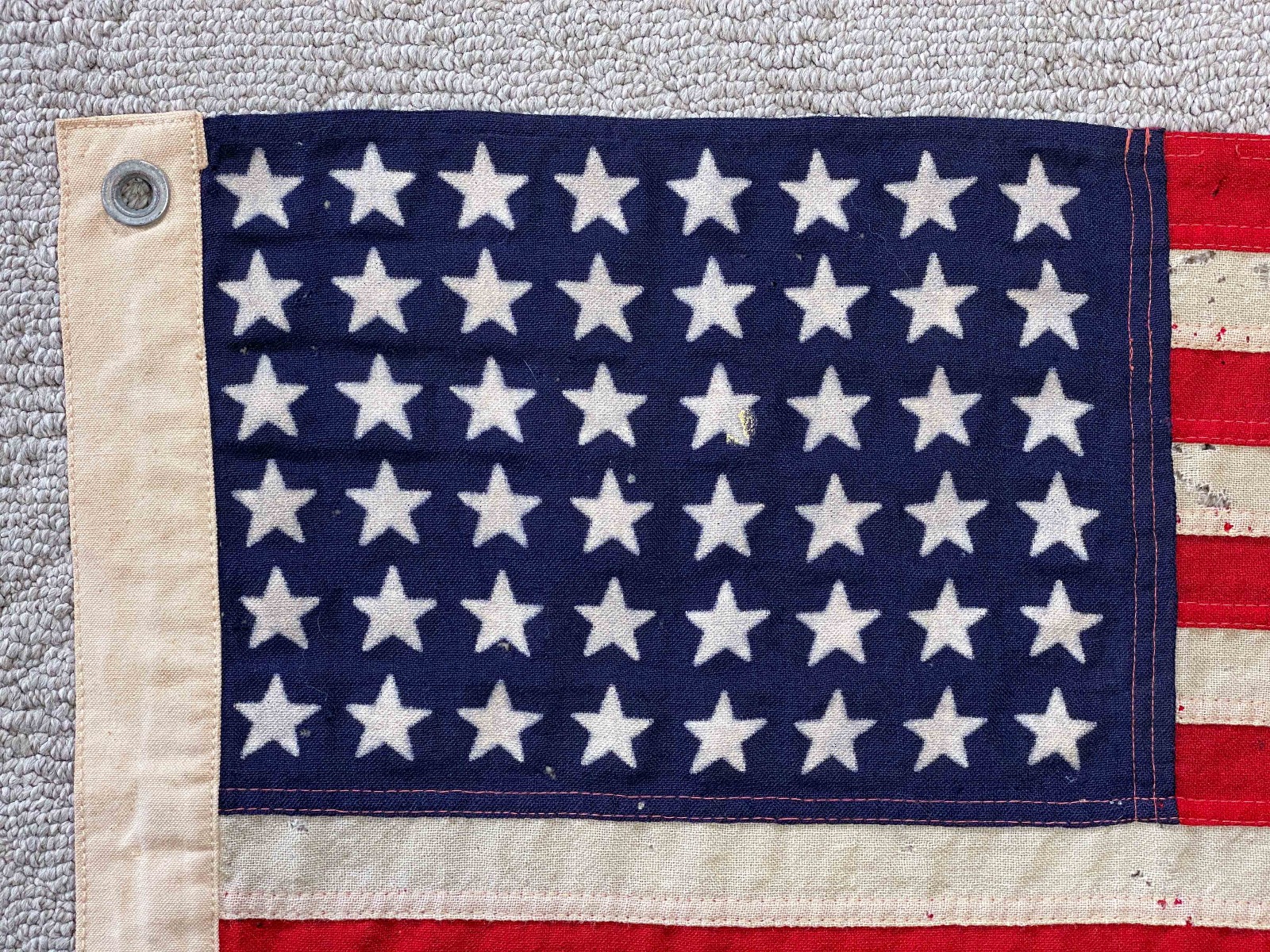 5/20/20 – This is an original US Mare Island flag. The flag is a No. 12, which is the smallest configuration of the U.S. Ensign flags made for the the navy during WW2. The smaller size makes this a great candidate for framing and display. These would have been flown on smaller Navy boats. The flag is 17×31 inches. The header / seam is marked “NO 12 US E MARE ISLAND”. There are some small moth holes as shown in photos. Generally in great condition.