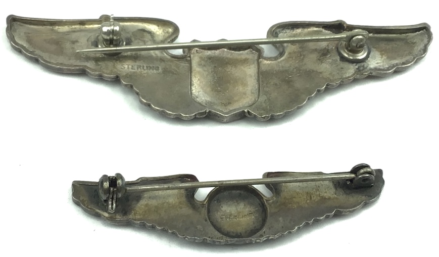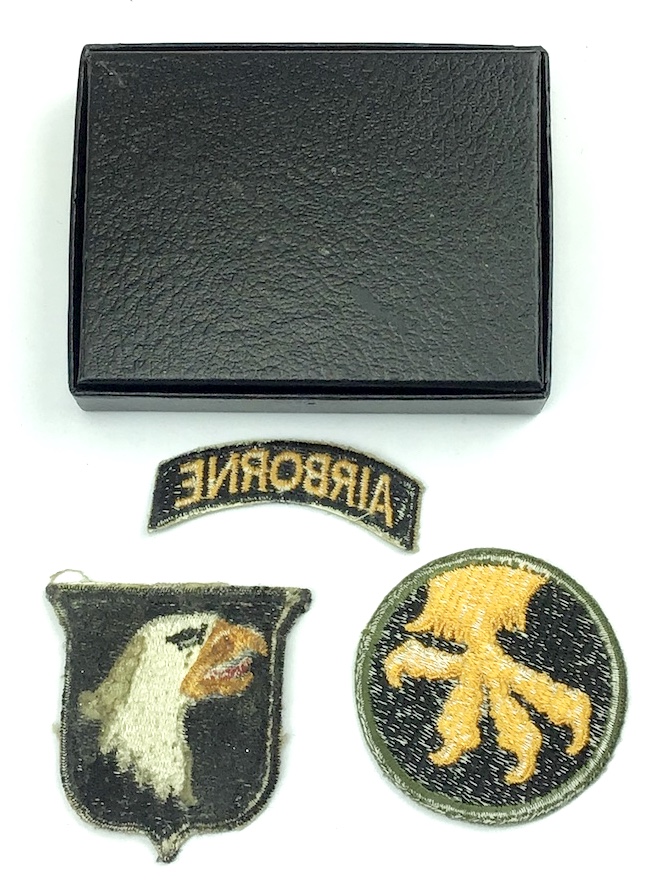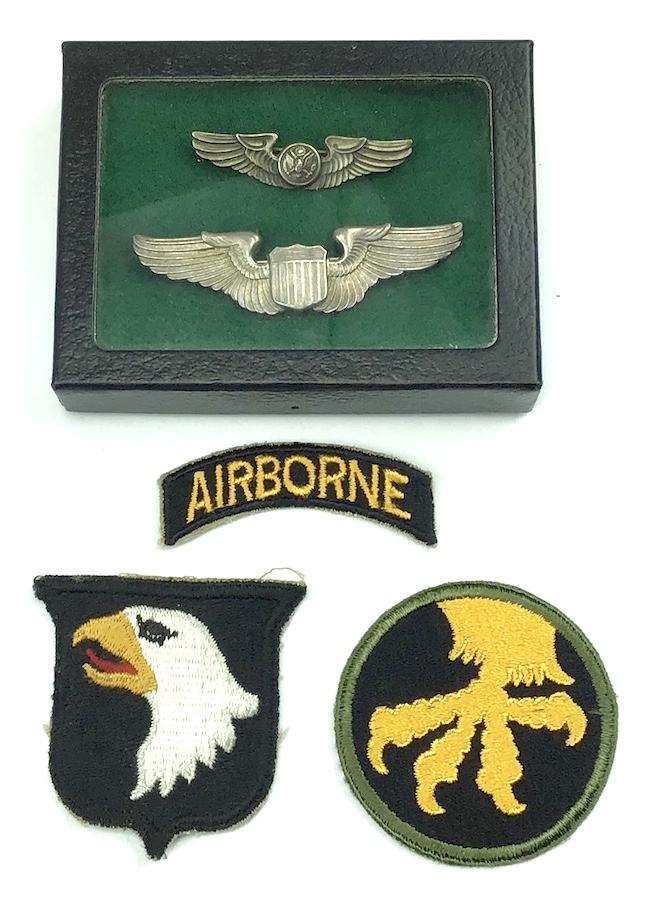 11/12/20 – Original and excellent collection of 101st and 17th Airborne patches, and Air Force wings. The two badges are Pilots Wings and Enlisted Mans Aircrew wings. The 3″ Pilots wings are marked “sterling” on the back with no other markings. The 2″ enlisted mans badge is also marked “sterling” with no other markings. Includes a beautiful showcase. The 101st Airborne Eagle and insignia patch are in great shape as well. Included is an “Eagle claw” patch from the 17th Airborne division. We believe all these pieces are authentic from the WWII era.