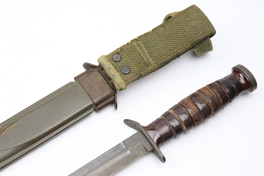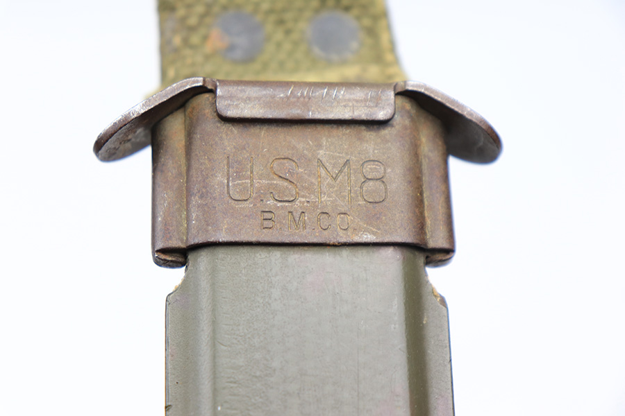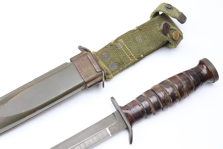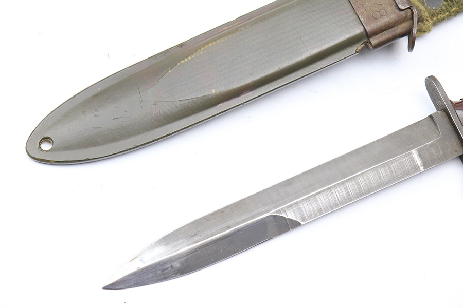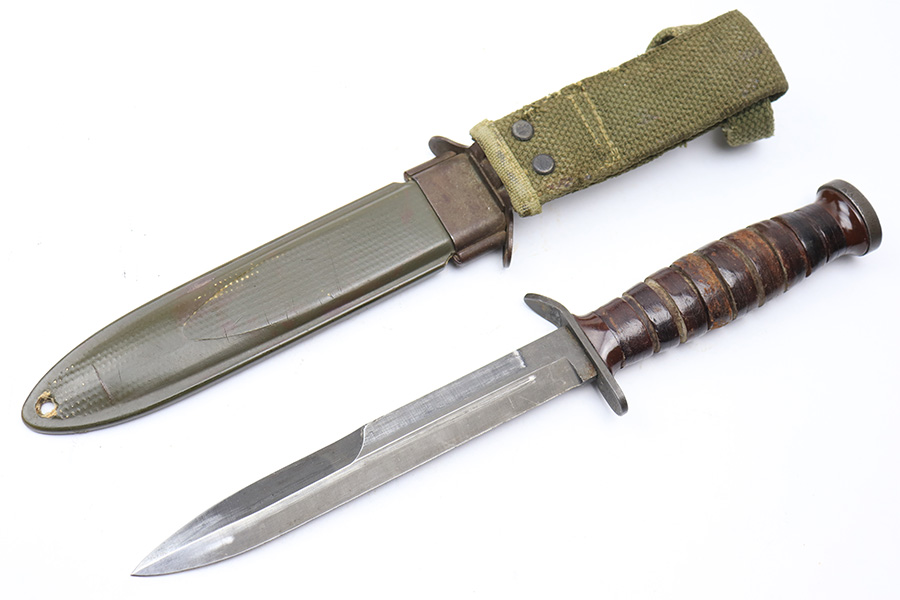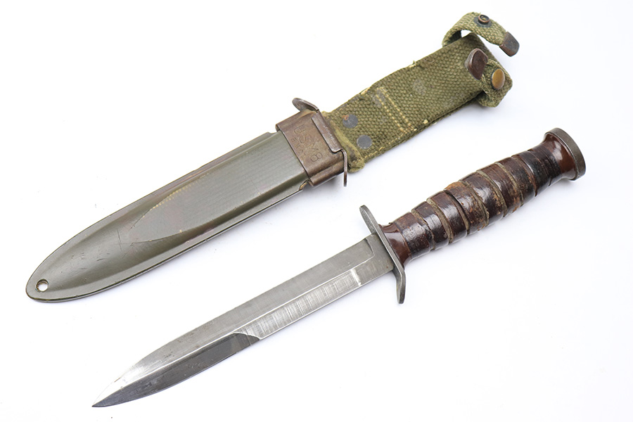 3/15/22 – This is an original US M3 Fighting Knife from WW2. The knife maker stamped on the hand guard, as shown. The handle features early brown spacers and a tight leather grip. Ordnance stamped on the pommel. The blade shows no signs of sharpening and only some mild scabbard wear and finish thinning. Comes with a M8 scabbard. Great overall condition.