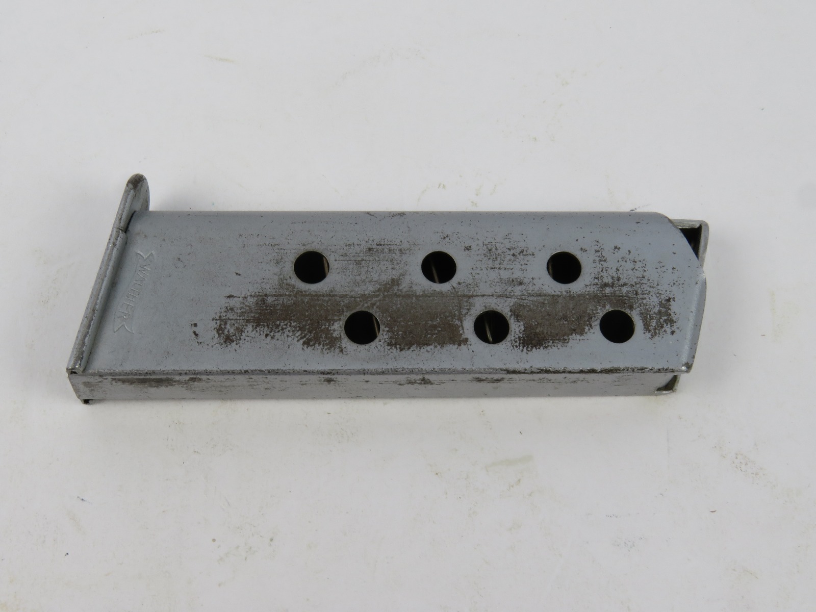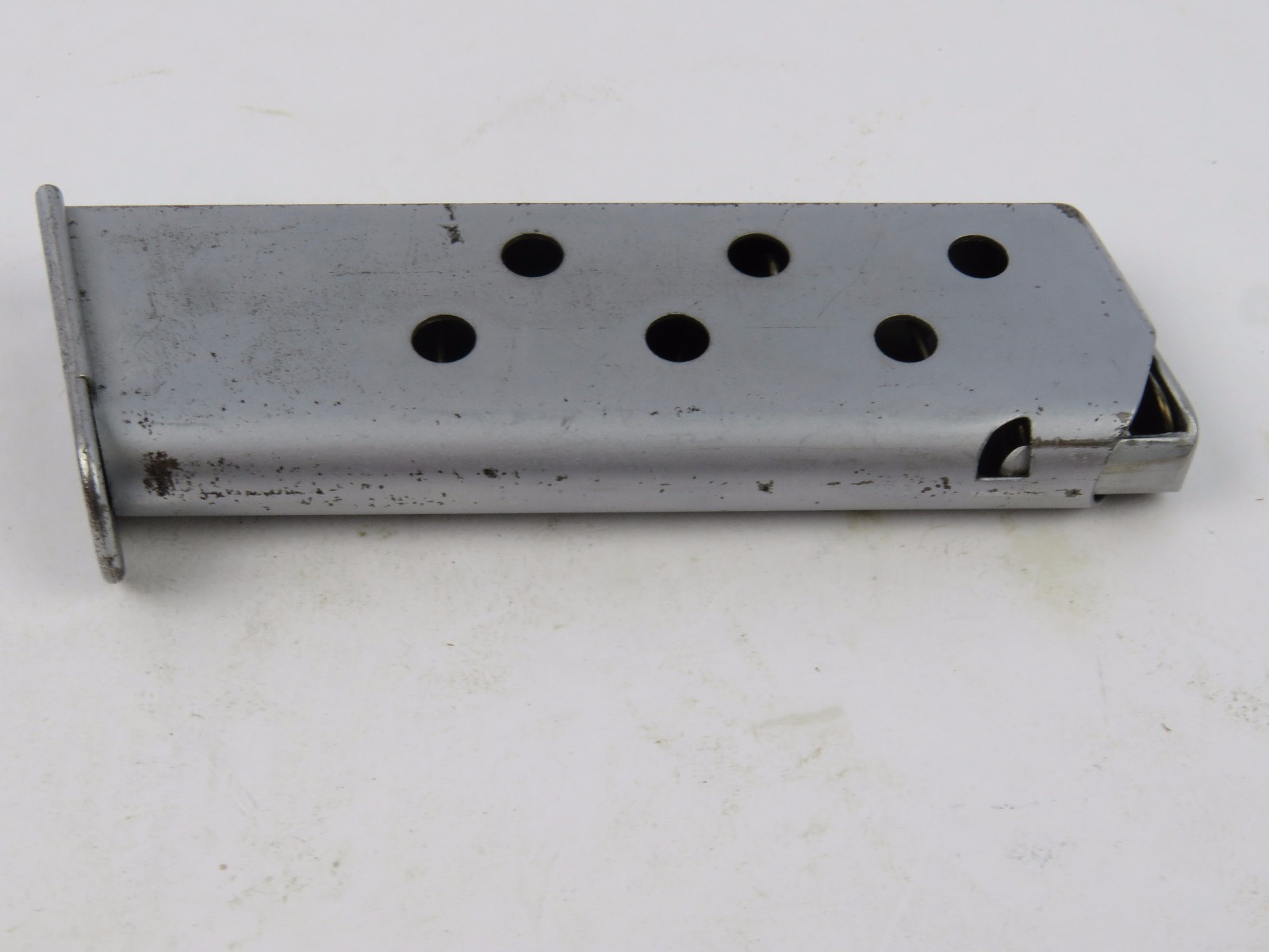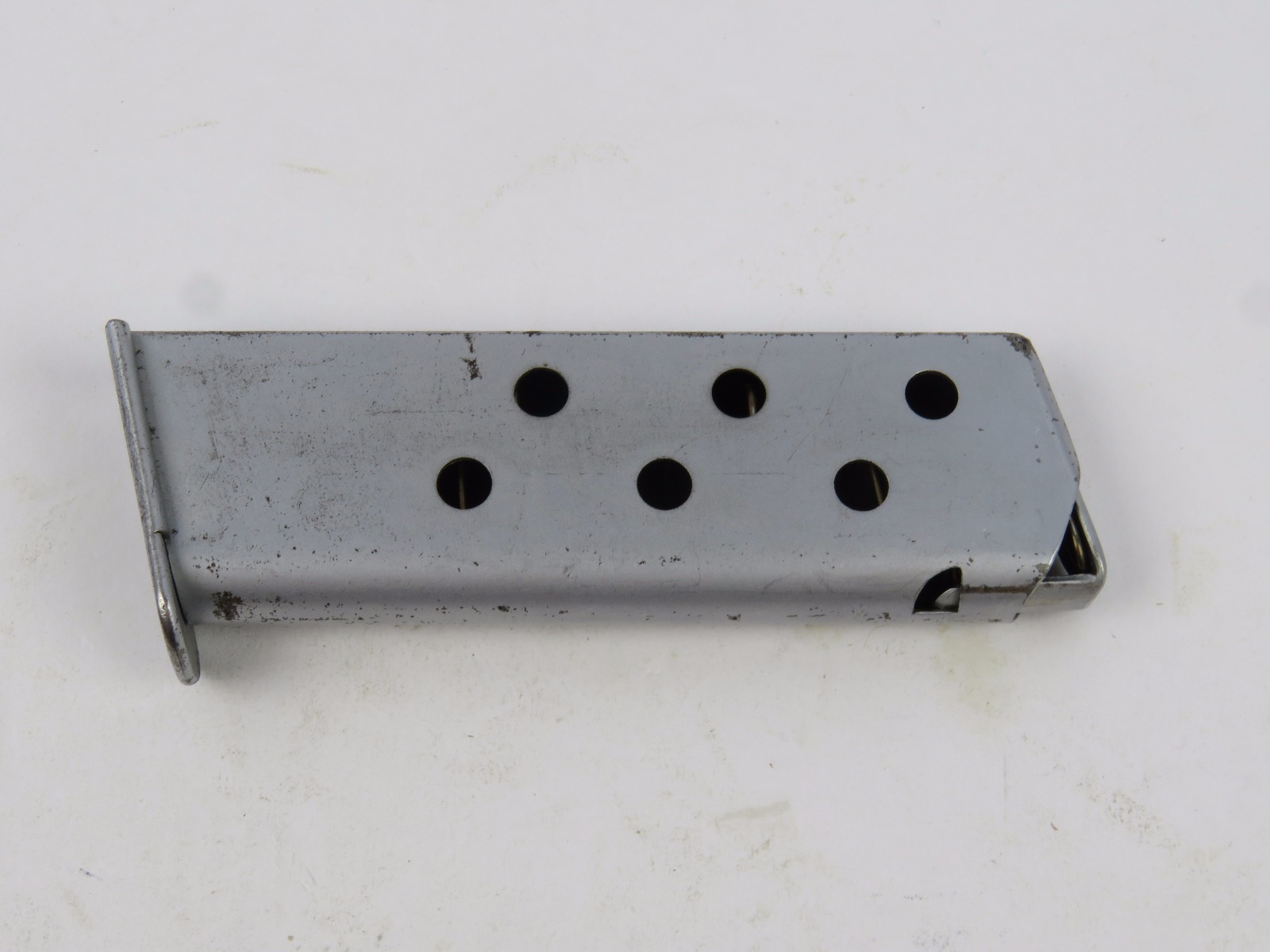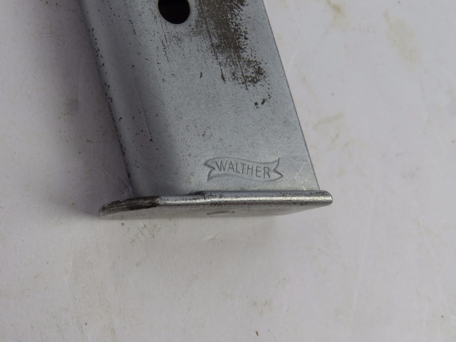 9/20/17 – This is an original WW2 Walther PPK magazine, in very rare Verchromt finish. The verchromt finish is a dull satin that was experimental for the expected wear and abuse a pistol might undergo during wartime. This magazine has a strong, fully functional spring with completely verchromt frame, floorplate, and follower. There is some wear as shown in photos, but overall this is in good condition and guaranteed original.