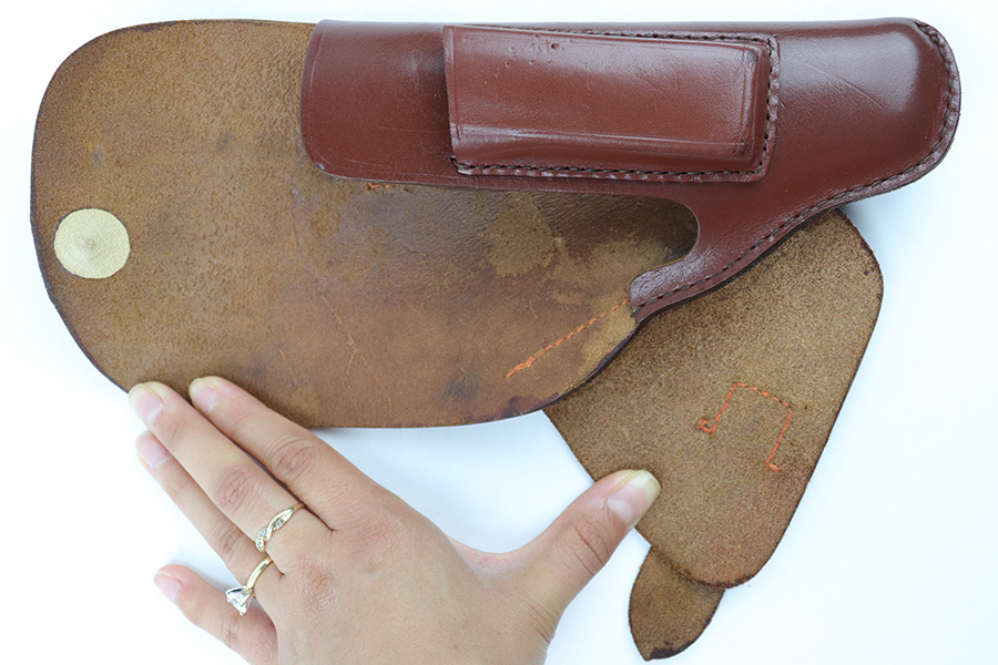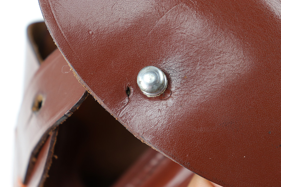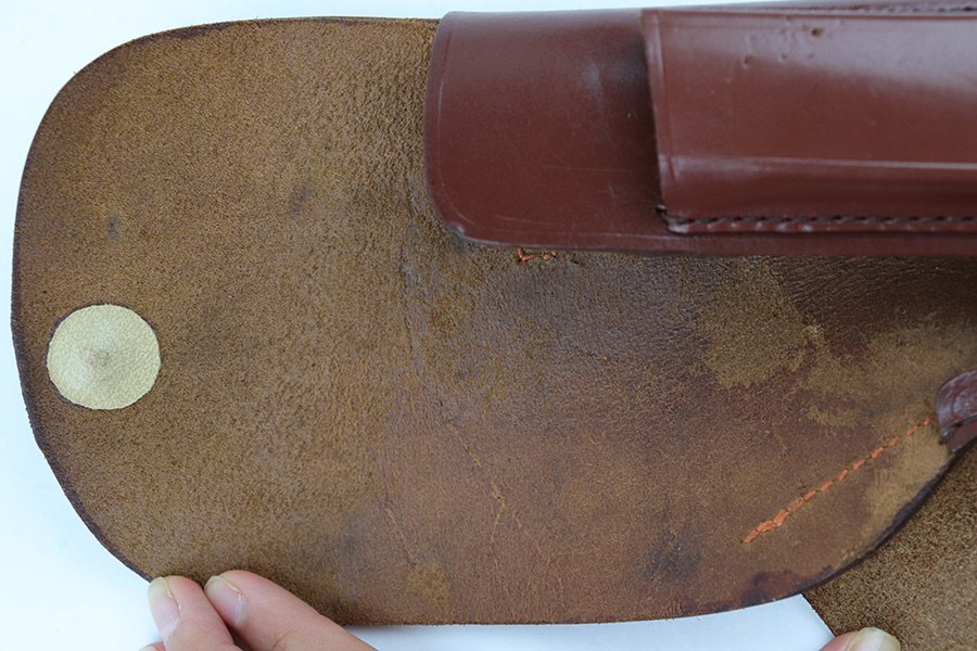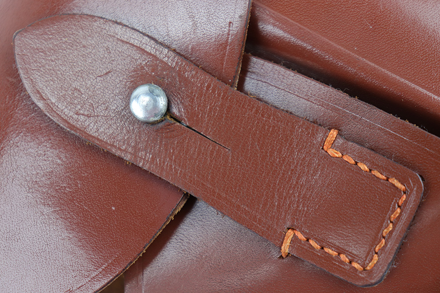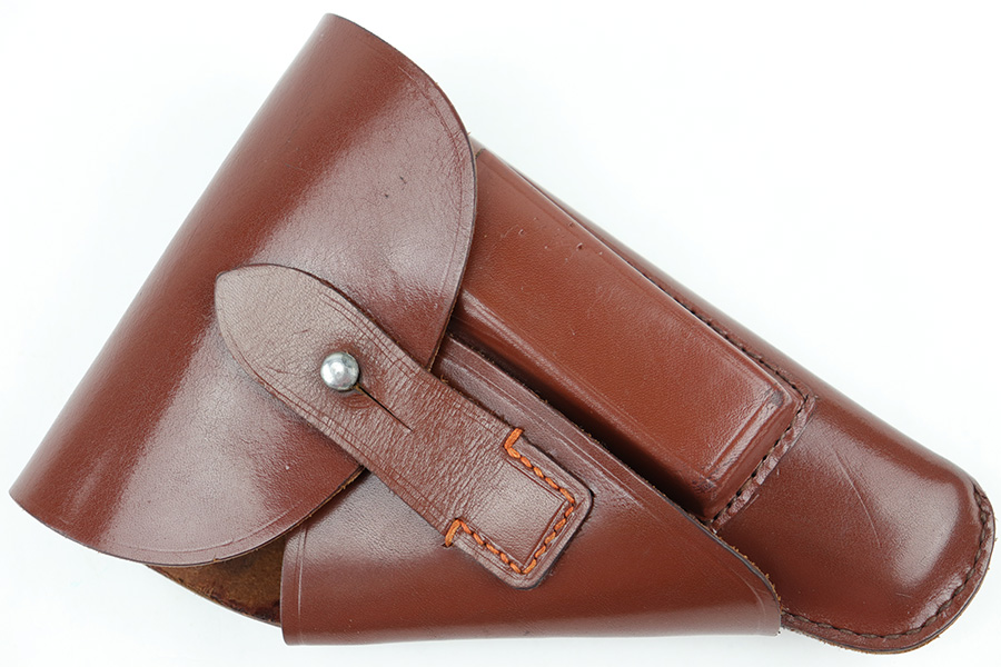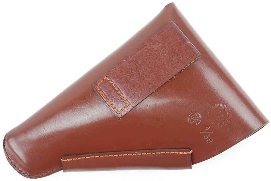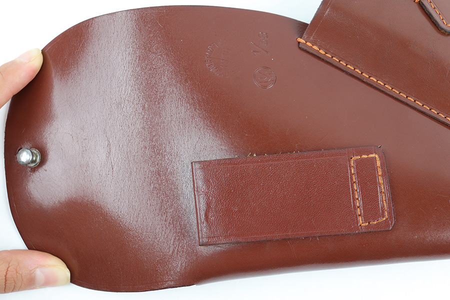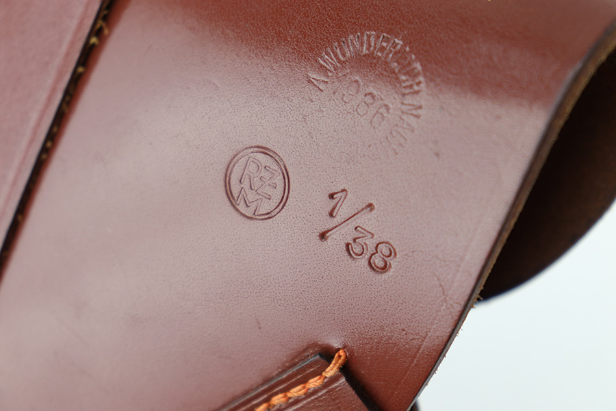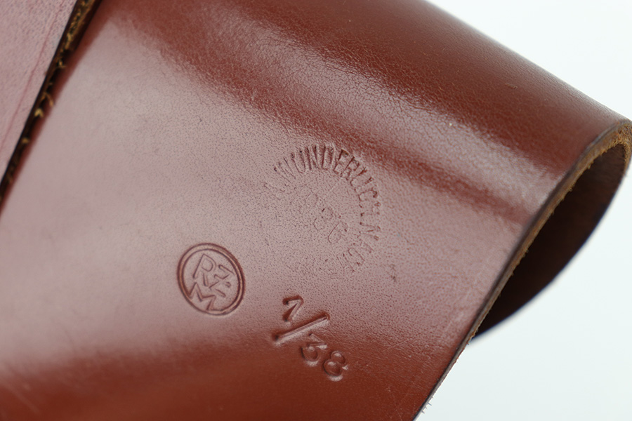 8/13/24 – This is an extremely rare RZM stamped Walther PPK holster from WW2. The holster is in excellent overall condition with beautiful brown leather and a mixture of reddish colored and dark brown stitching. The holster is maker stamped by A. Wunderlich on the back leather with a 1936 date stamp. There’s also a RZM stamp with 1/38, which is likely a distributor number. The holster leather is very clean and strong throughout with some very mild signs of previous use. The interior leather knob cover patch (small white circular patch) is replacement, but this is a minor takeaway. The stitching shows no signs or evidence of tampering, and is tight and original throughout. A very scarce variation holster.
