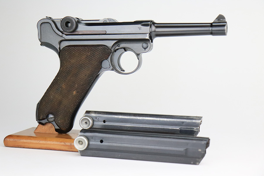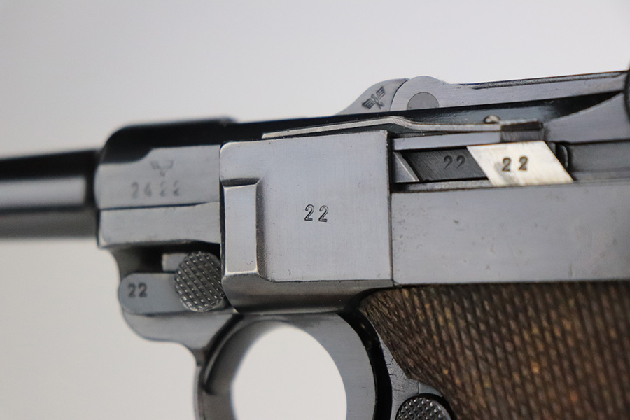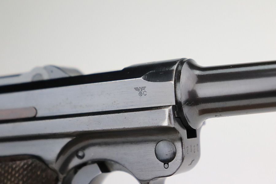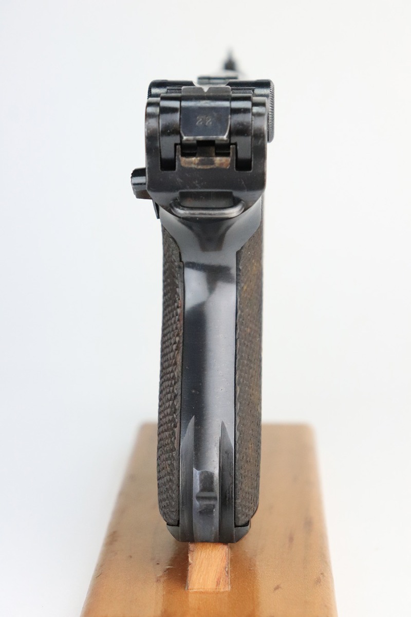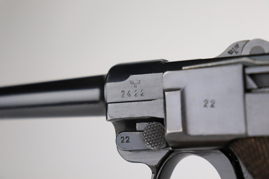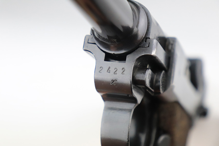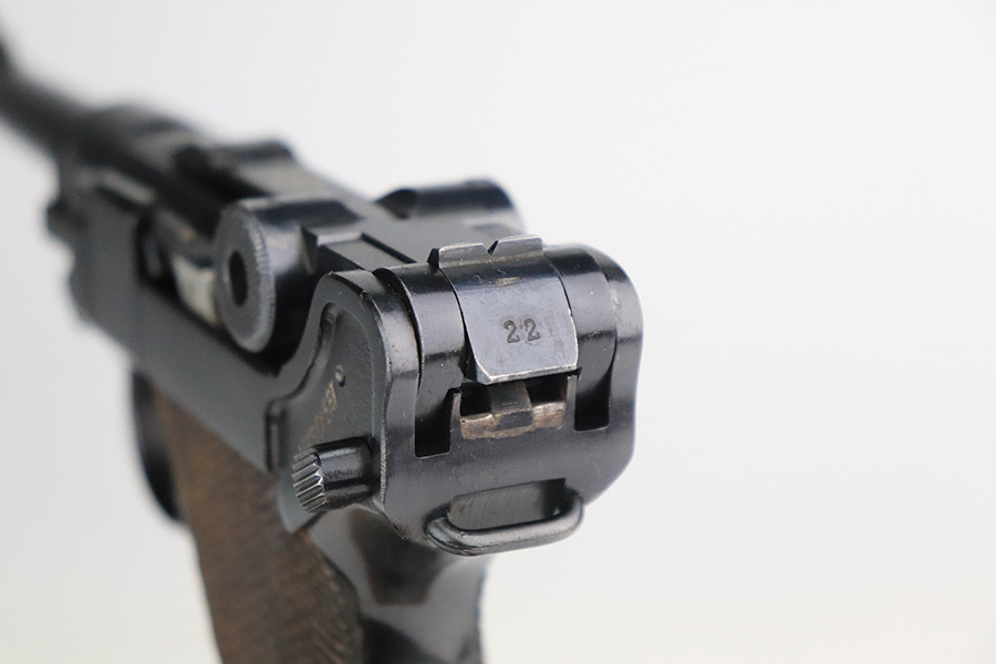 10/22/24 – This is a nice example of a rare Mauser Banner Luger issued to the Nazi police force in 1940. It is all matching and has a police “Eagle C” proof on the right side of the slide. This is a rare variation, as they only made about 2,400 of this configuration. This one also has an added police sear safety and two matching-numbered magazines. One appears to be original, and the other is likely force-matched. We believe the gun has been restored, and some of the markings may have been reapplied. Very little finish loss, just some light scratches on the left side of the frame and on the grip straps. A few tiny dings on the front strap as well. Comes with excellent matching-numbered wood grips. Excellent bore with strong rifling.