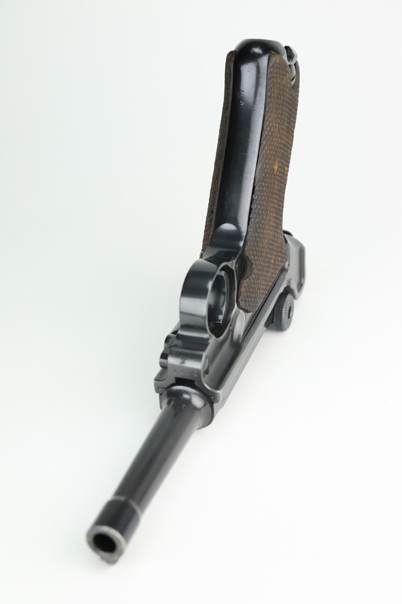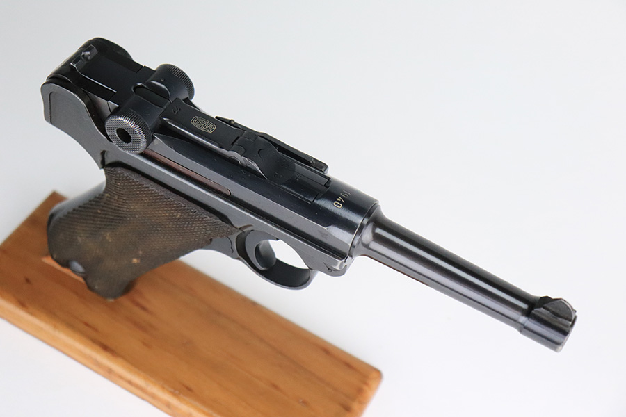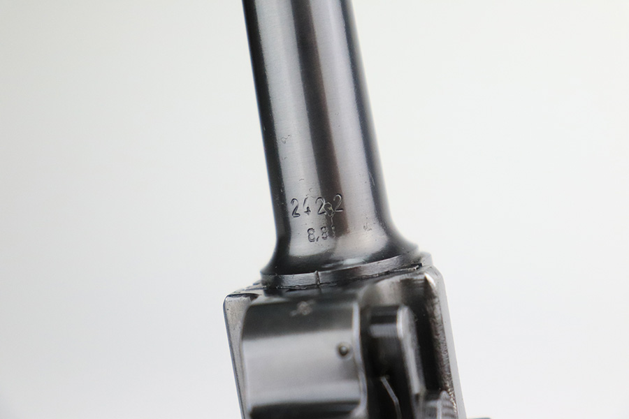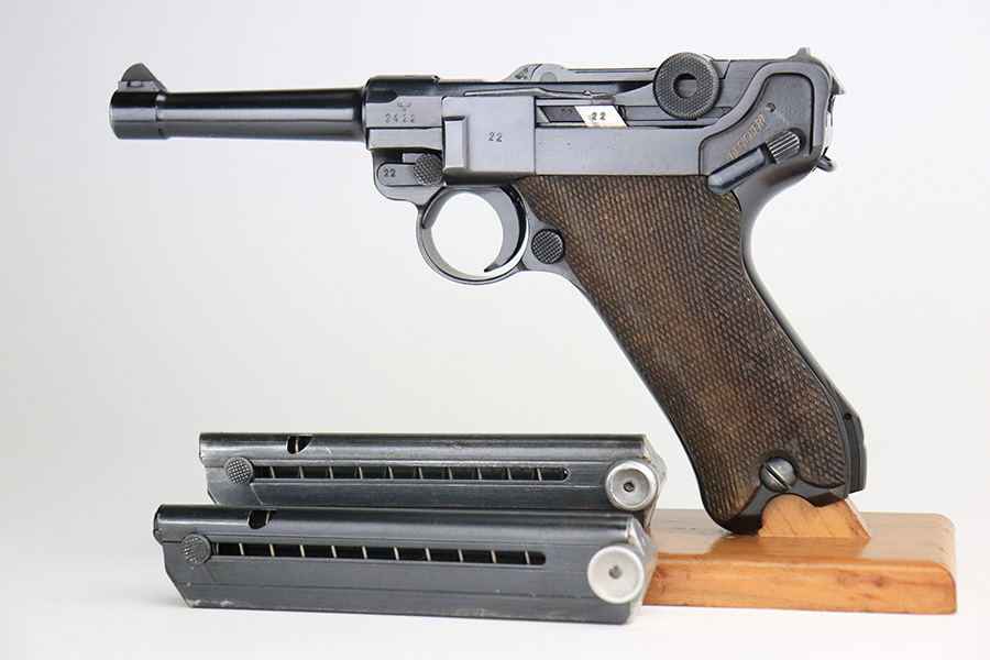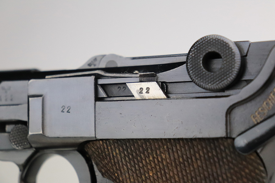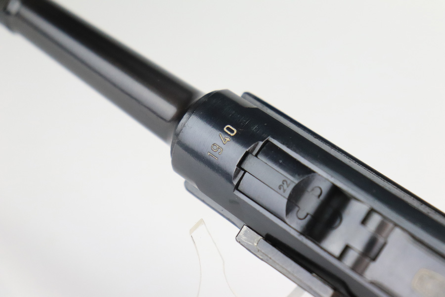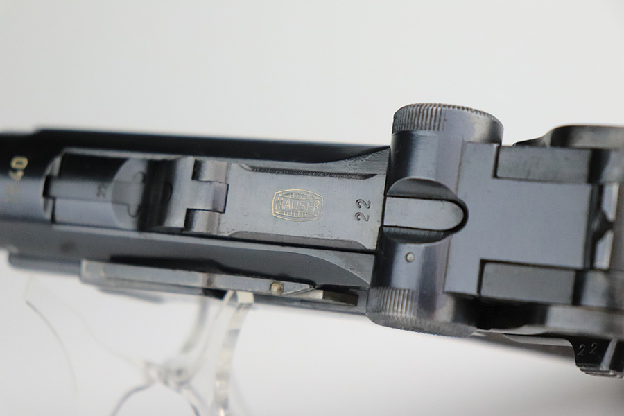 10/22/24 – This is a nice example of a rare Mauser Banner Luger issued to the Nazi police force in 1940. It is all matching and has a police “Eagle C” proof on the right side of the slide. This is a rare variation, as they only made about 2,400 of this configuration. This one also has an added police sear safety and two matching-numbered magazines. One appears to be original, and the other is likely force-matched. We believe the gun has been restored, and some of the markings may have been reapplied. Very little finish loss, just some light scratches on the left side of the frame and on the grip straps. A few tiny dings on the front strap as well. Comes with excellent matching-numbered wood grips. Excellent bore with strong rifling.