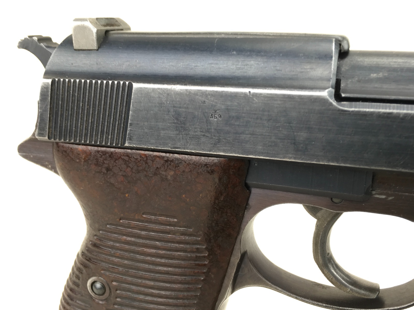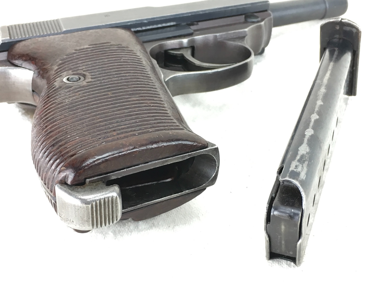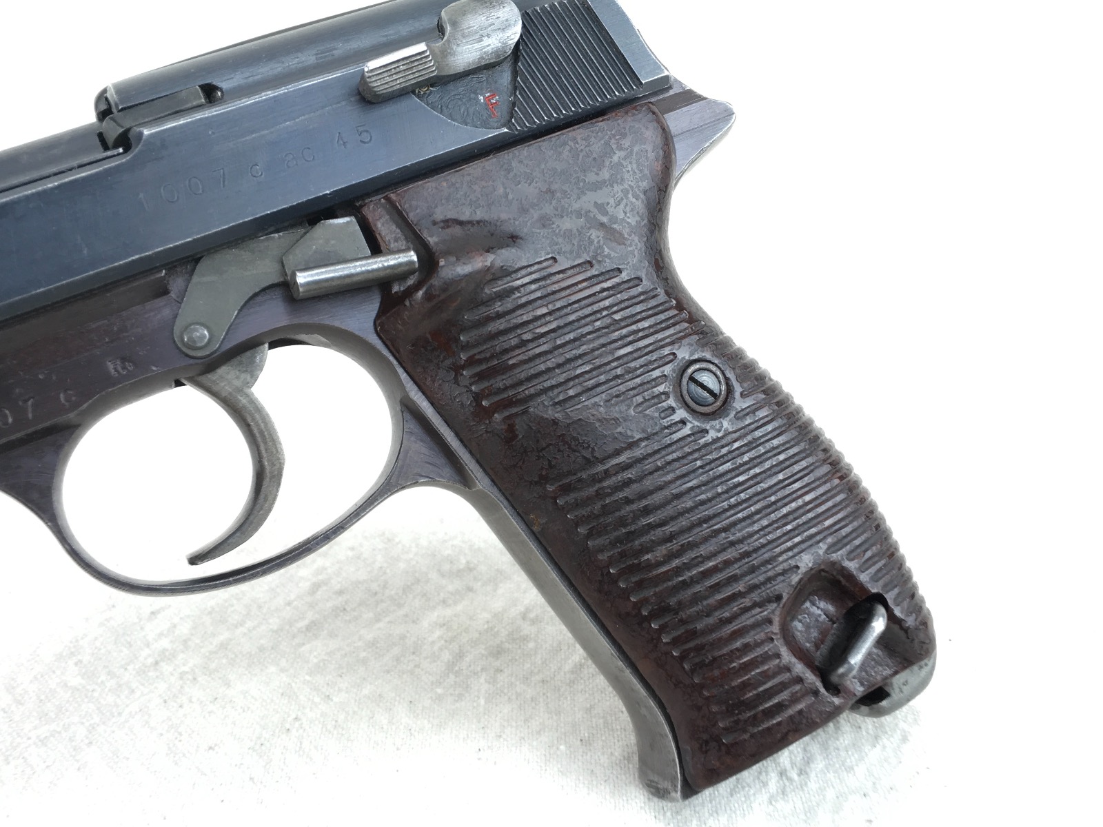 1/8/19 – This is an original late WW2 production Walther AC 45 pistol. The pistol is in about 95% overall condition with some normal edge wear, and light thinning on the slide as well as some more significant bluing loss on the front strap. The pistol is all correct and fully functional with a minty bore. Cog hammer is correct late war part. Has some late/end of war phosphate small parts – as shown in photos (rear sight, slide stop, safety, and magazine release). All matching numbers. Nice plum color on the frame. Grips are in excellent condition with no chips or cracks. Guaranteed original and authentic.