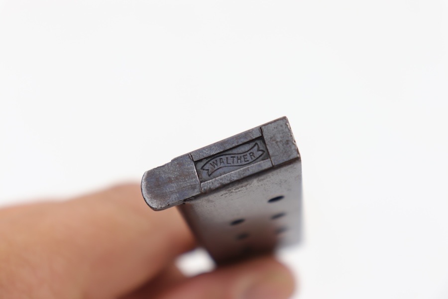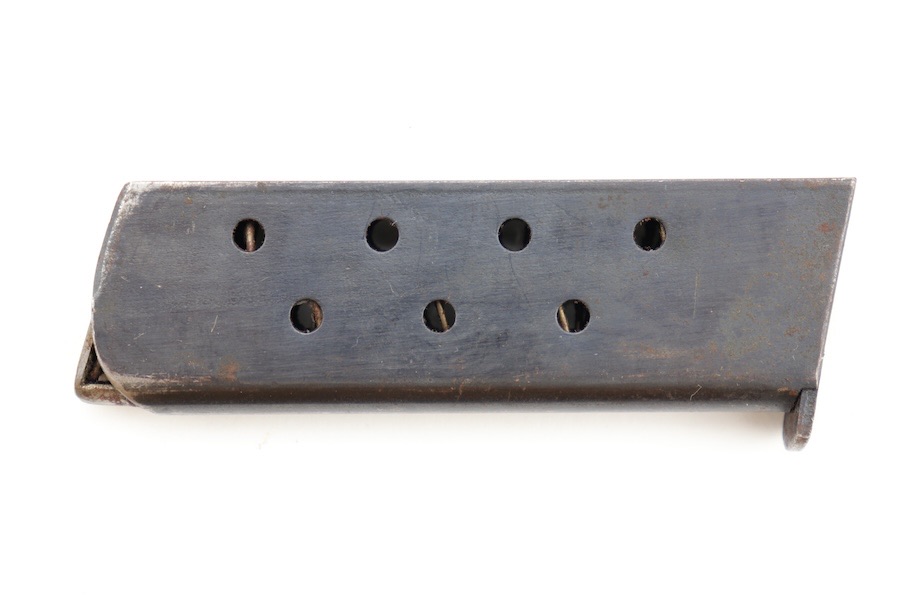 8/15/24 – For sale is a great condition Walther Model 7 Magazine in 6.35mm or .25 ACP. This magazine retains most of its original blued finish, but it does have some finish wear on the spine and belly. Spring has great retention and smooth operation. Walther banner can be found on the footplate.