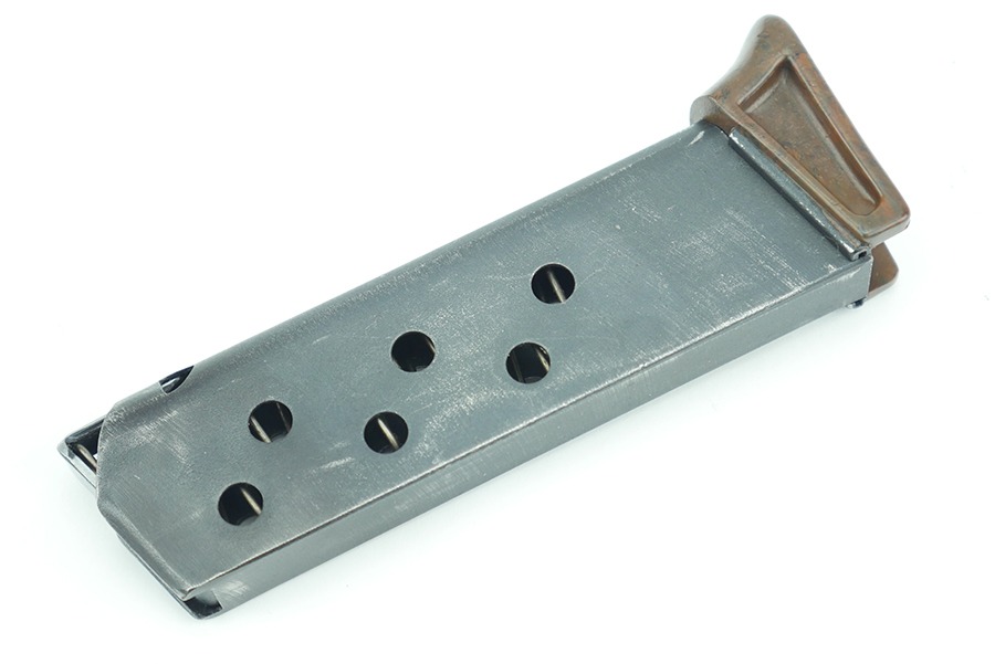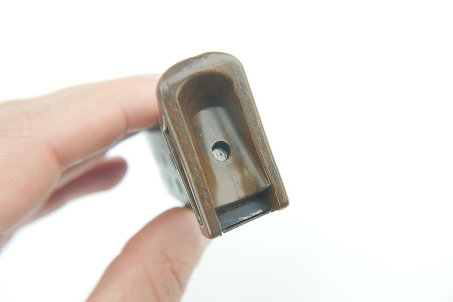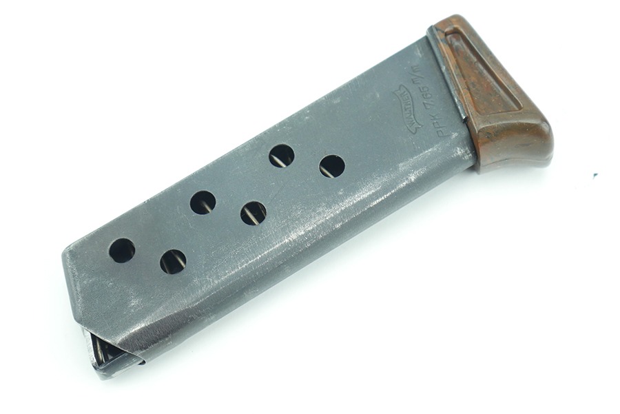 11/1/24 – This is an great condition WW2 production Walther PPK magazine with a brown bakelite finger extension. The finger extension is late war variation with a thick lip. The base has no cracks or chips. The magazine frame is late war production as well with a Walther banner and caliber listed on the frame. The frame has some minor wear from standard use. The spring on this magazine is strong and fully functional.