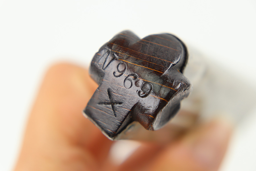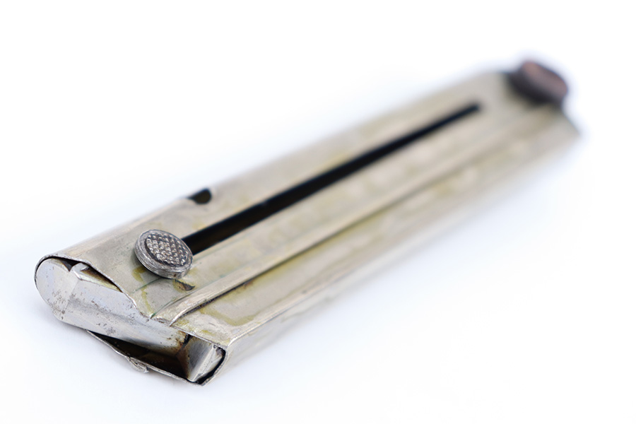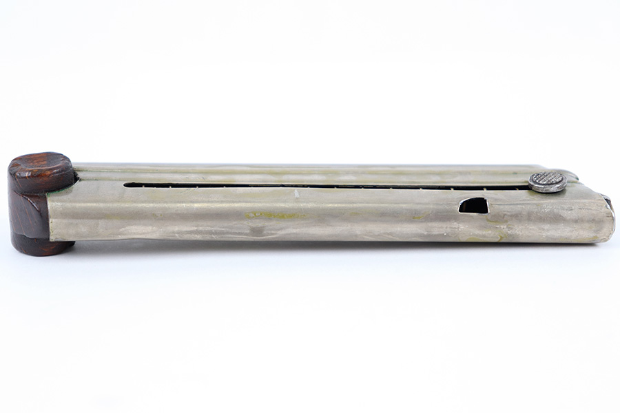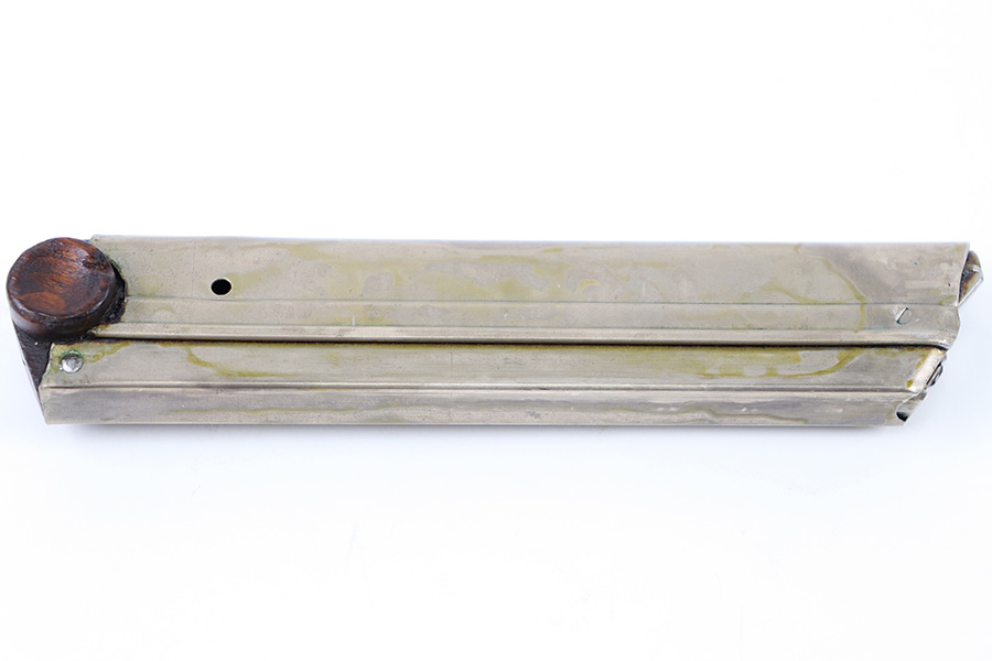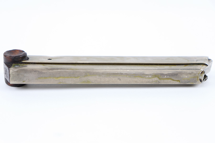 10/4/23 – This is an original post WW1 production Luger magazine with a Navy property stamp on the base. The tube is nickeled but has some light surface discoloration and oil staining throughout. There’s also a few small dents in the tube, but this doesn’t affect fit or functionality. The wood base has a few minor chips on the sides or “ears”, but is in great overall condition. Functional spring.