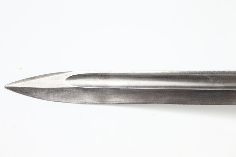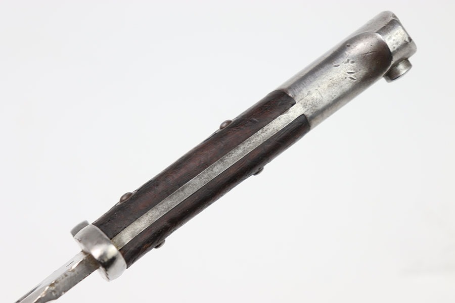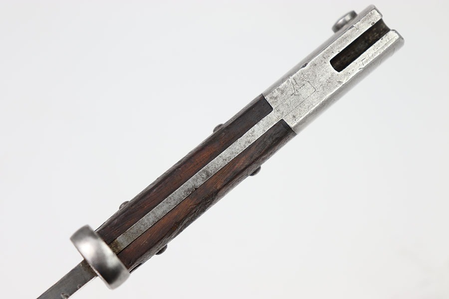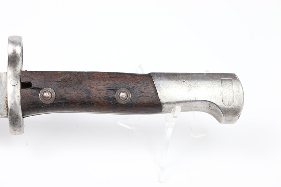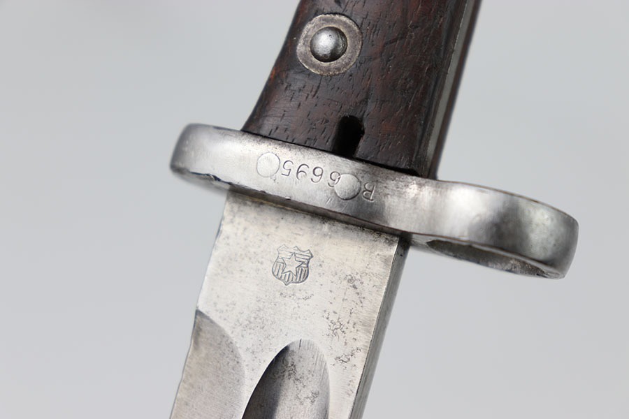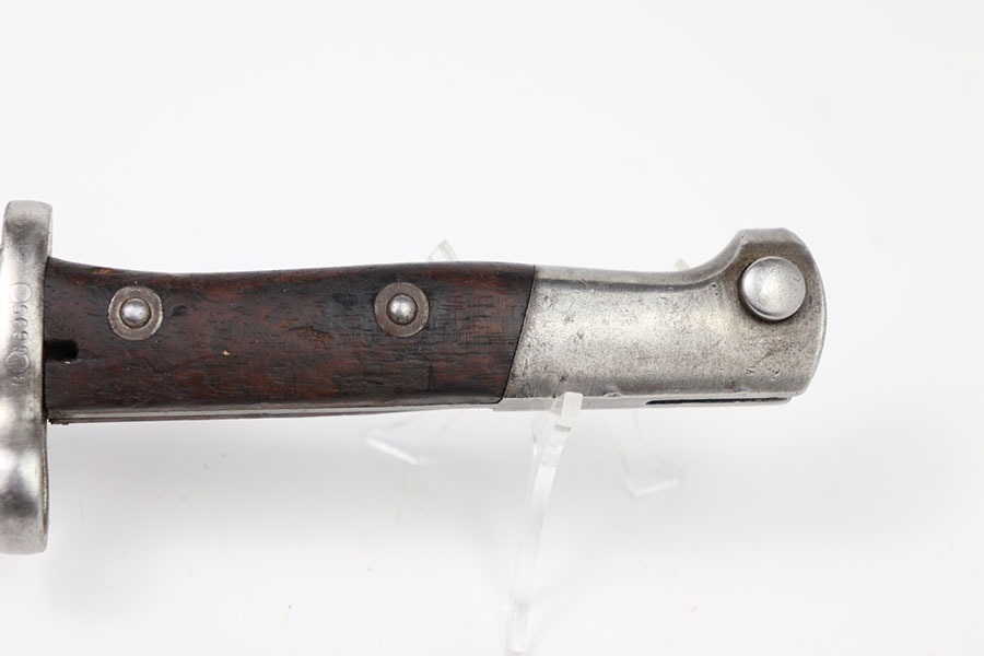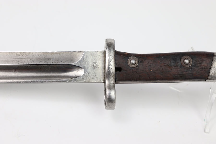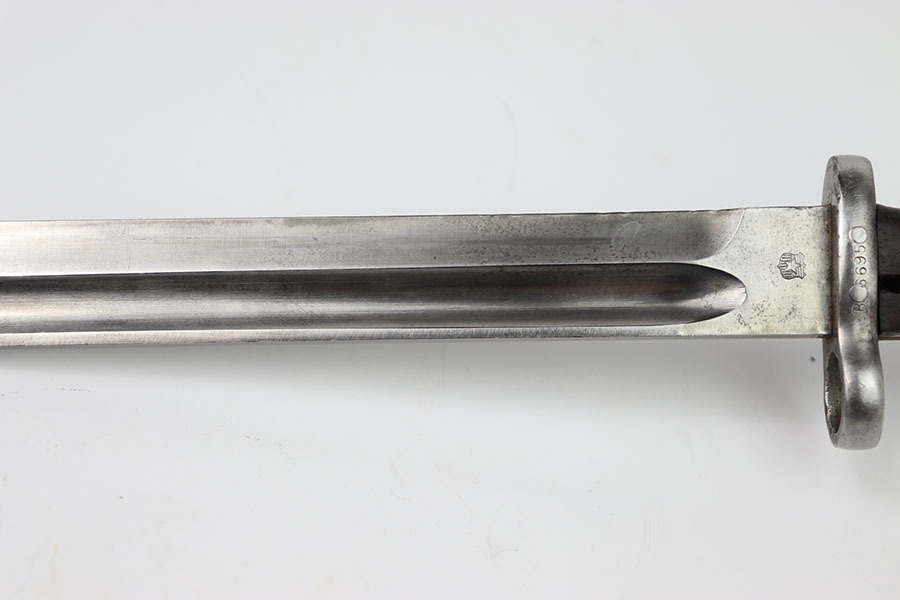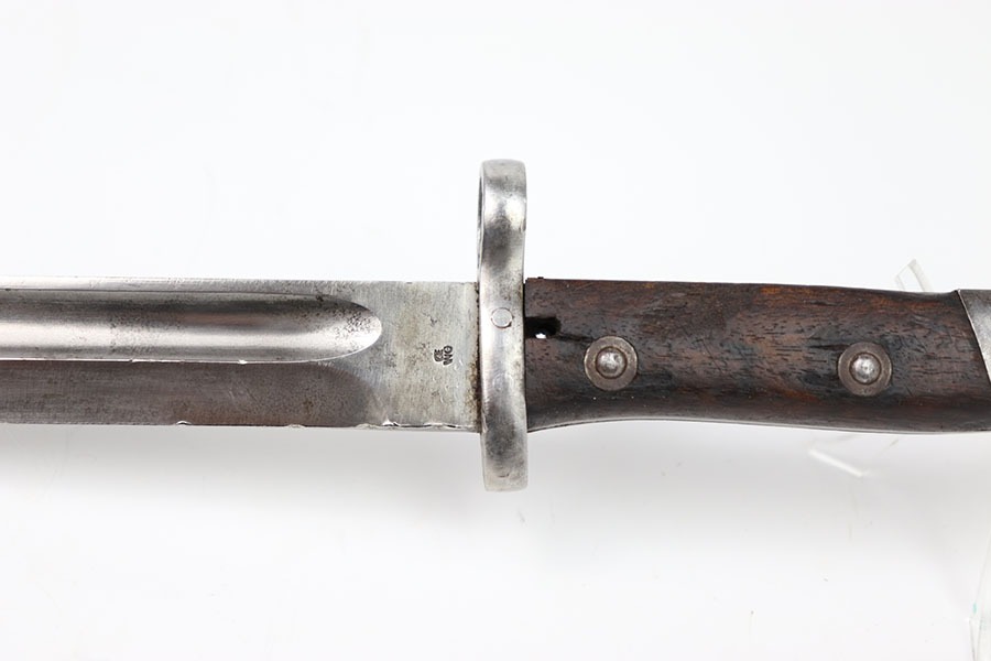 10/24/24 – This is an original Chilean Model 1912 bayonet. This bayonet is in excellent condition with only some light spots of discoloration in the blade. The unsharpened edge has some minor indents in it but no severe damage. The blade is marked on both sides as seen in the photos. The hand guard is serialized with B6695 and in excellent shape. A very nice wood grip with only a few indents. The pommel has some dings but no severe issues. No scabbard is included.