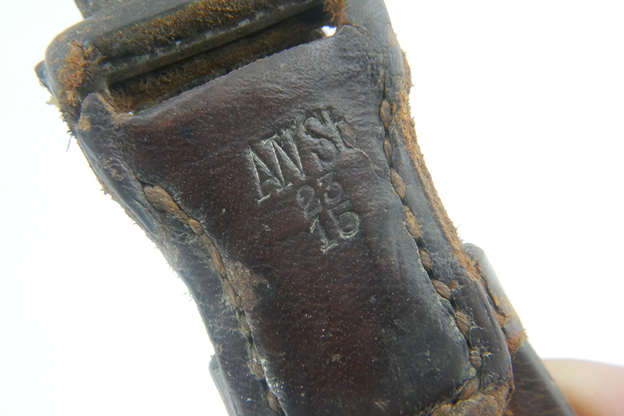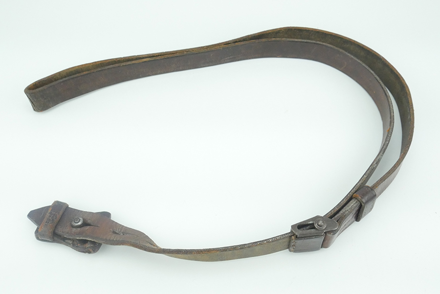 9/9/24 – This is a good example of an original WW1 rifle sling. The leather on the sling is still pliable, there are cracks throughout, but overall the leather is in good condition. The part of the sling with the stud is marked “ANSt 23 15”, this marking is strong and legible. The metal fittings on the sling are in good condition and have appropriate patina for an item of this age.