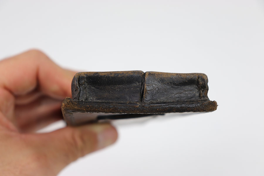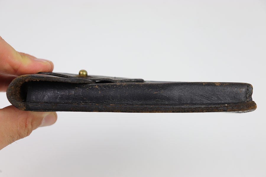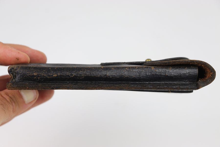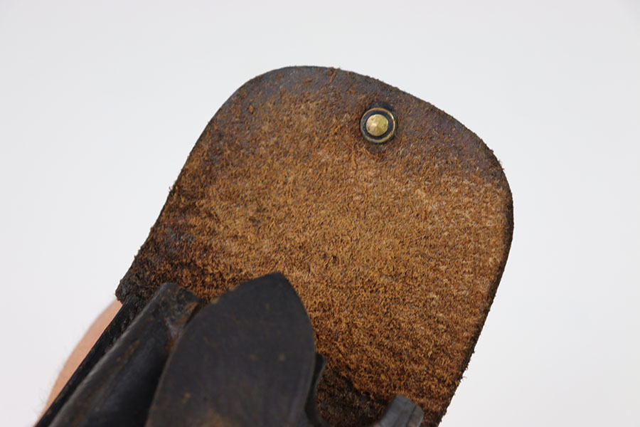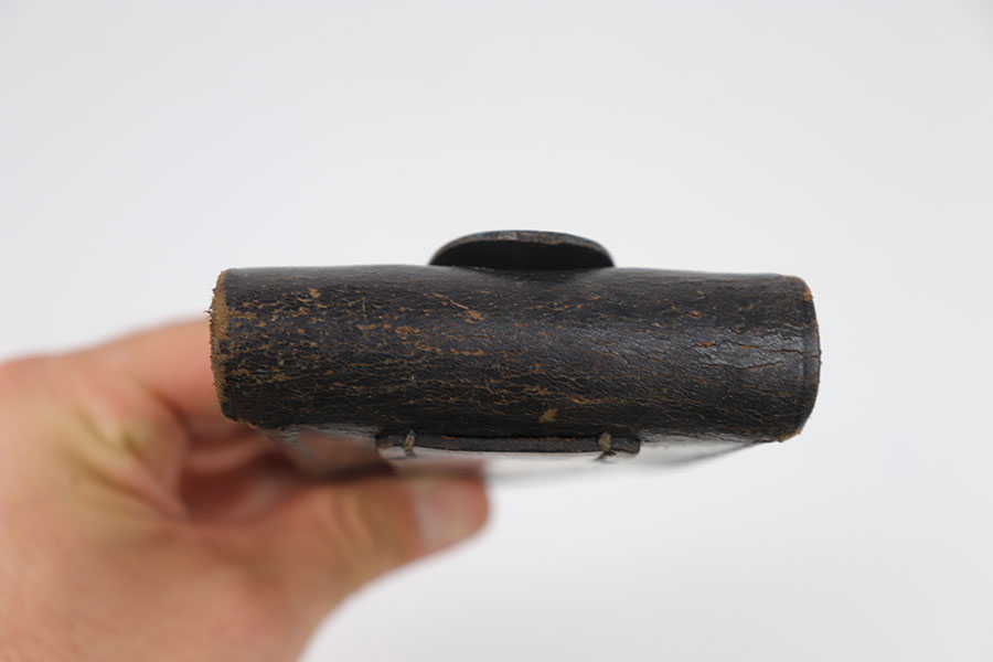 8/22/24 – This is a good example of a Portuguese issue leather double magazine pouch issued with the Portuguese contract M1906 Luger pistols. Full flap with brass stud closure. Single belt loop on the reverse. In good overall condition for its age. Some moderate amounts of wear throughout. No internal markings. all stitching appears to be original and fully intact.