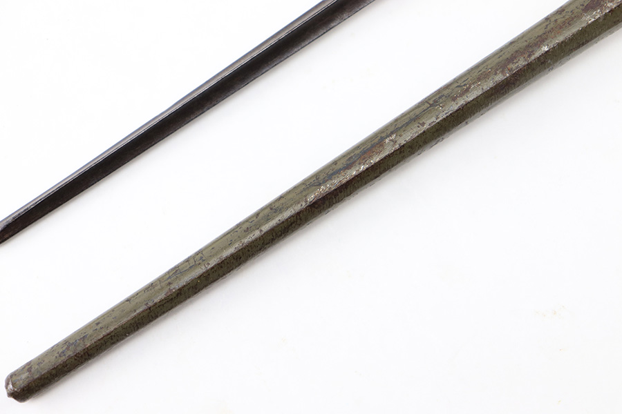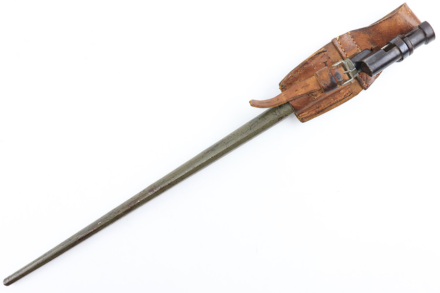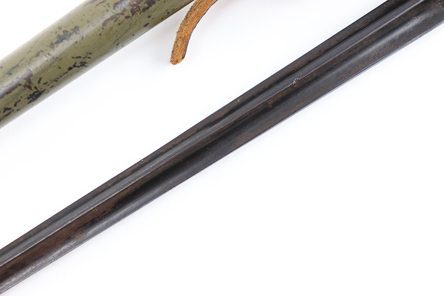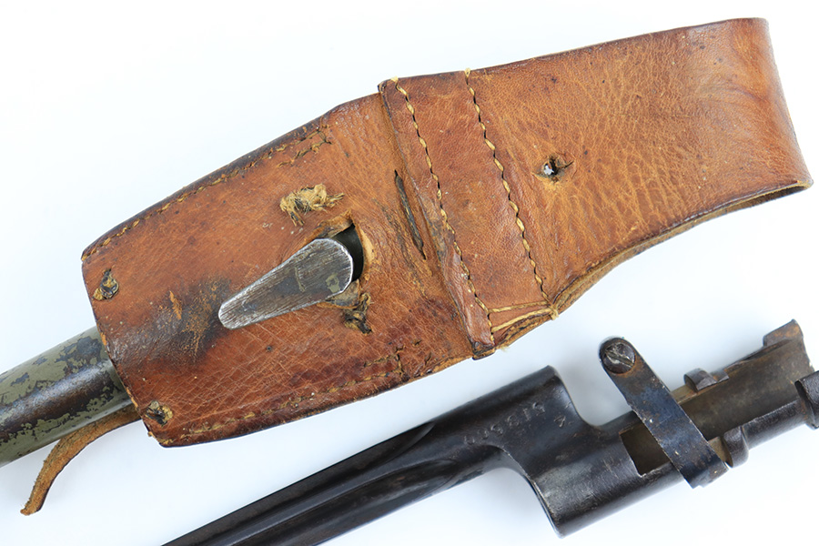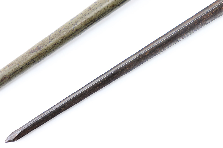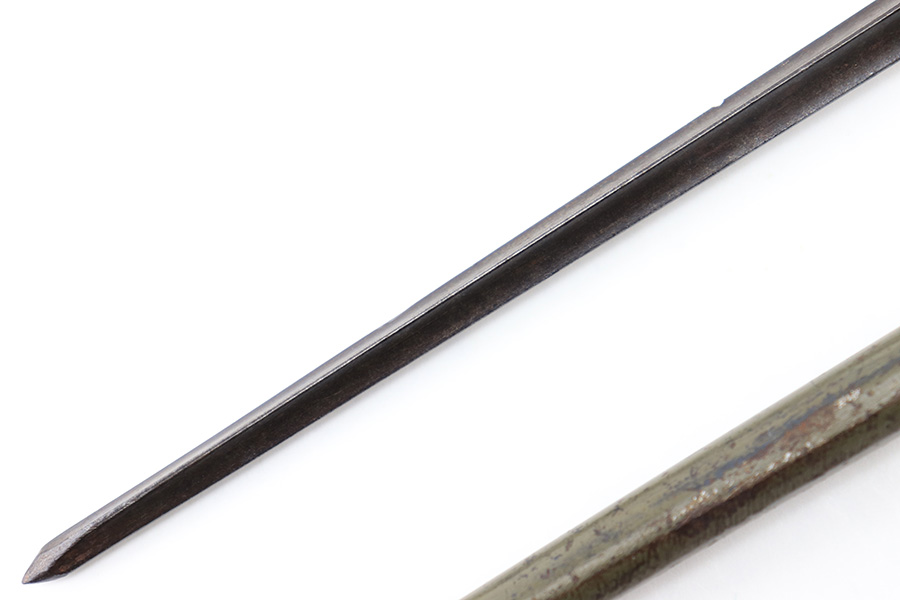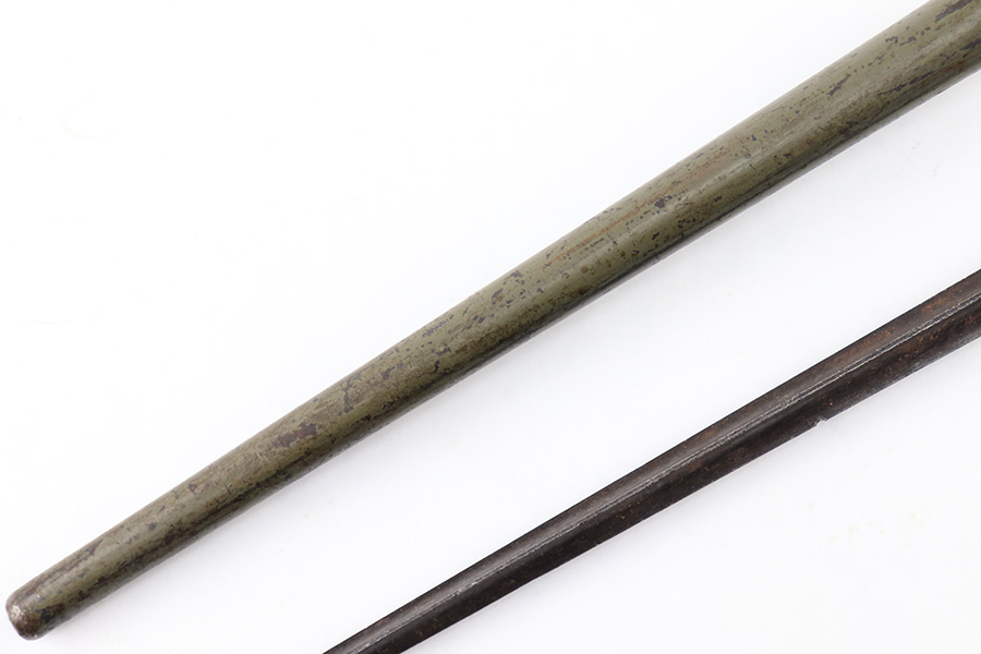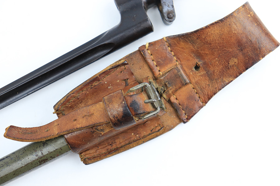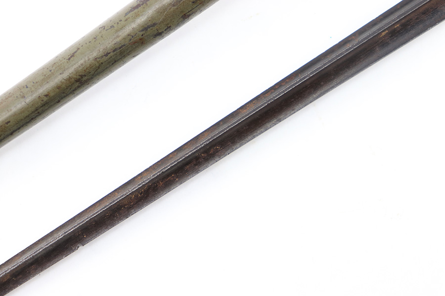 8/18/23 – This is an original WW2 Mosin-Nagant spike bayonet that was captured by the German military. This is indicated by the metal scabbard and leather frog that has an olive green paint. This style scabbard was made and used by the Germans during WW2. The bayonet is in great overall condition with some dark surface patina throughout. The scabbard has light surface wear and typical signs of aging and use, but no major issues. A cool piece of WW2 history.