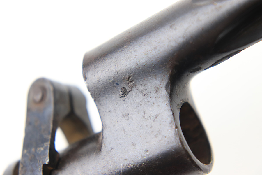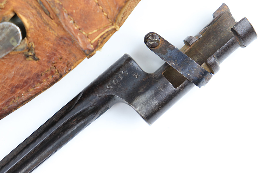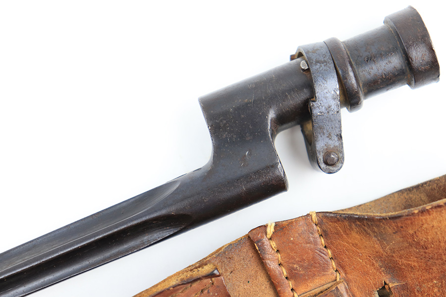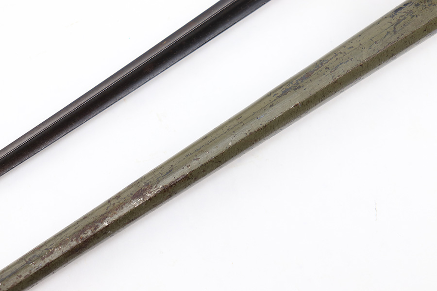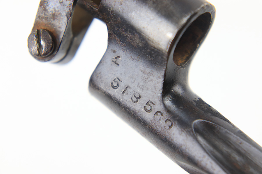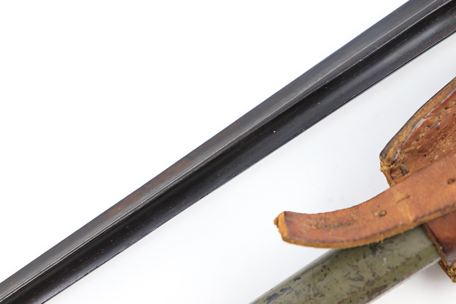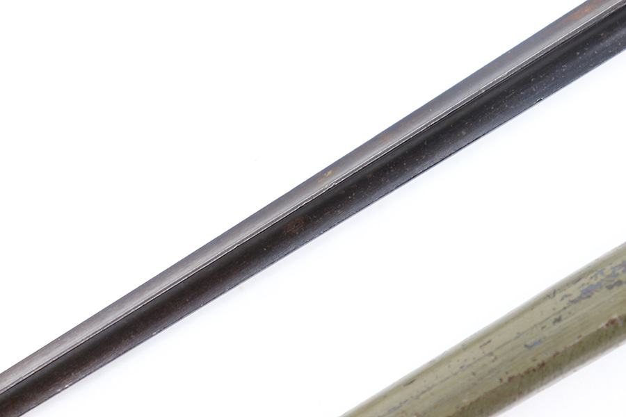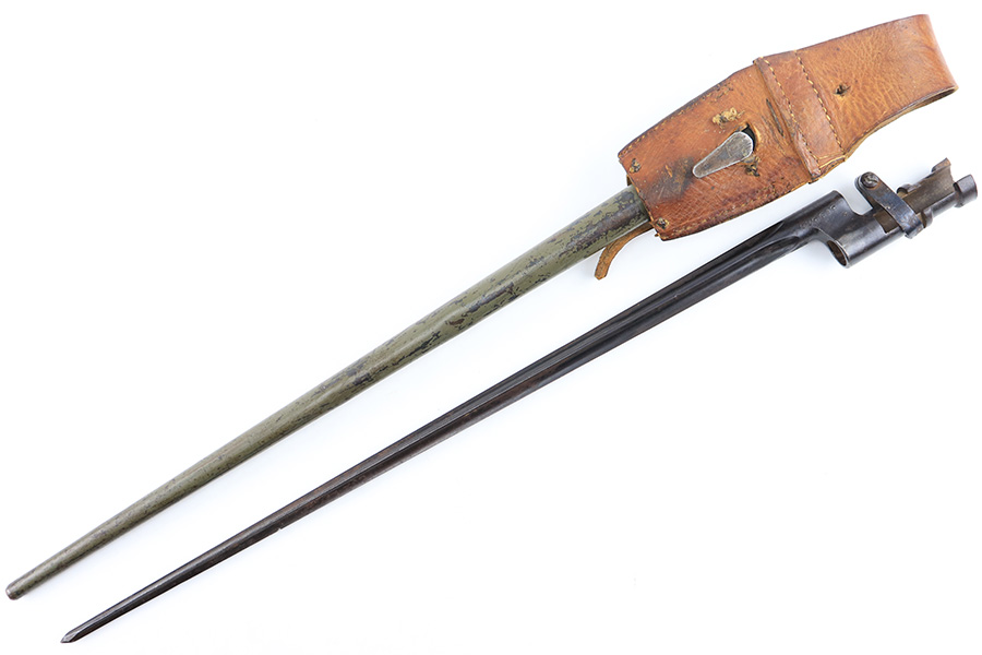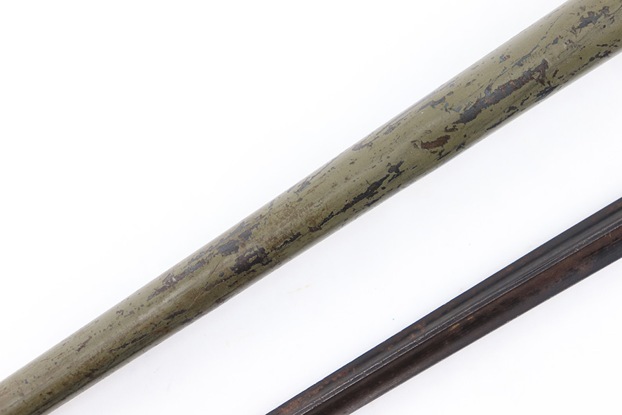 8/18/23 – This is an original WW2 Mosin-Nagant spike bayonet that was captured by the German military. This is indicated by the metal scabbard and leather frog that has an olive green paint. This style scabbard was made and used by the Germans during WW2. The bayonet is in great overall condition with some dark surface patina throughout. The scabbard has light surface wear and typical signs of aging and use, but no major issues. A cool piece of WW2 history.