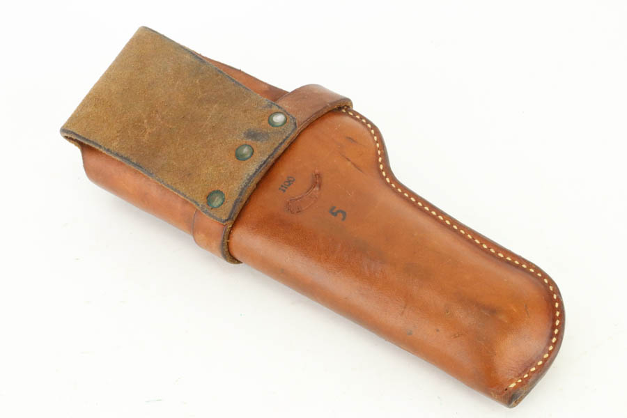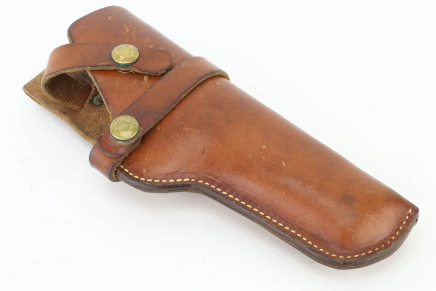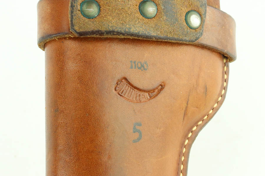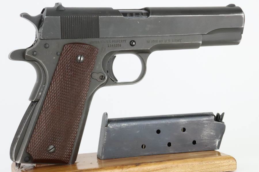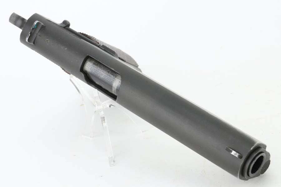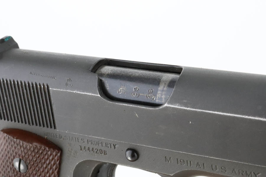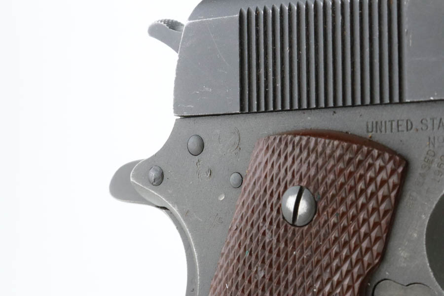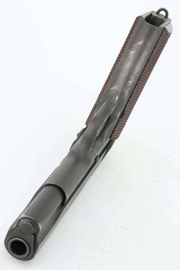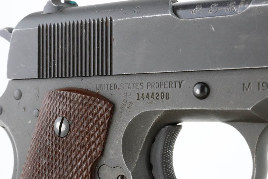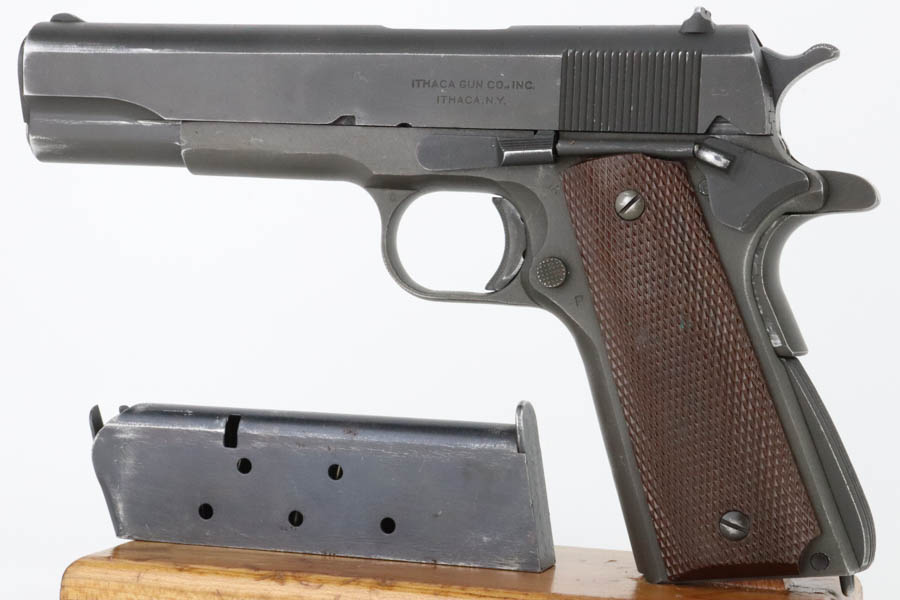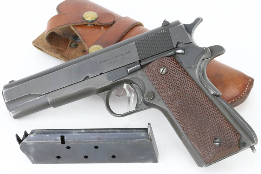 6/13/24 – This is a U.S. Army issued and inspected Ithaca 1911A1 from 1943 that was sent to Britain as part of the lend-lease program. It has the proper U.S. military inspectors marks, and British proofs are visible on the right rear of the frame and slide, as well as the barrel. Proper HS barrel. It has retained about 94-95% of its parkerized finish. The majority of the finish loss is on the front strap, so the profile views are minty. Fitted with very nice period-correct reddish bakelite grips and comes with one magazine. Also comes with post-war holster. Minty bore.