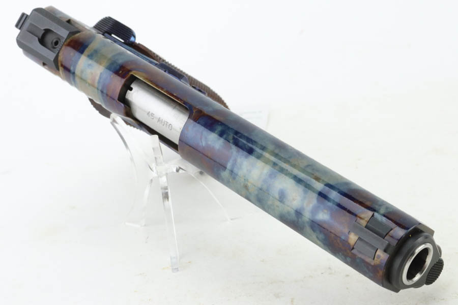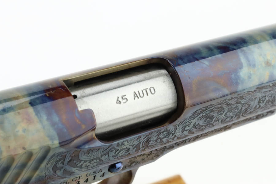07/24/2024 – This is a gorgeous example of a 1911A1 made by Standard Manufacturing with a case-colored finish applied. The frame, slide, safety, and slide release have a floral pattern engraved throughout. The slide stop, trigger, safety lock plunger, safety, and magazine release button have a bright fire-blued finish. The pistol comes with its original factory matching back with a silicone cleaning cloth, a pistol cover, the manual, and a spare magazine.