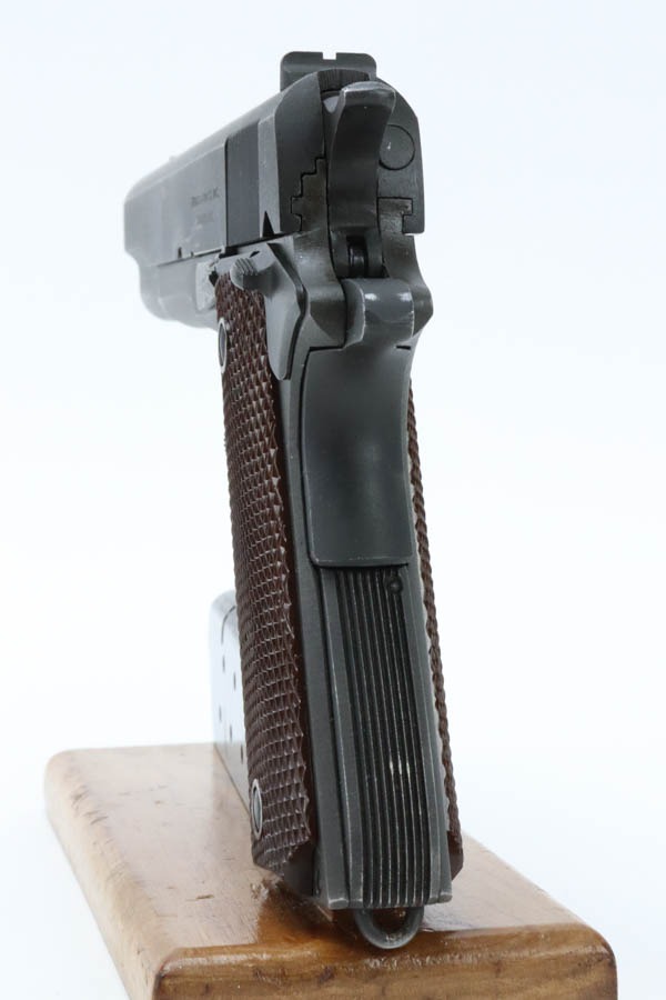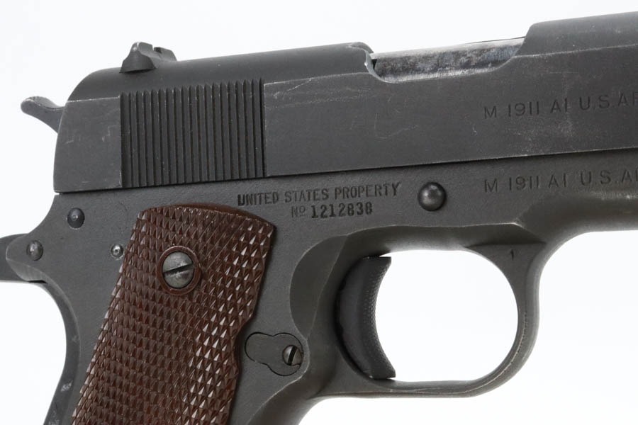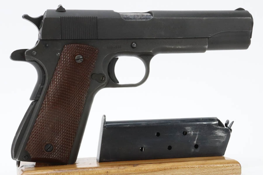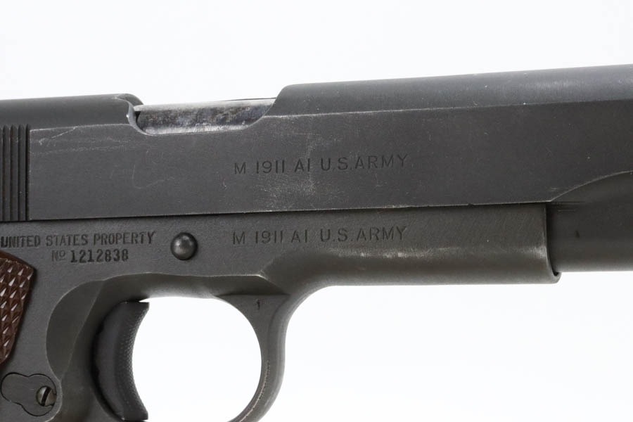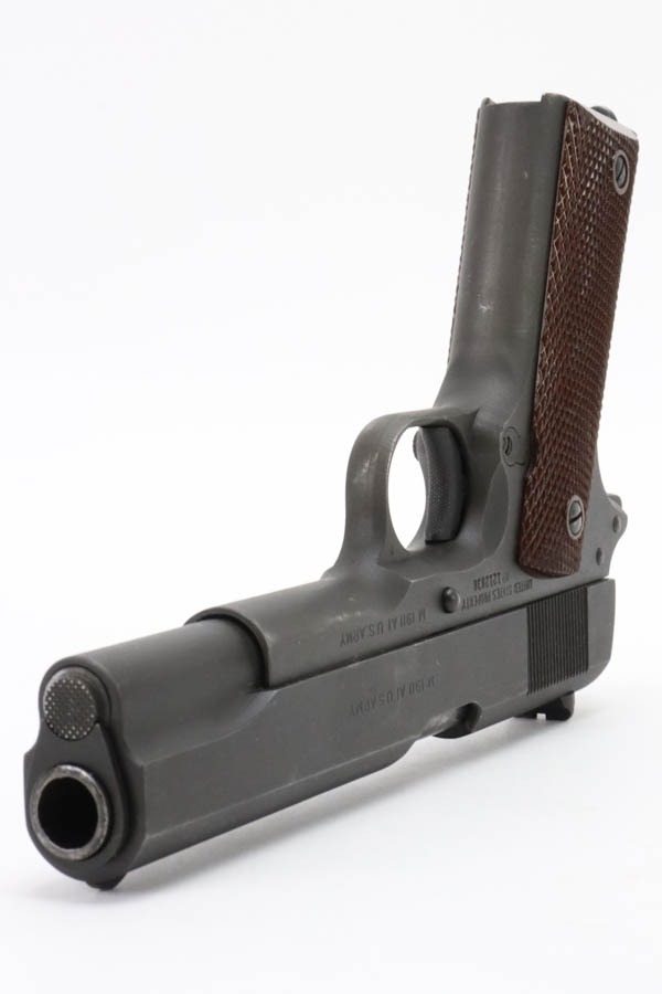 12/3/24 – This is a minty example of a rare variation of the Ithaca Model 1911A1 from 1943. This one is stamped “M 1911 A1 US Army” on the right side of both the slide and frame. There are also matching flaming bomb ordnance inspection stamps on the inside of the frame and on the slide (under the firing pin retainer), indicating this gun is an original and correct example of this rare variation. Proper “HS” High Standard barrel. It has retained nearly all of its original finish with just hints of high edge wear and a few very light surface scuffs here and there. Fitted with correct reddish plastic grips and comes with one “S” marked magazine. Minty bore.