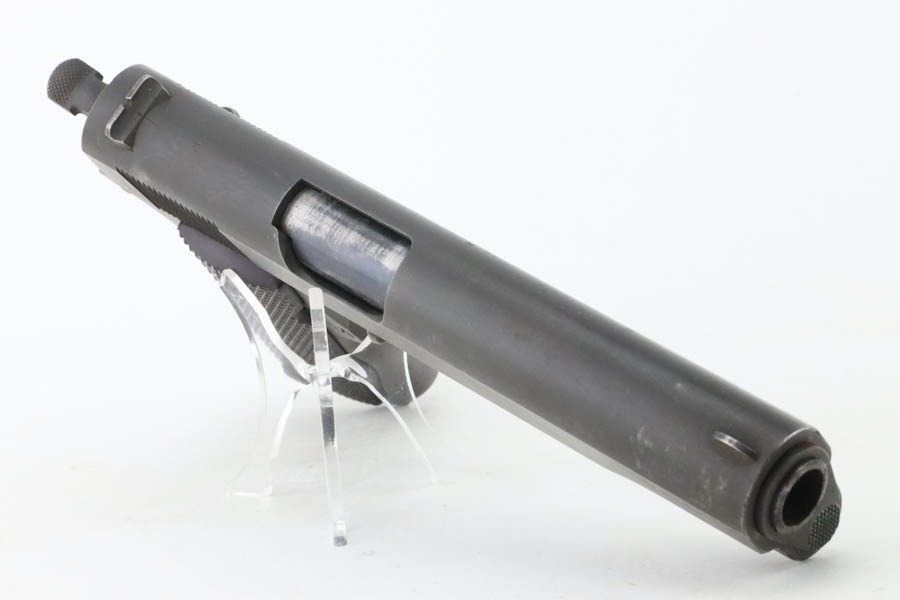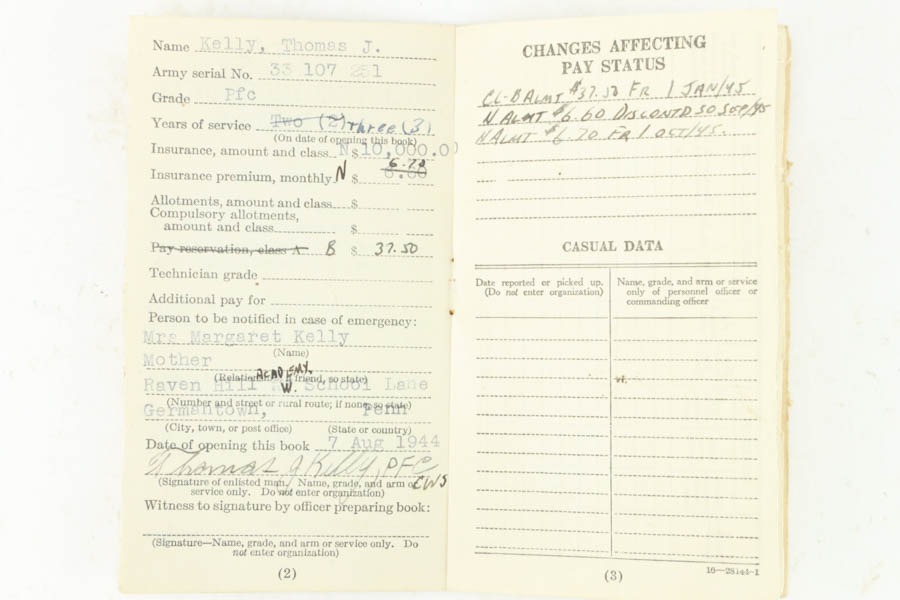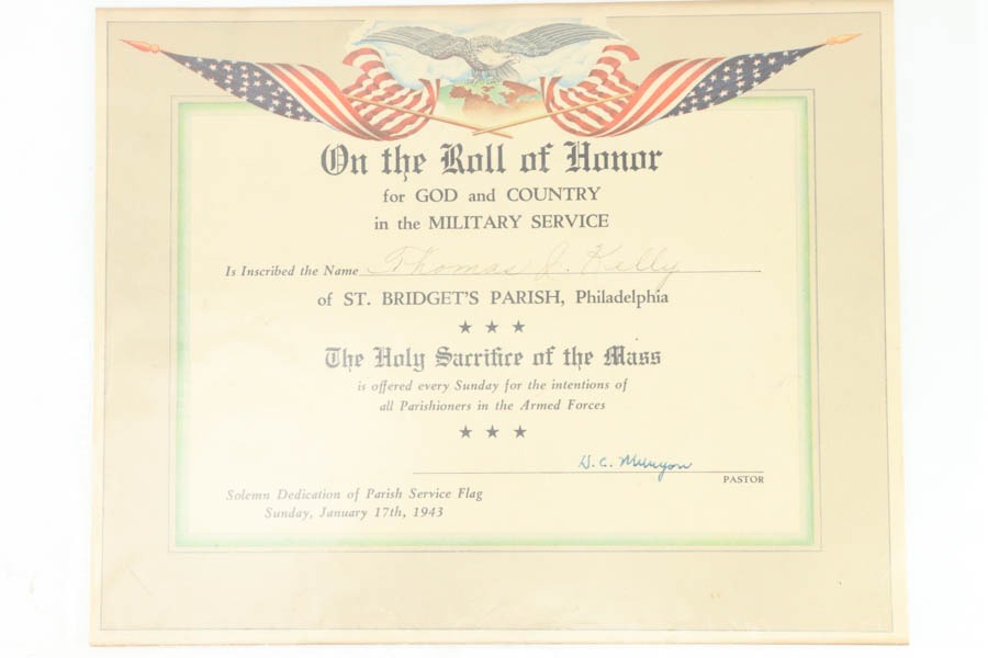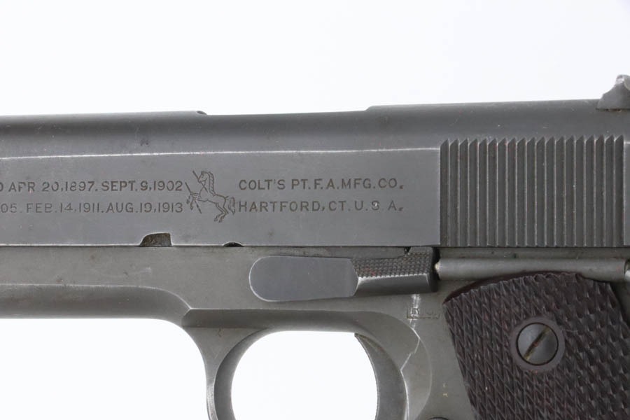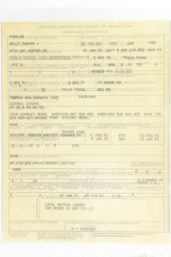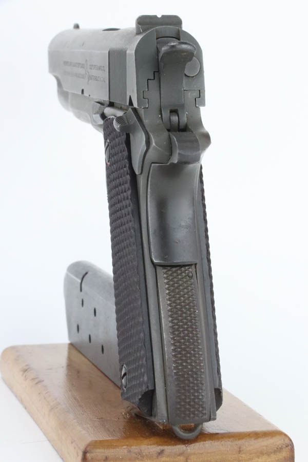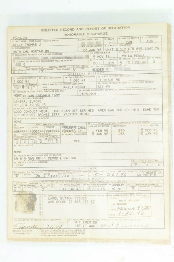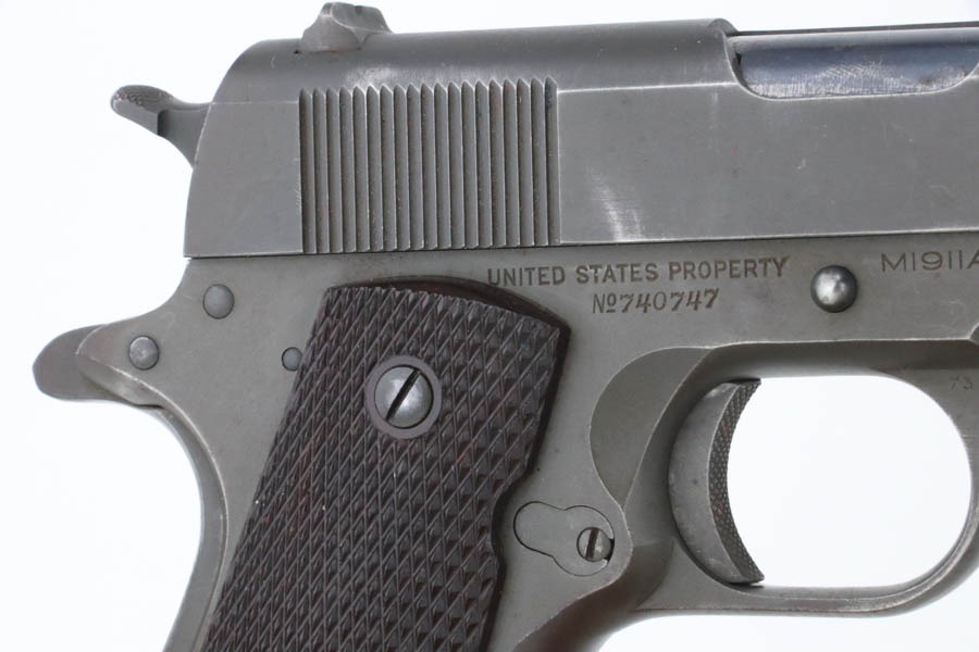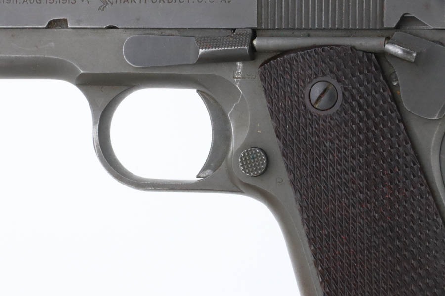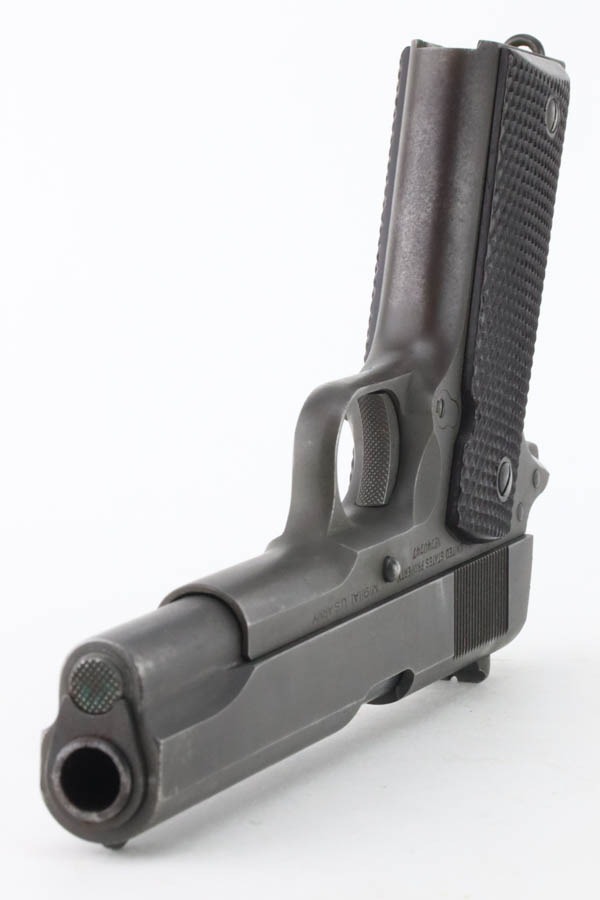 11/15/24 – This is an excellent example of a hard-to-find Colt M1911A1, manufactured in 1941 with proper RS inspectors mark. There were only ~35,000 Colt 1911’s produced that year, which is a very low production number for Colt 1911’s in general. The RS – Robert Sears inspector proof is very rare and desirable for Colt collectors. This pistol is all correct with proper markings and matching numbered slide. Colt barrel with a small “G” under the lug. The gun’s original finish rates about 94% with minor high edge wear with some thinning and spotty brown patina on the front strap. The bore has good rifling with very light pin-pricking throughout. This particular gun comes to us with a bunch of veteran records and docs attributed to a Thomas J. Kelly. Thomas enlisted on December 3, 1941 and served with the 44th Infantry Division in Chemical Mortar Unit in France, Germany, and Austria, as a mortar gun crewman. While there is nothing officially tying this gun to Thomas, the consignor told us he acquired this from the family. Included in the assembly is an original photo of Thomas, an official War-Navy Departments “Official Records” envelope, a Soldier’s Individual Pay Record Booklet, a US Army Separation Qualification Record, Honorable Discharge paperwork, a letter from the White House, and a certificate for a dedication of a parish service flag on St. Bridgets Parish in Philadelphia on Sunday, January 17, 1943.