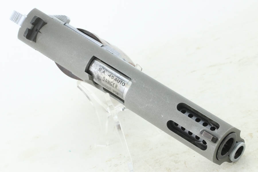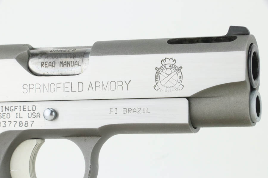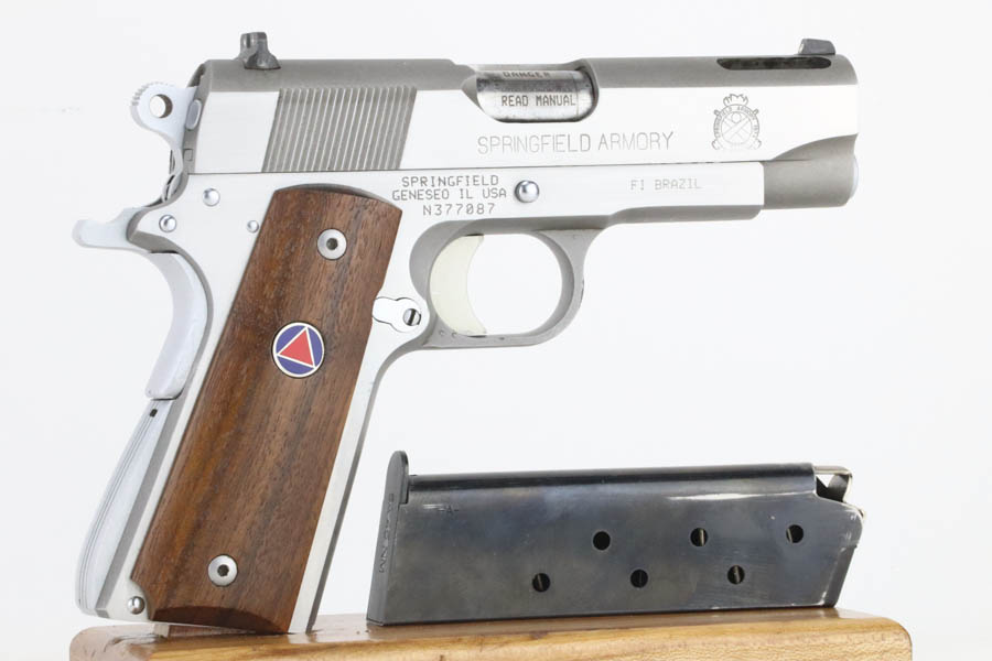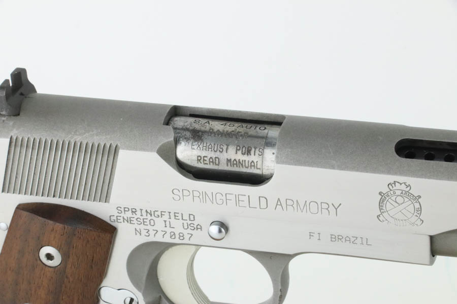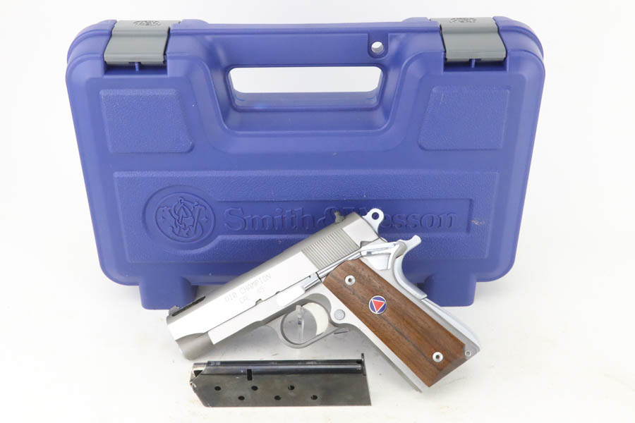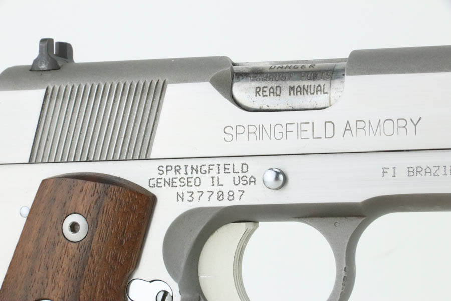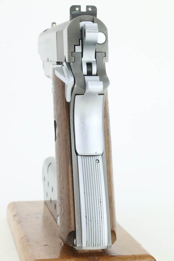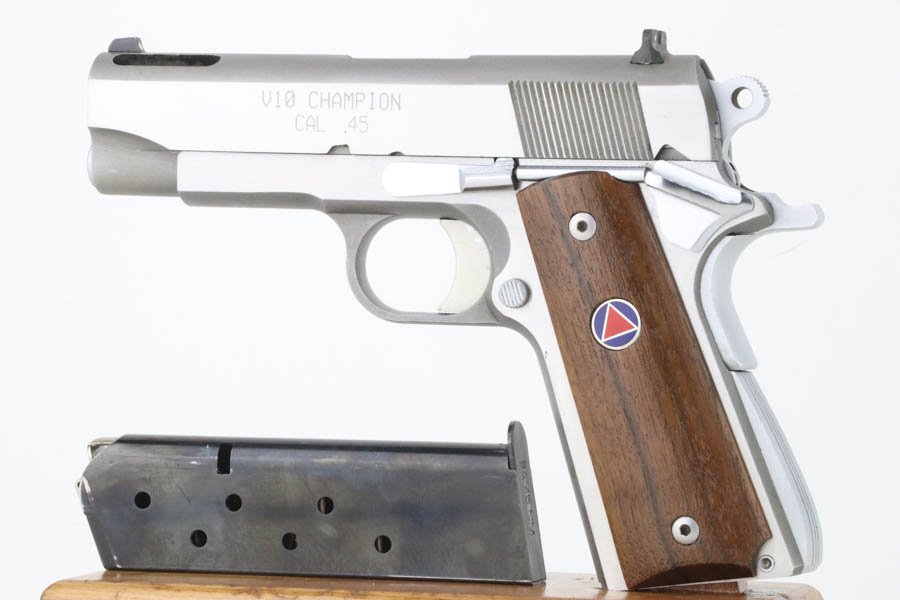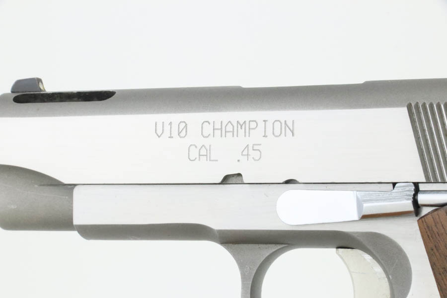 07/29/2024 – For sale is a Springfield V10 Champion compact 1911 chambered in .45 ACP. This pistol is in a polished stainless finish and is in excellent condition. The barrel has 5 compensator ports on each side towards the muzzle. There is some wear on the front of the grip. The wood grip panels are in excellent condition and have a Colt Delta Elite medallion on each side. The bore is bright with great rifling. The pistol comes in a S&W hardcase.