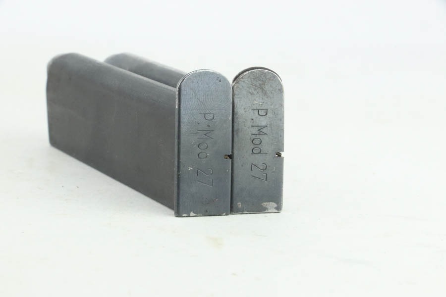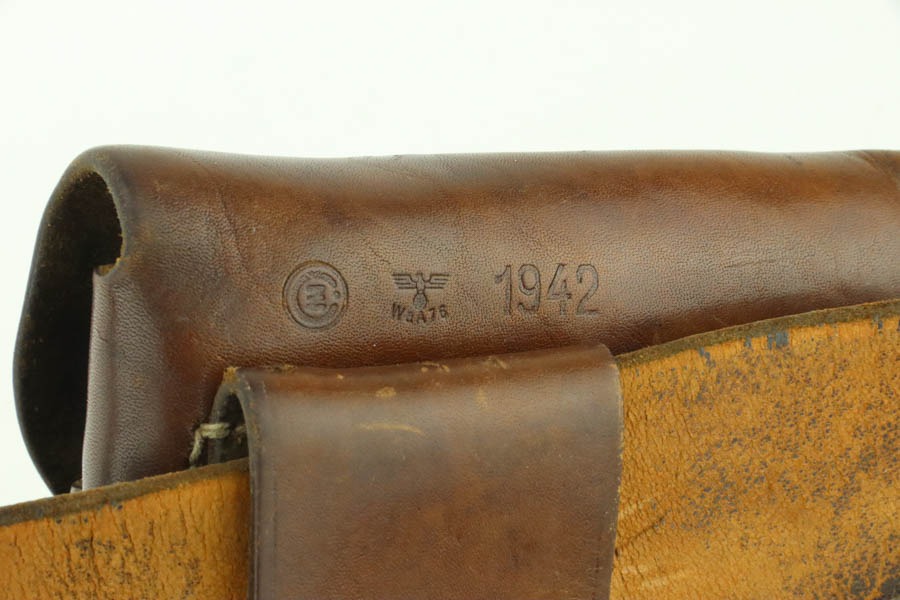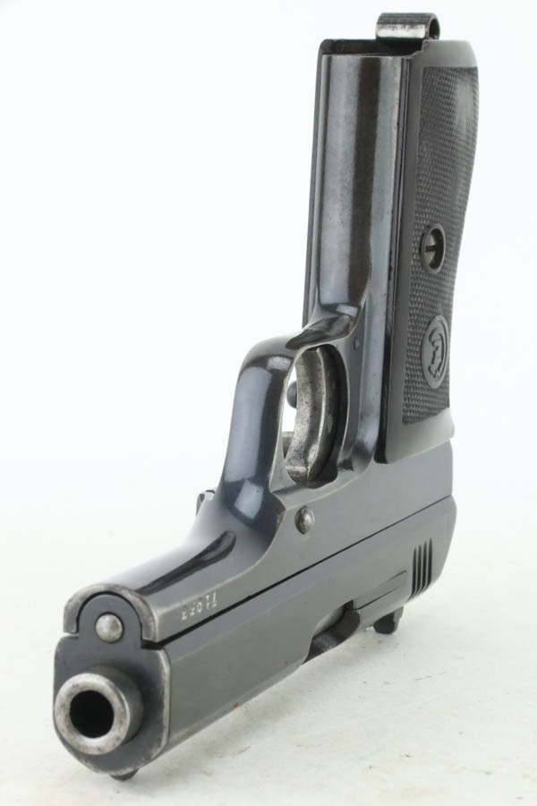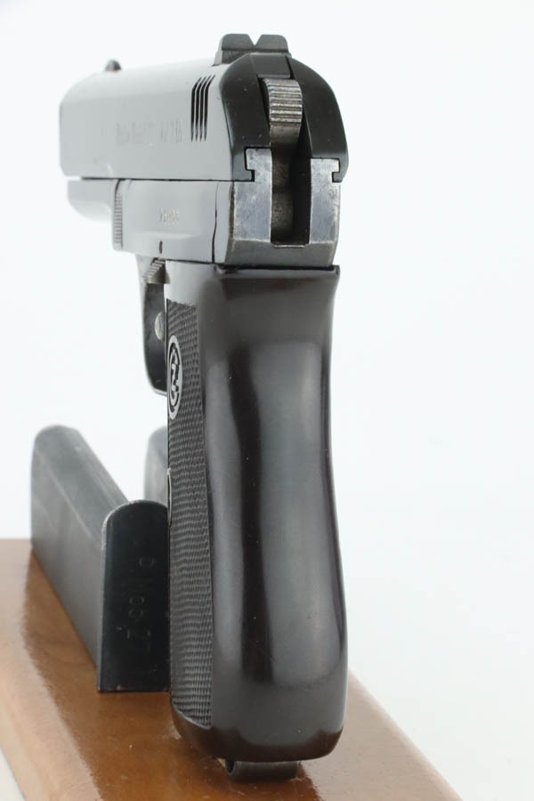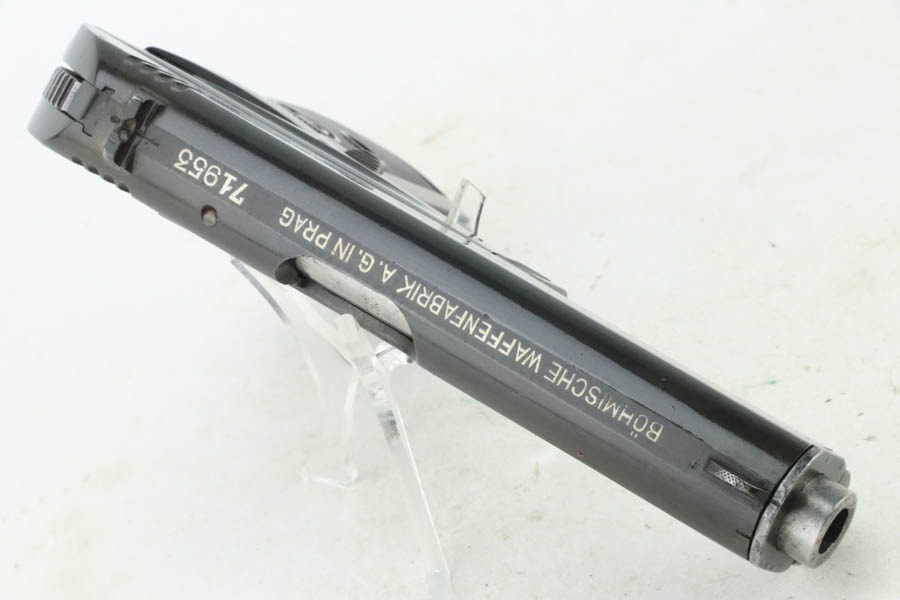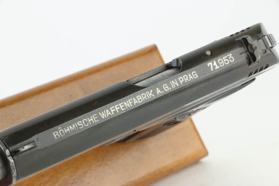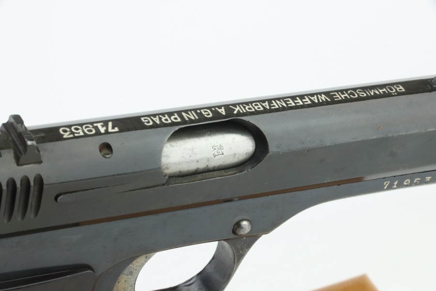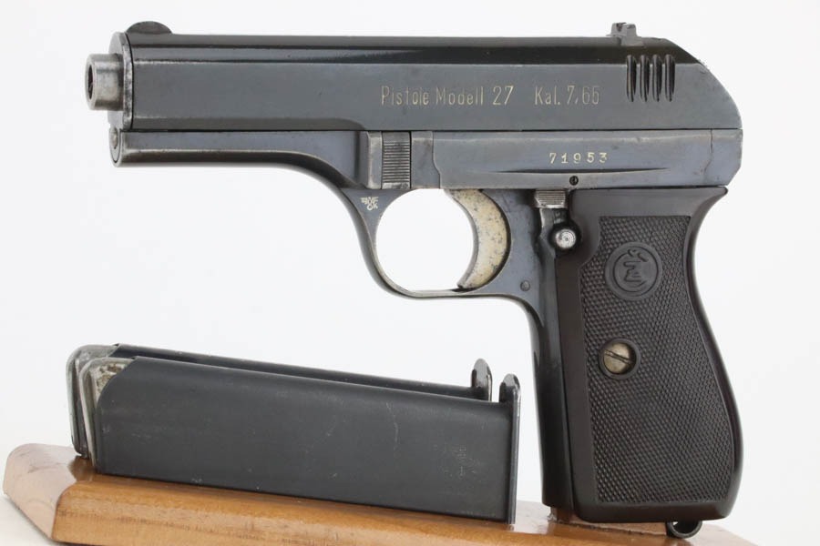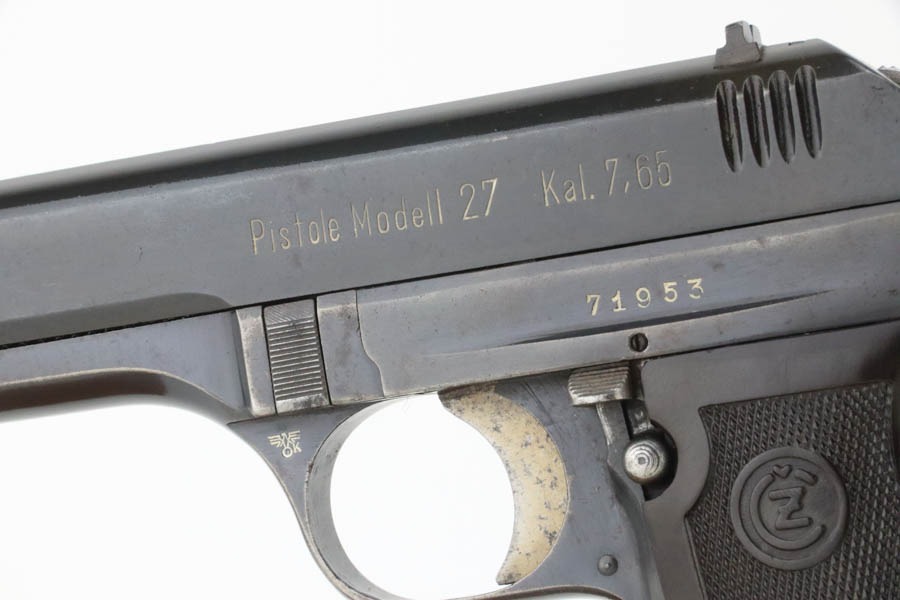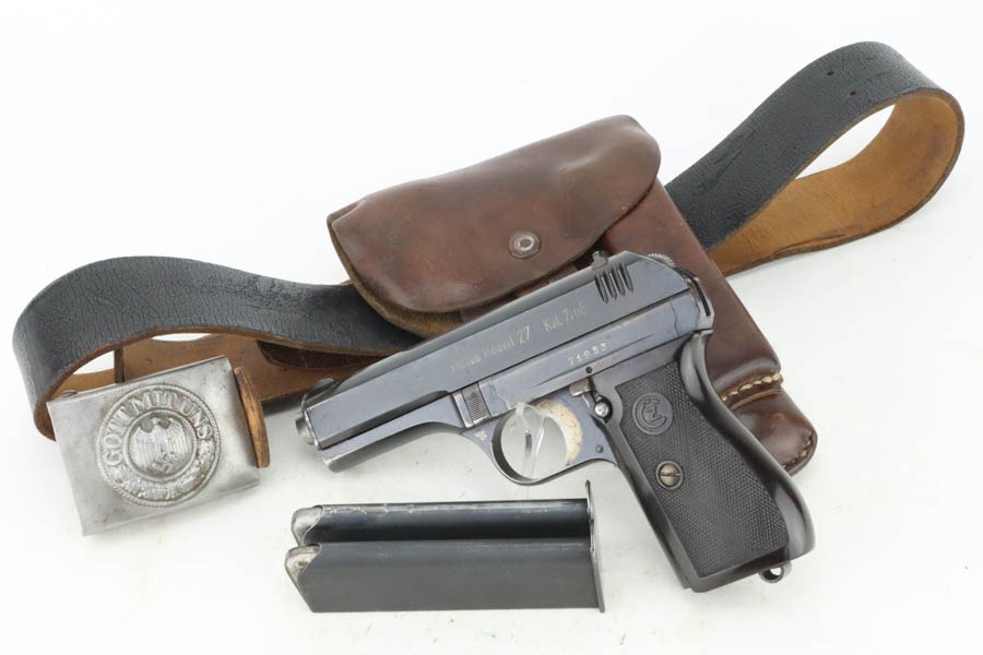 9/23/24 – This is a very nice example of a CZ 27 that was issued to the Nazi police force during WW2. This one has a scarce “Eagle K” marking. This variation is scarce as only about 5,500 of these guns were produced. It comes as a rig with two period-correct magazines, an excellent 1942-dated and waffen-proofed holster, a period-correct black leather belt, and a 1941-dated military “Gott Mit Uns” buckle. The gun has retained about 96% of its original bluing. While there isn’t a ton of finish loss, there is some light pin-pricking on the slide and some small dots of discoloration and oxidation here and there. Fitted with a nice period-correct bakelite grip – small chips in each of the corners. Mint bore.