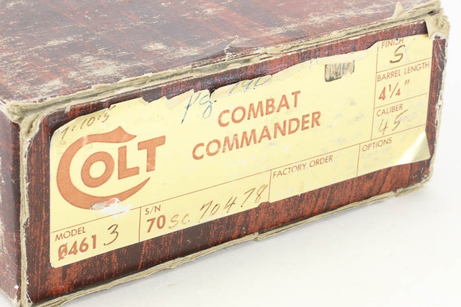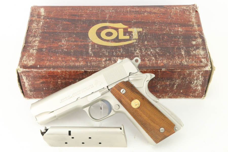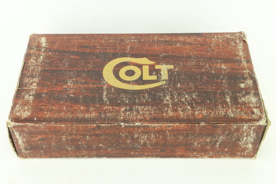 10/14/24 – This is a minty Colt Combat Commander in the original, matching box. Made in 1979, it has the desirable factory satin nickel finish. There is very little sign of wear – just some very light surface scratches and scuffs here and there. Mint bore and excellent wood grips. Has the Styrofoam insert and owners manual.