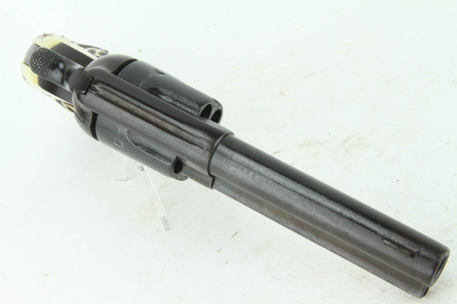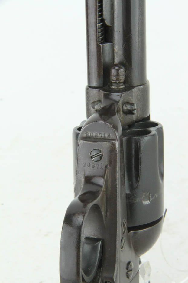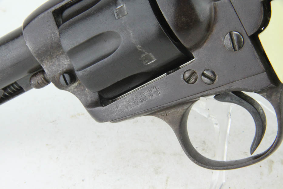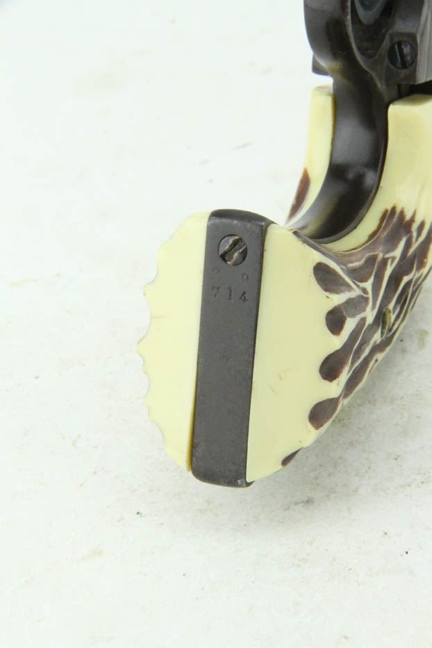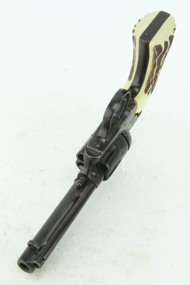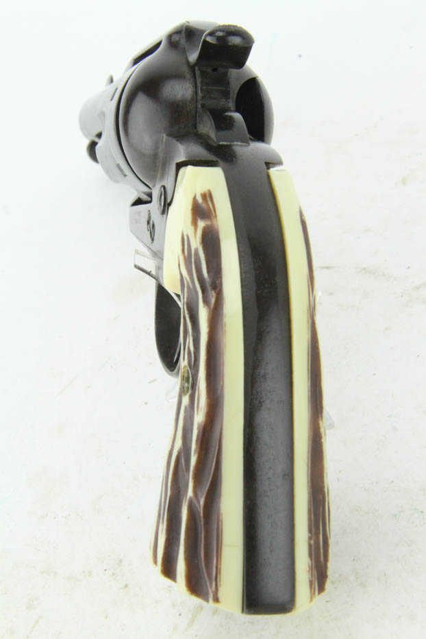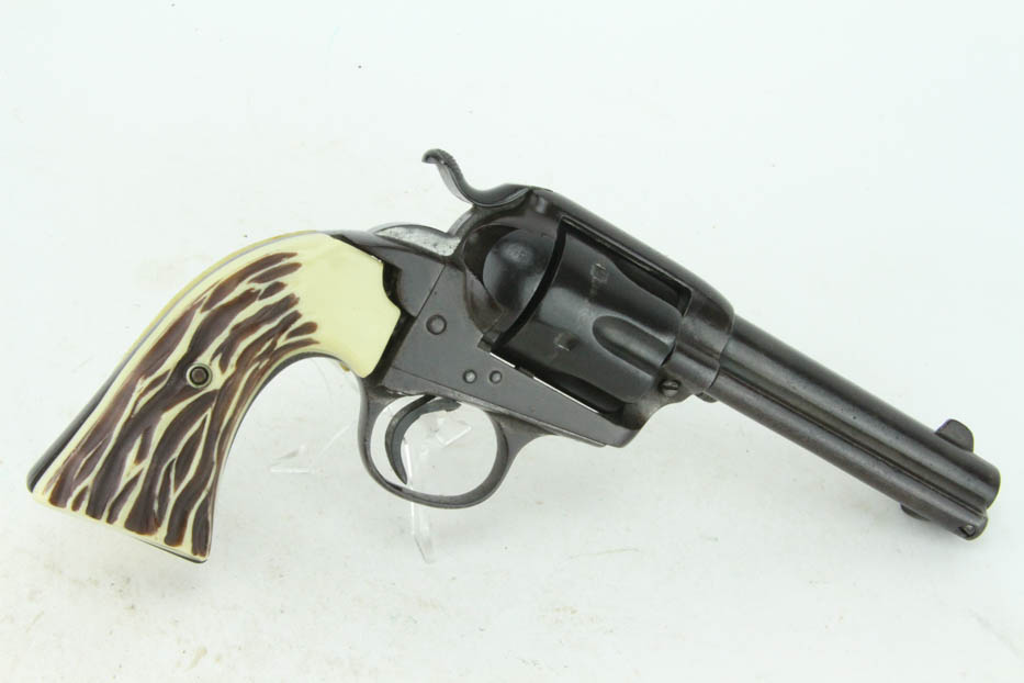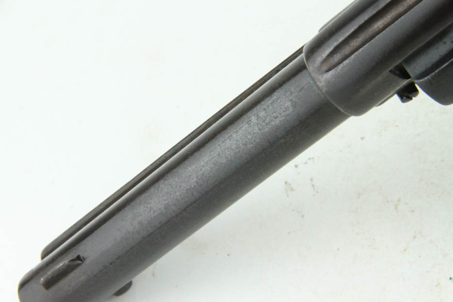 8/14/24 – This is a Colt Bisley Revolver, manufactured in 1901. It is all matching. The caliber designation on the left side of the barrel has completely worn away, but we believe it is chambered in .41 Colt – the inner diameter of the muzzle measures 0.4″. If it is in fact .41 Colt, it would be rare. Only 3,159 out of 44,350 Bisley revolvers were chambered in .41 Colt. Overall, the gun is in fair condition for its age. While there isn’t a ton of actual finish loss, there is noticeable dark brown “attic patina” covering the metal parts. Fitted with faux antler grips. The bore has pretty good rifling with tiny pitting throughout. Fully functional.