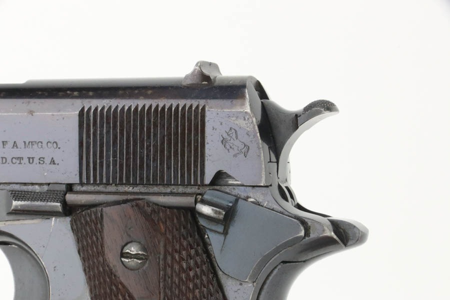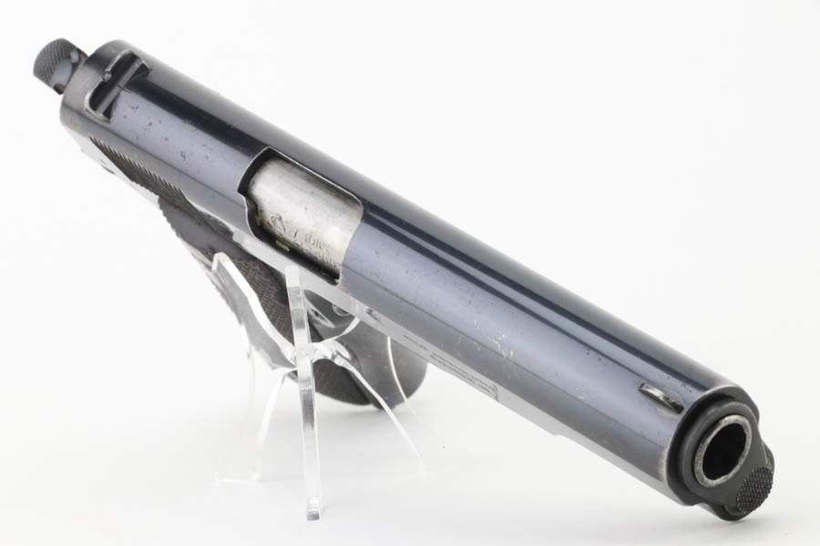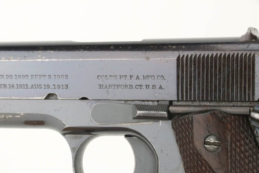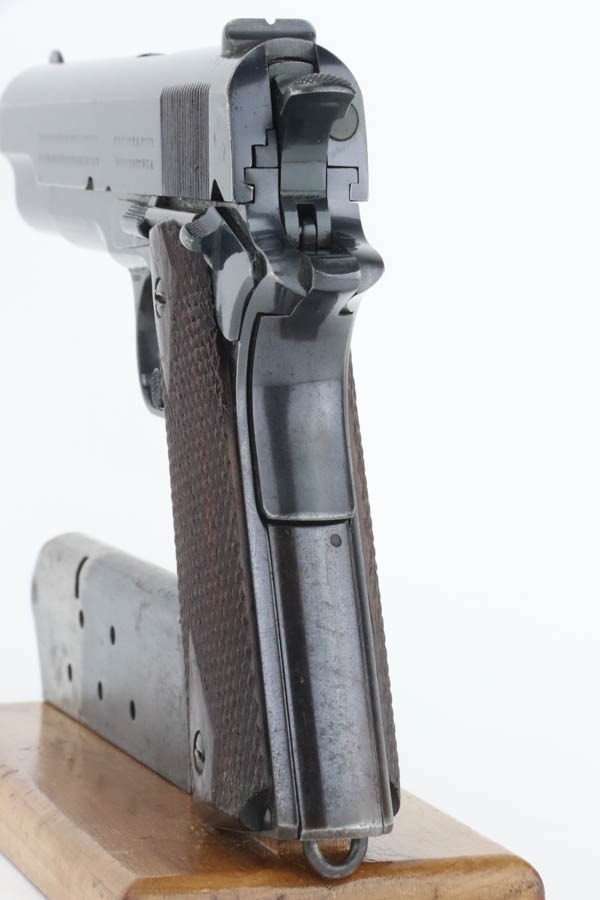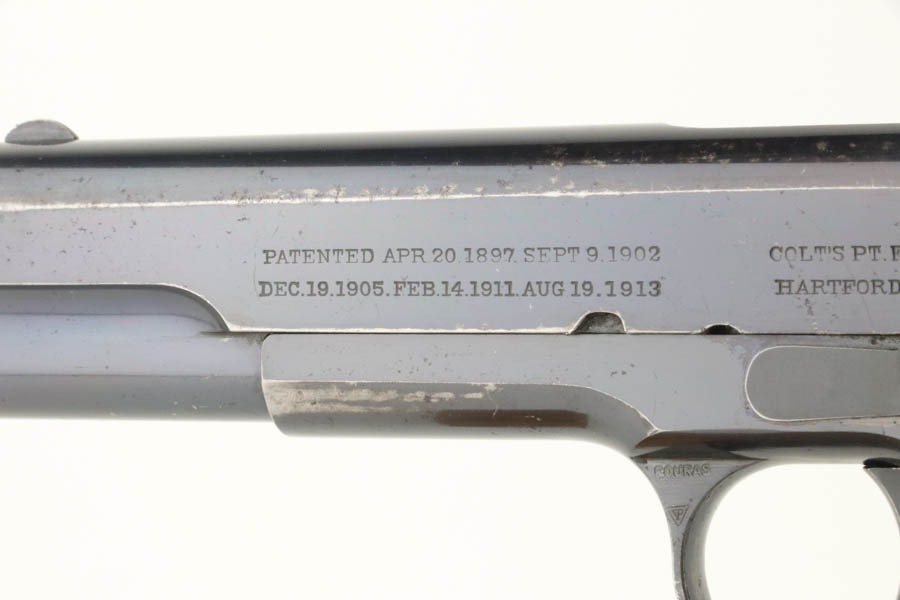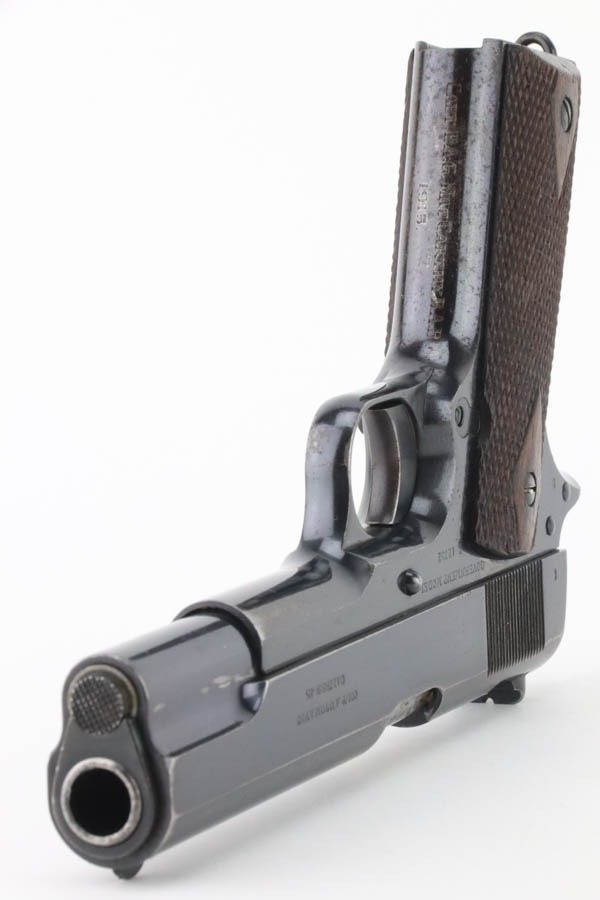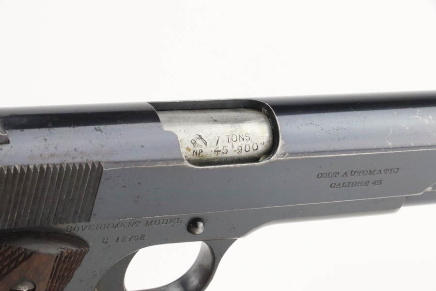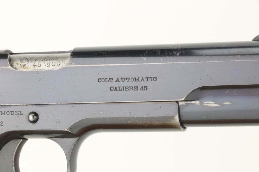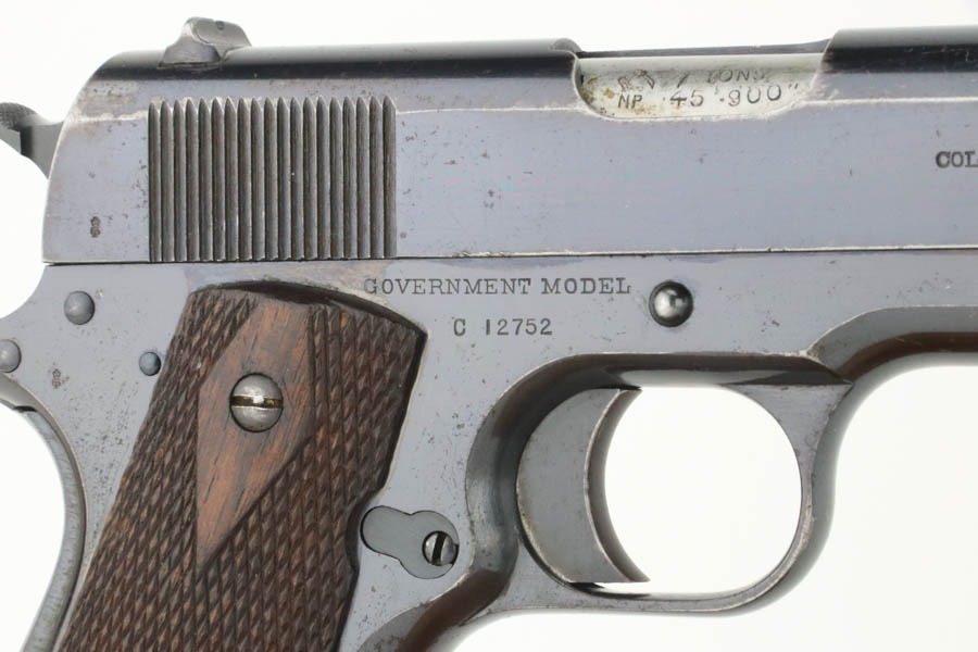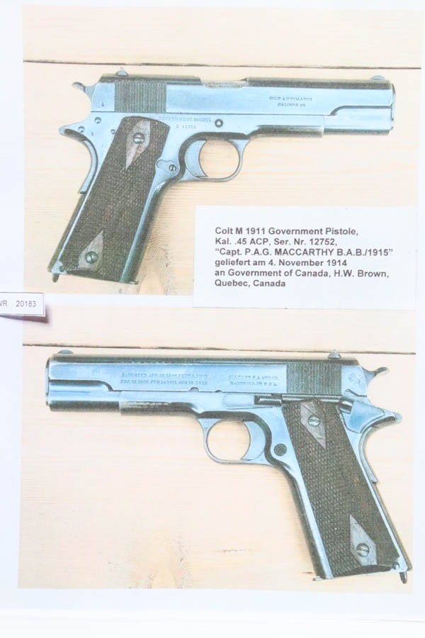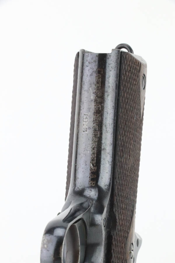 11/22/24 – This is a Colt Government Model that was owned by a notable WWI Captain Plantagenet Archibald Gardiner MacCarthy, who led one of Canada’s earliest mechanized units, the Borden’s Motor Machine Gun Battery as its commanding officer from 1915 to 1917. This unit was integral to the early adoption of motorized warfare by the Canadian military, leveraging mobility to provide rapid machine-gun support during engagements. The pistol is inscribed with “Capt. P.A.G. Maccarthy B.A.B./1915” on the front strap. The gun itself is has retained about 85% of its gorgeous mirror blue finish. There is finish loss present along the high edges, around the muzzle, and in two areas of the frame where slide inserts. Small spots of wear throughout the top left side of the slide, and to a much lesser extent, along the top right. Significant thinning and patina on the front strap, and mild thinning and oxidation on the backstrap, and micro scratching throughout. Bore is shiny with strong rifling, but there is frosting in the grooves. Grips are excellent, with sharp checkering and no chips or cracks.